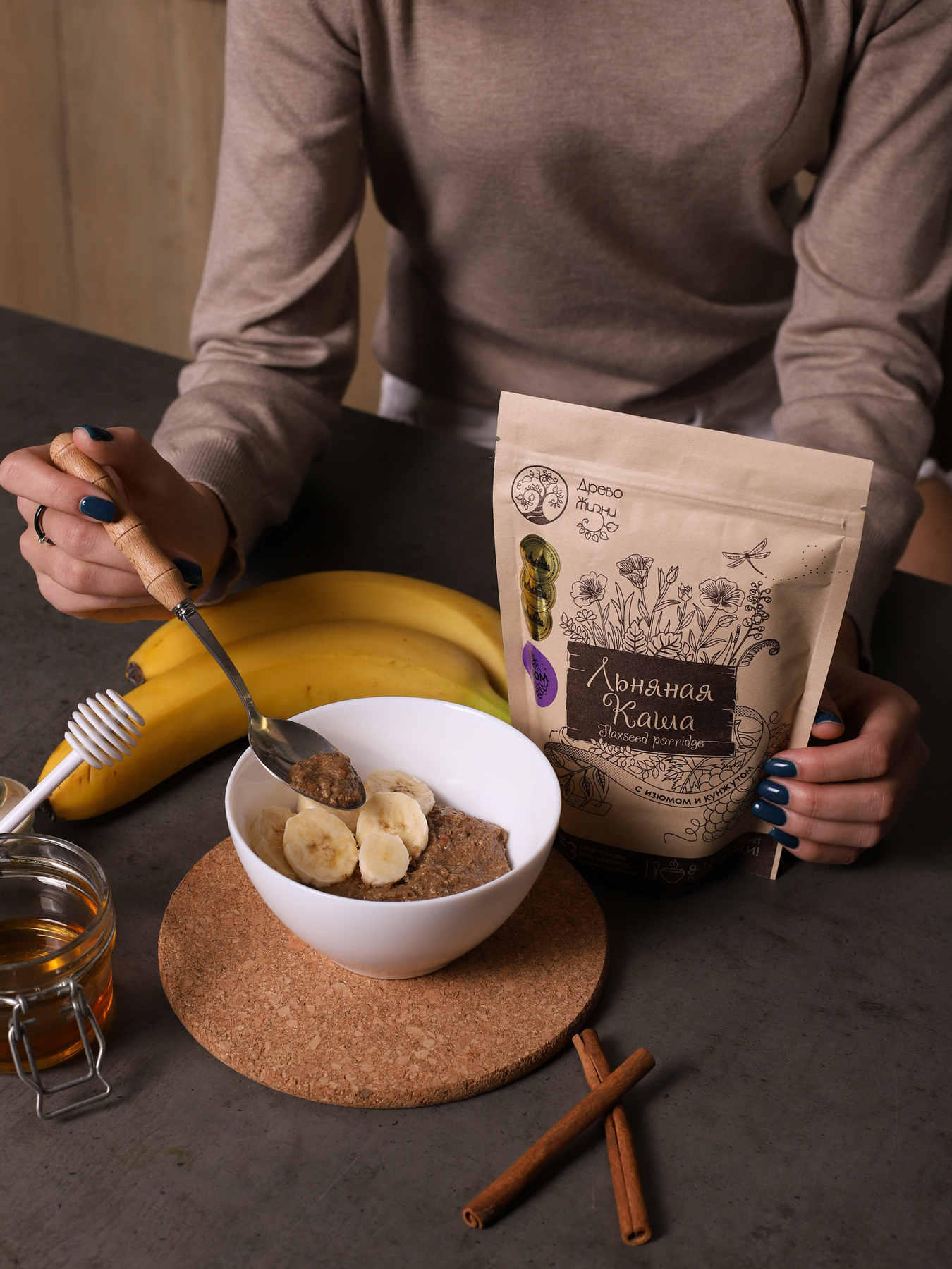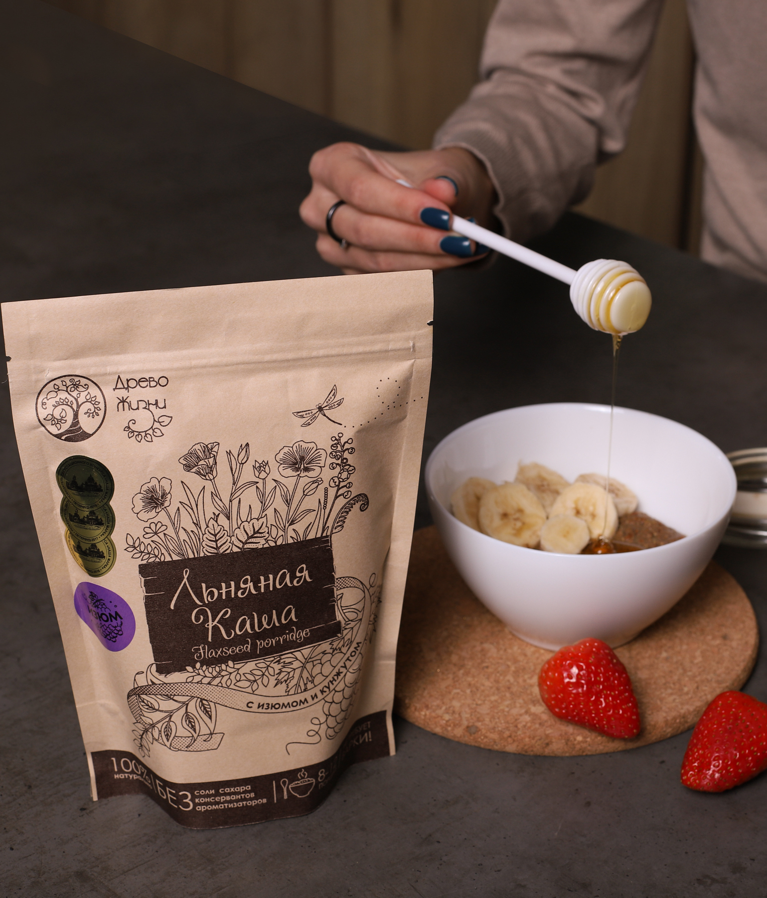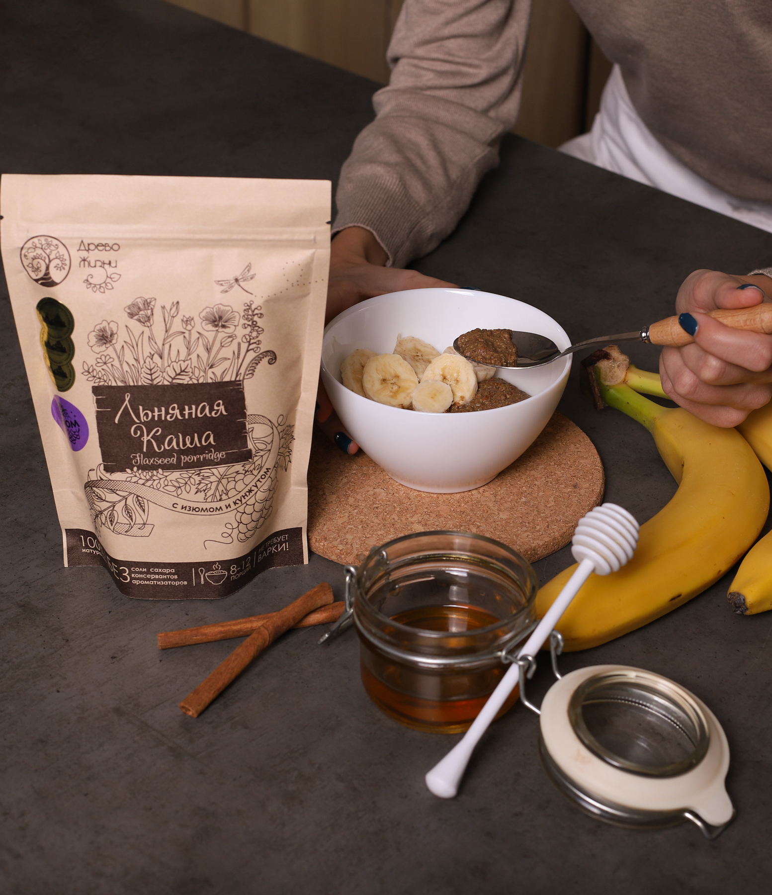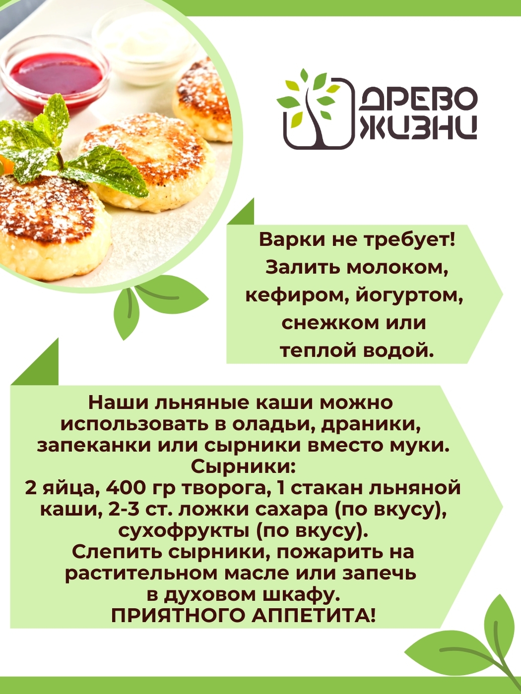 Описание: Наша льняная каша с изюмом и кунжутом богата содержанием витаминов группы В, С и А, калия, хрома, кремния, бора, селена, железа, цинка, меди, натрия, марганца, кальция, и фосфора. Сочетание изюма и кунжута традиционно используется для похудения и поддержания организма в тонусе, в пост. А в зелёной гречке содержится большое количество антиоксидантов, которые повышают иммунитет и тормозят процессы старения. В меру сладкий изюм естественной сушки, перемолотое льняное семя, зеленая гречка и кунжут - в составе ничего лишнего. Льняная каша из тёмного льна готовится без отжима масла — льняное семя перемалывается по авторской рецептуре. Благодаря этому оно приятнее на вкус и содержит намного больше очень нужных организму полиненасыщенных жирных кислот и витаминов, чем каши из льняной муки. Эту кашу не нужно варить, ее достаточно просто залить тёплой водой или кефиром — и быстрый и здоровый завтрак готов! Также кашу можно добавлять в оладьи и драники вместо муки и использовать её как панировку для сладостей или сырников.   Все наши полезные льняные каши производятся без добавления сахара, соли, консервантов, красителей и ароматизаторов. Семена льна, а значит и наша каша быстрого приготовления, не содержат глютен. Подходят для вегетарианцев, веганов, диабетиков, для людей на диете, любителей правильного здорового питания, для взрослых и для детей.  Способ приготовления: залить сухую льняную кашу теплым молоком, водой, соком или йогуртом. При желании можно добавить немного масла, фруктов или орехов. Вкусная полезная каша готова! Приятного аппетита!