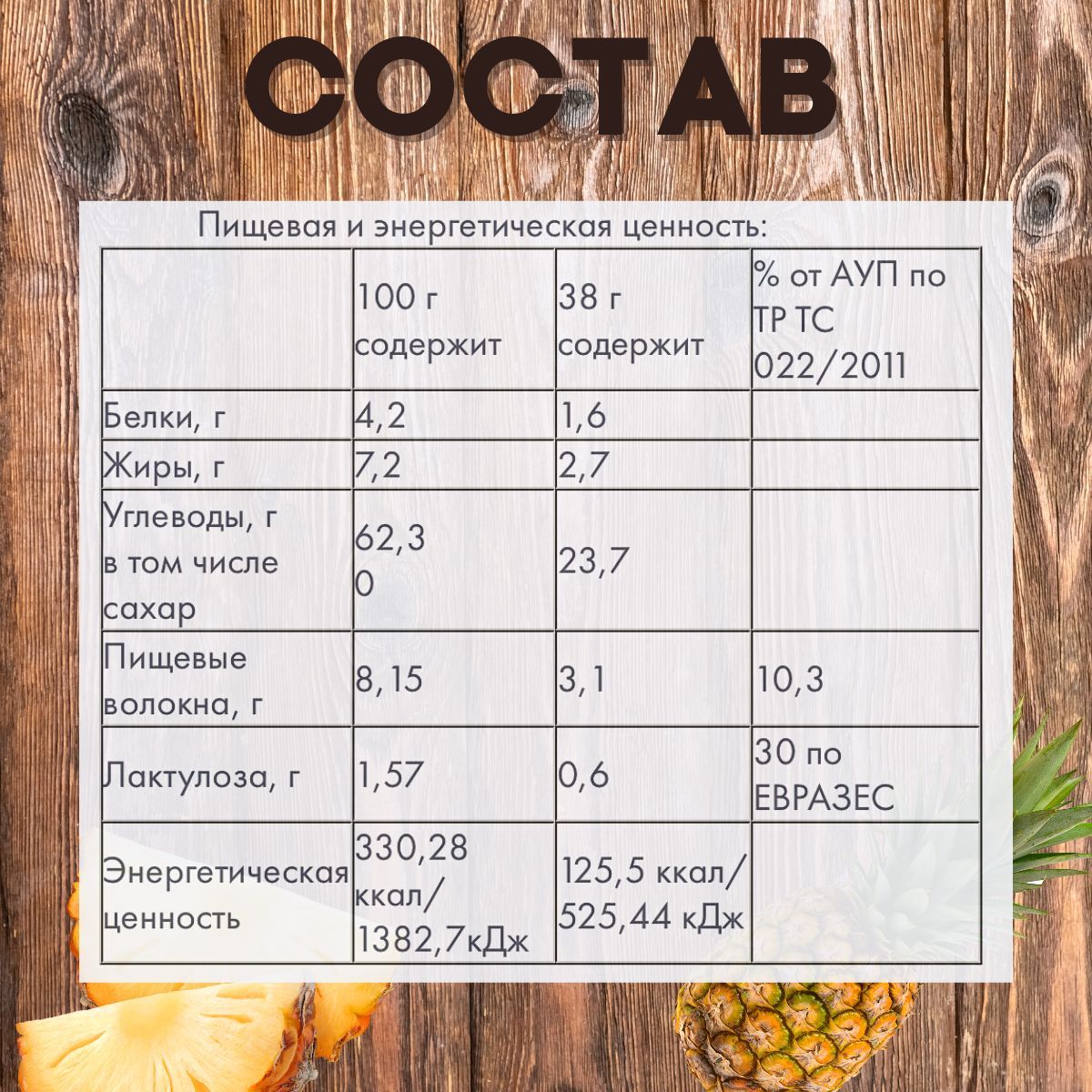 Хлопья ржаные, сливки растительного происхождения, хлопья кукурузные, кусочки ананаса сушеные, хлопья пшенные, крахмал картофельный, гуммиарабик Фибрегам В (пищевые волокна), лактулоза сухая п/ф, диоксид кремния (антислеживатель), соль, мальтодекстрин, ароматизатор натуральный «Ананас», сукралоза.