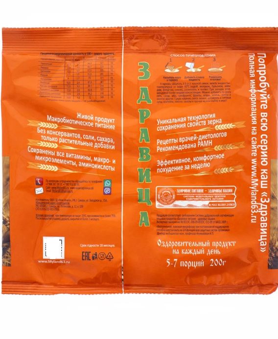Описание: Каши Здравица всегда производятся из цельного зерна (в зерновой оболочке), имеют большое содержание пищевых волокон, содержат максимум витаминов, макро- и микро- элементов, так как в технологическом процессе приготовления продукта применяется кратковременное температурное воздействие (дома так не сварите!); фасуются в обезвоженном состоянии, что позволяет иметь длительный срок хранения без добавления каких-либо химических примесей и консервантов; очищают стенки кишечника, позволяя организму усваивать больше полезных веществ.