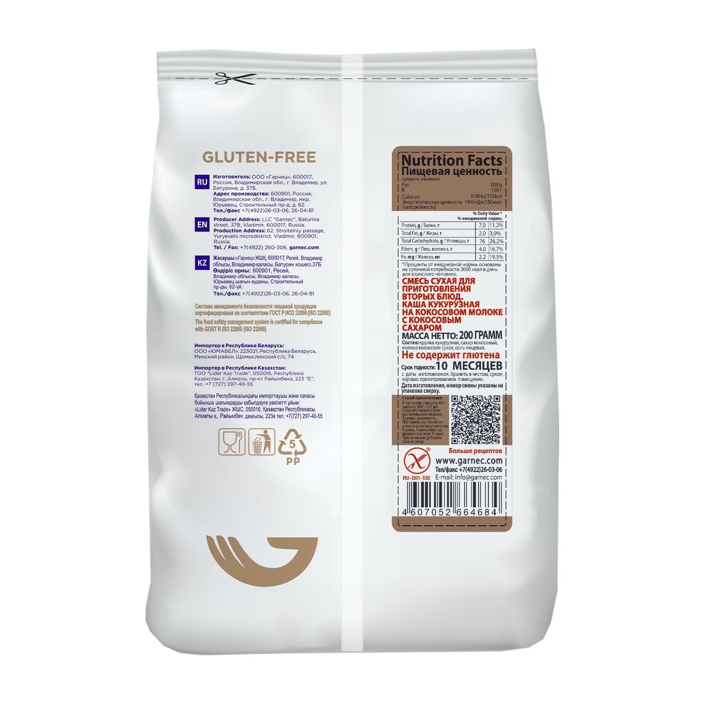 Данный продукт не содержит глютен. Отсутствие глютена проверяется на каждом этапе производства. Компания Гарнец первой в России получила право маркировать свои продукты «Перечеркнутым колосом» - знаком безопасности безглютеновой продукции, признанным в большинстве развитых стран.