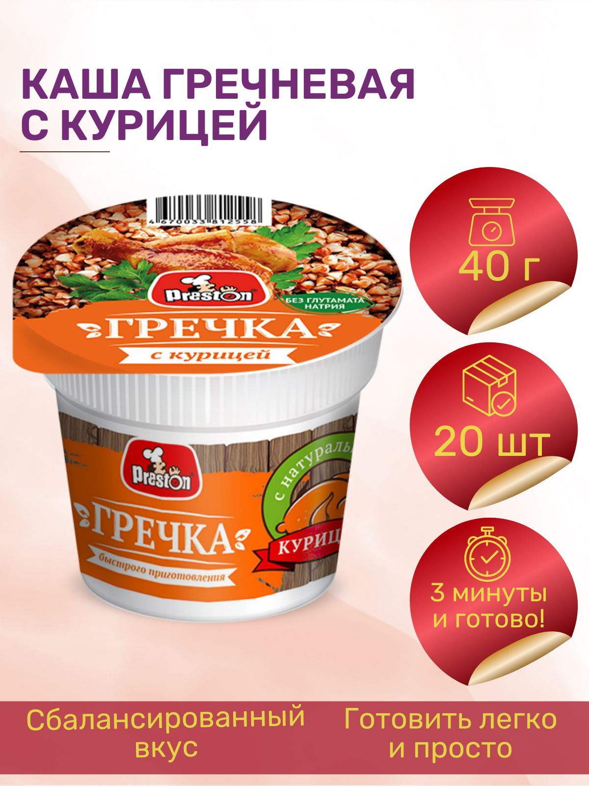 Описание: В наш современный век скоростей дефицитом времени страдает большинство людей. Что делать, когда хочется кушать, а на приготовление пищи нет времени. Вам на помощь приходит повар Preston предлагая вторые блюда, не требующие варки. Попробуйте серию гречневых каш Preston. Гречка издавна на Руси была доступной всем и очень распространенной. Не зря ею кормили солдат. Эта каша богата витаминами В1, В2, В6, РР, минеральными веществами - фосфором, калием, марганцем, кальцием, железом, магнием. К тому же гречневая каша обладает антитоксическими свойствами, способствует выведению из организма избыточного холестерина и ионов тяжелых металлов, снижает риск возникновения сердечнососудистых заболеваний. Не каша, а настоящая мини-аптека, приготовленная для нас природой. Гречка Pr. Preston это готовое второе блюдо 4-х разных вкусов – гречка с грибами, с жареным луком, с курицей, с мясом. Гречка Pr. Preston не требует варки. Pr. Preston – это вкусная, рассыпчатая гречка с добавками на любой вкус. Отличительной особенностью гречки Pr. Preston является то, что она производится не из хлопьев, а именно из целых зерен гречки, которые пропариваются для быстрого приготовления. Такая технология позволяет сохранить все микроэлементы и витамины этой богатой крупы. Дома, на работе, в дороге, на даче содержимое пакетика со вторым блюдом из риса, гречки или пюре достаточно залить кипятком и утолить голод вкусным блюдом. Кашу с грибами и жареным луком можно употреблять вегетарианцам и во время поста. Гречка с курицей Preston быстрого приготовления в стаканах - это высококачественный продукт, приготовленный из гречки, обработанной паром с добавлением натурального мяса, ароматных овощей и приправ. Способ приготовления: 1. Открыть крышку наполовину и залить 140 мл кипятка (до обозначенной линии уровня на внешней части стакана). 2. Тщательно перемешать, закрыть крышку и оставить на 2-3 минуты. 3. Еще раз перемешать. Гречка с мясом готова!