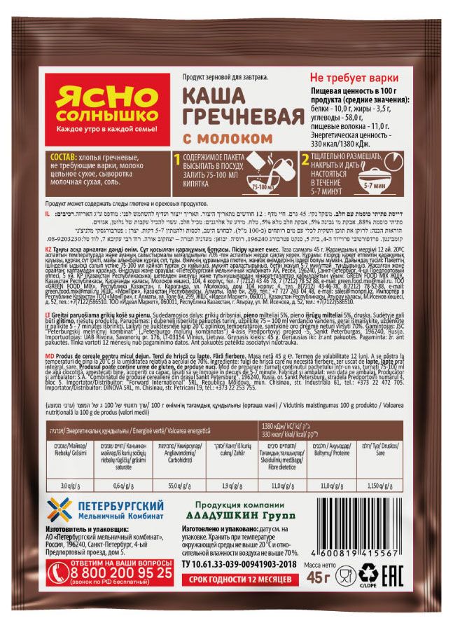 Хлопья гречневые, не требующие варки, молоко цельное сухое, сыворотка молочная сухая, соль