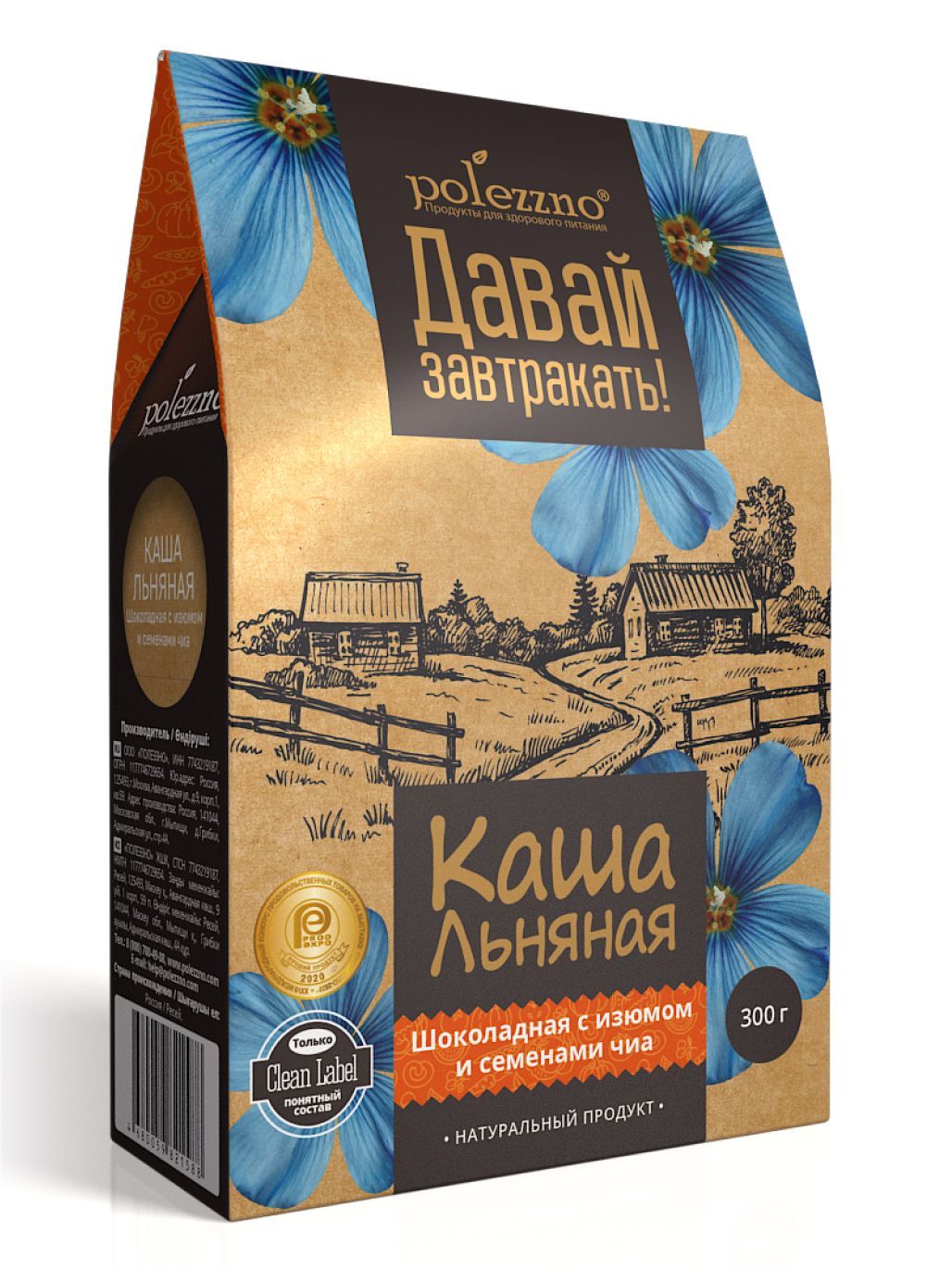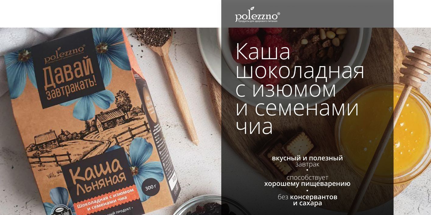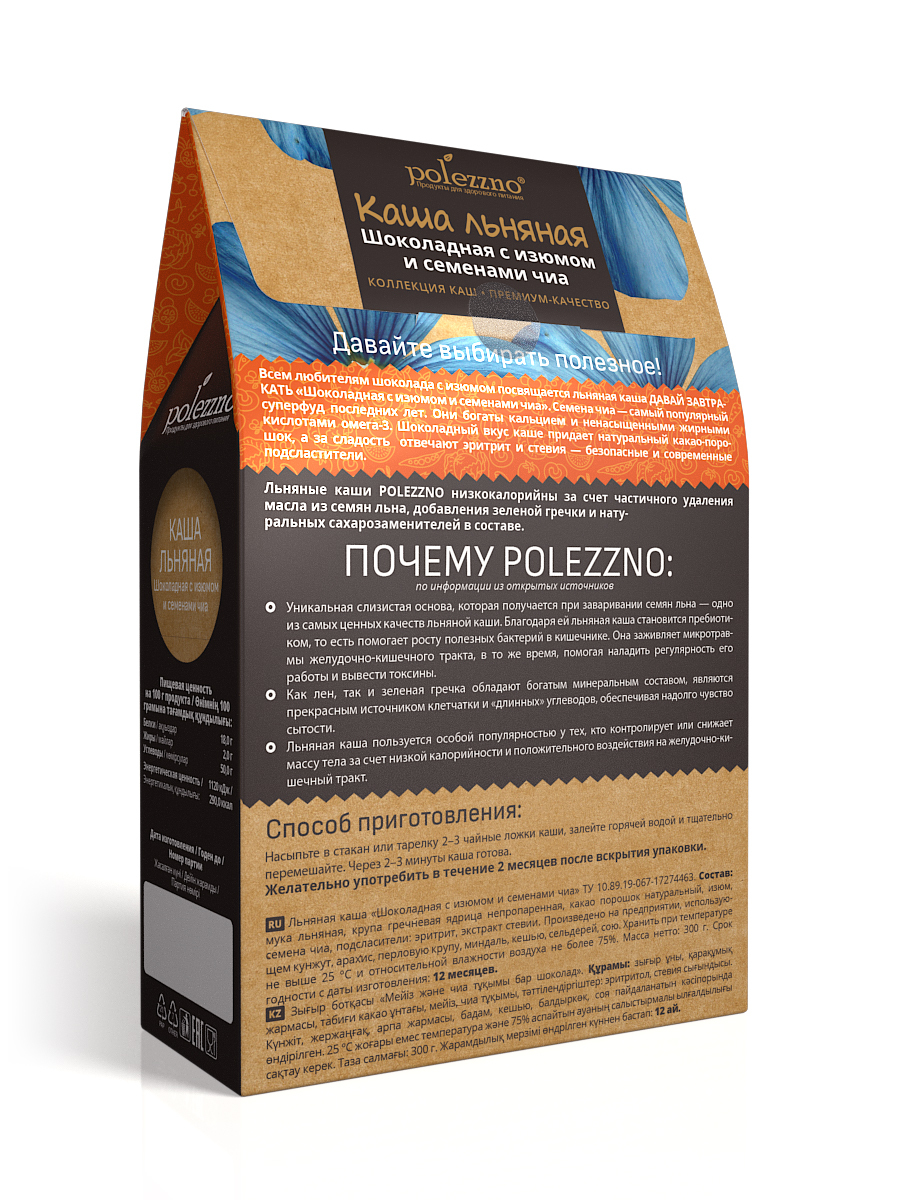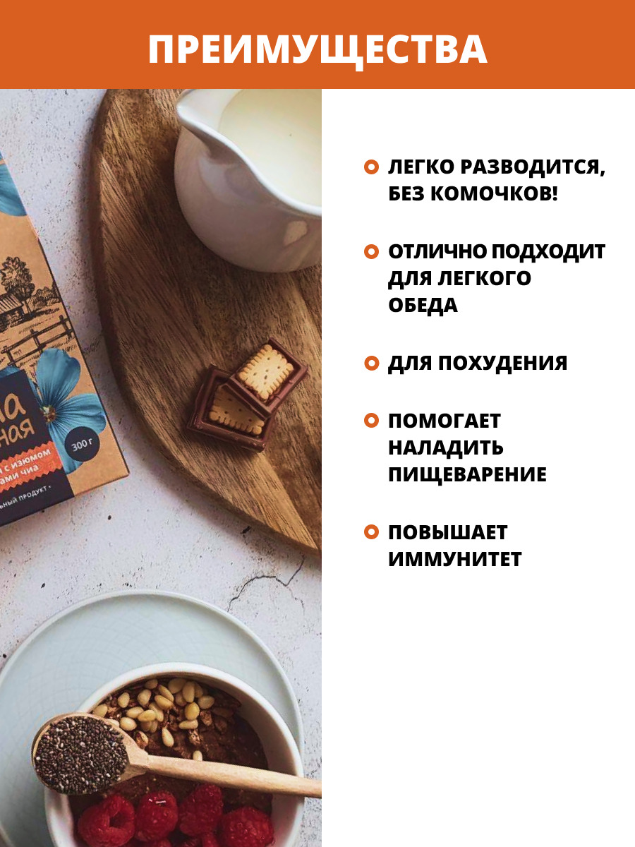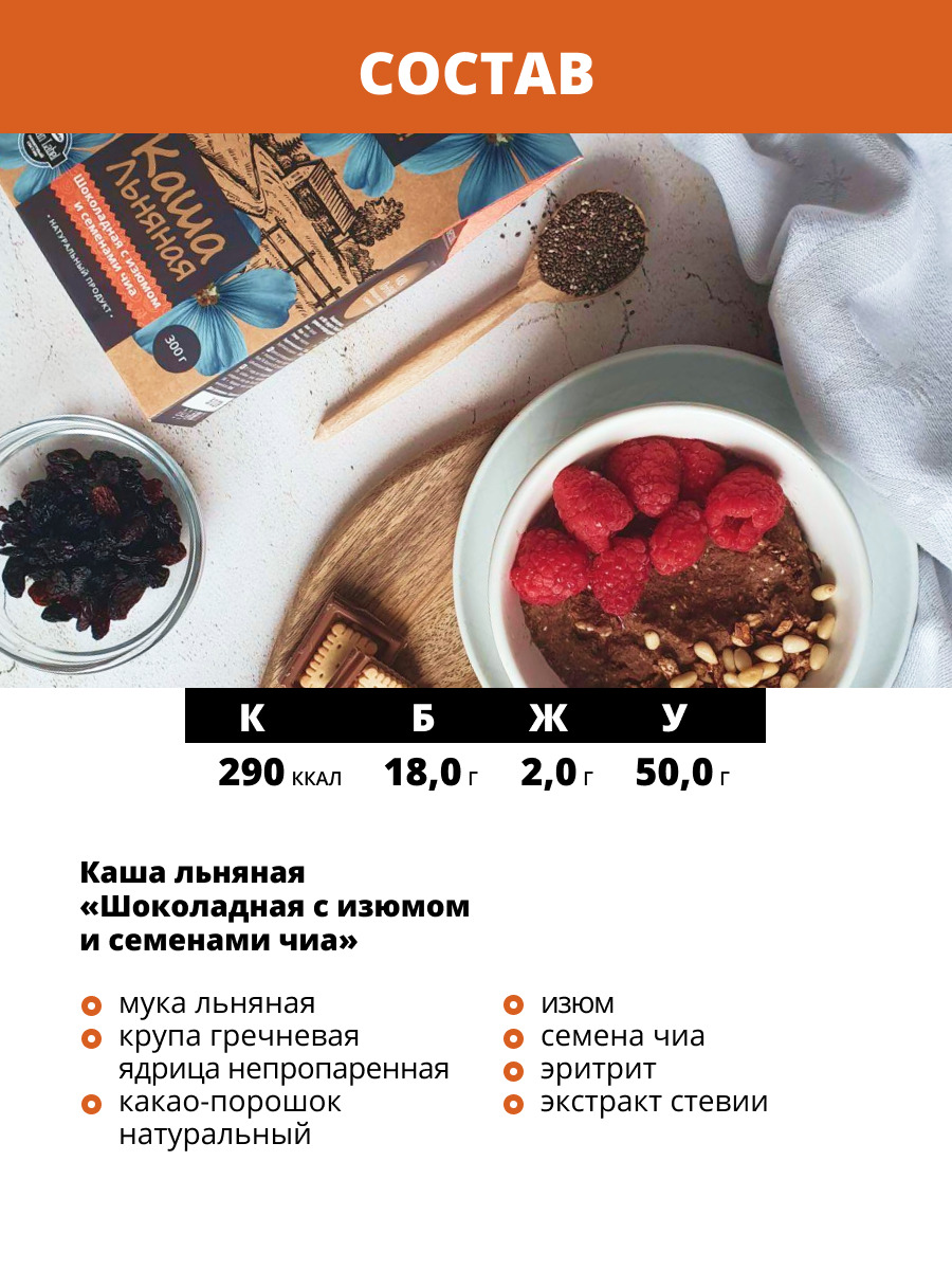 Каша льняная натуральная Шоколадная с изюмом и семенами чиа, из льняного семени, без сахара, 300 г