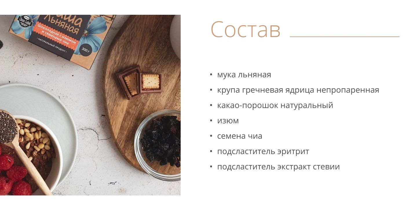 мука льняная, крупа гречневая ядрица непропаренная, какао порошок натуральный, изюм, семена чиа, подсласители: эритрит, экстракт стевии.