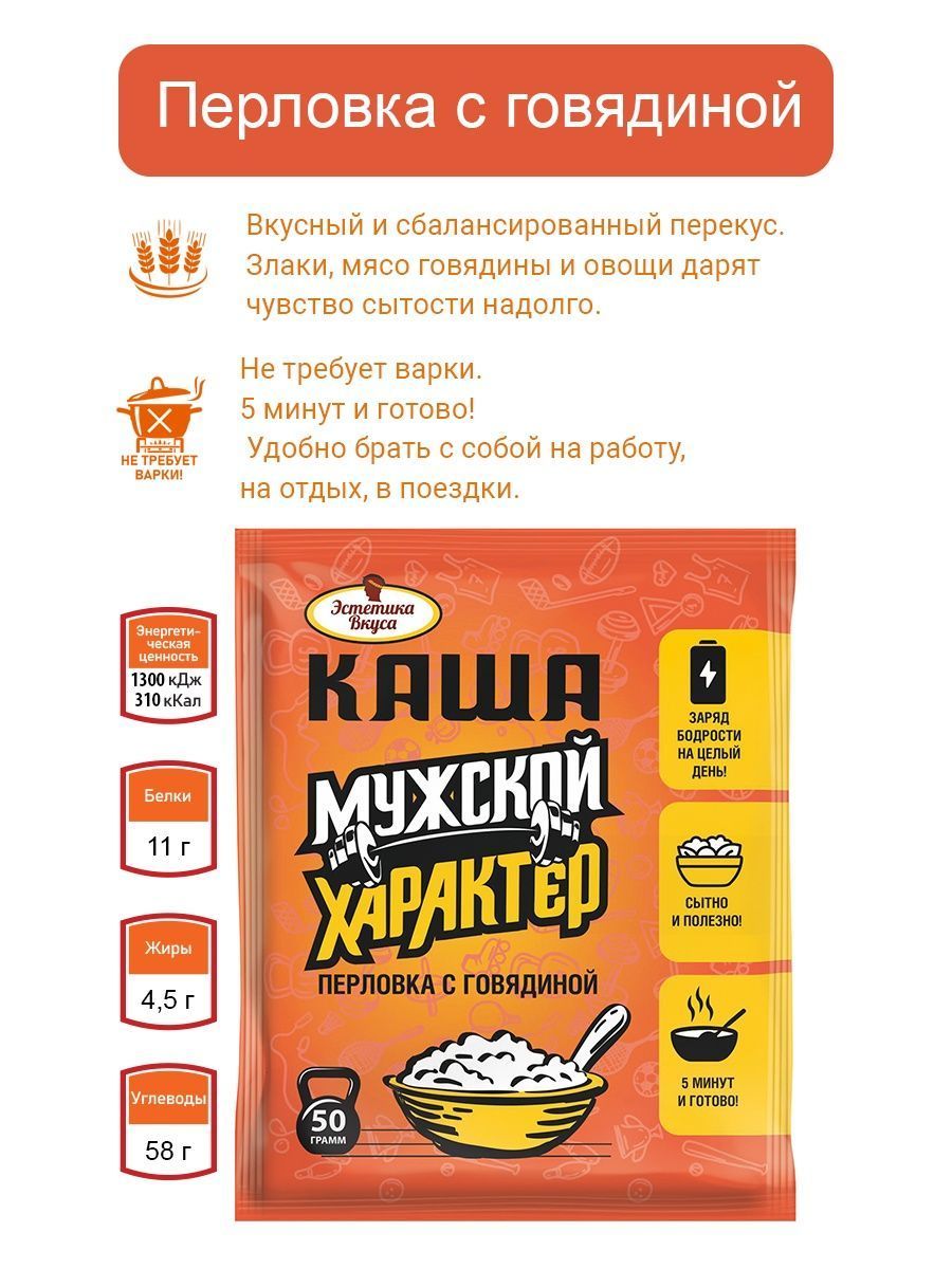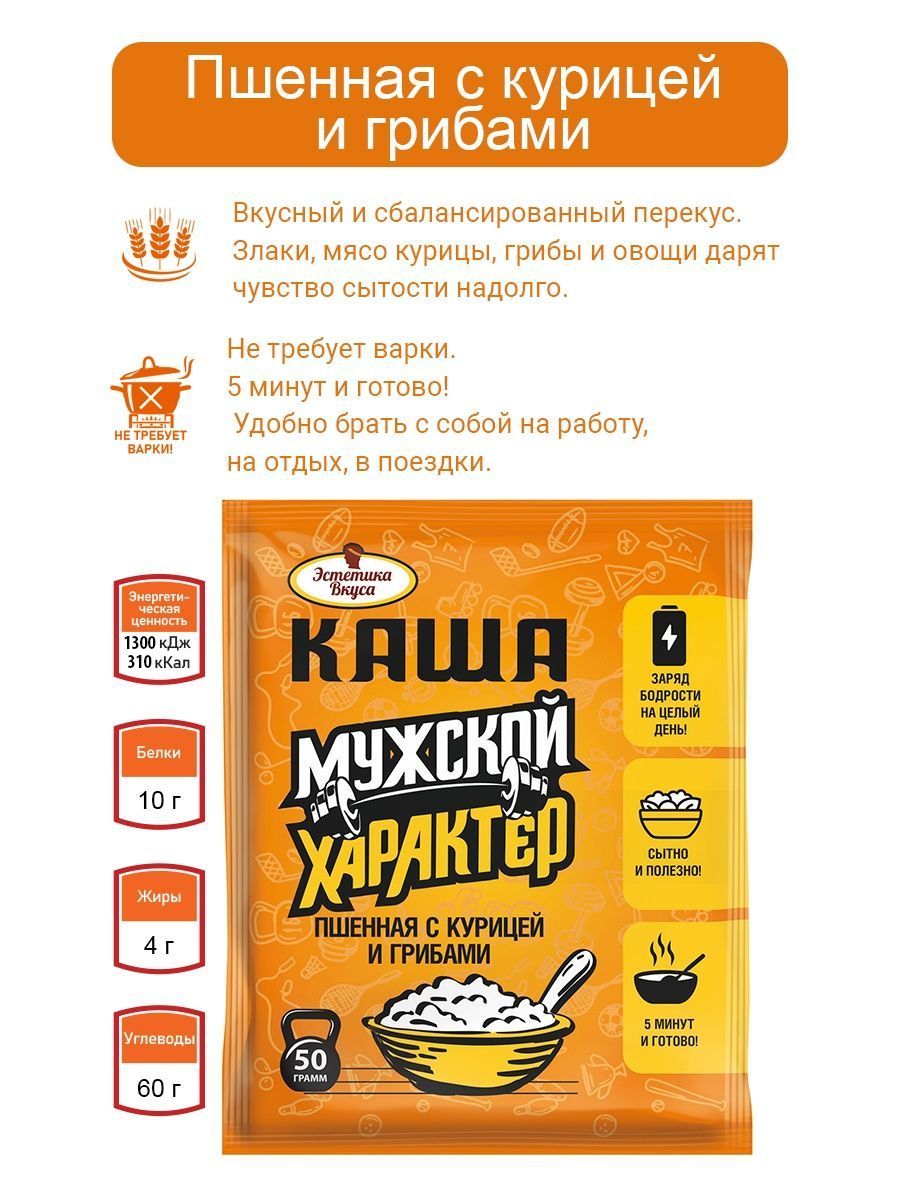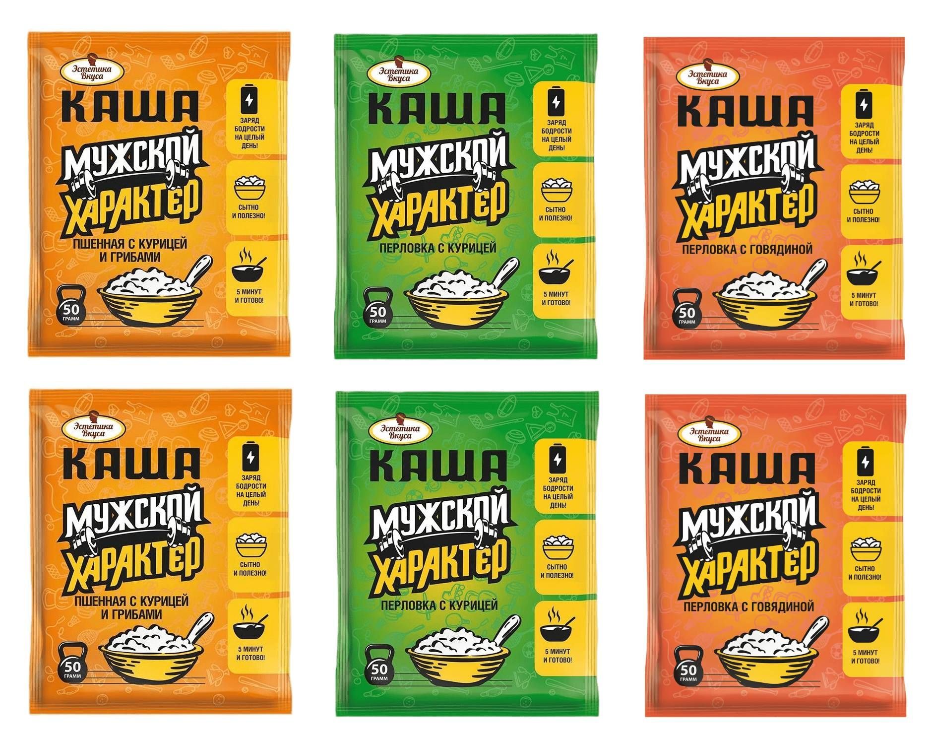 Каша "Мужской характер" ассорти: перловая с курицей, перловая с говядиной, пшенная с курицей и грибами, 50гр (6 шт)