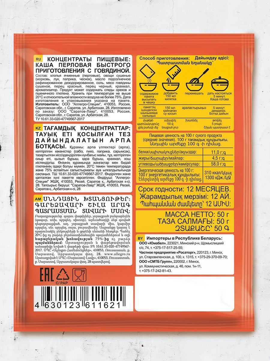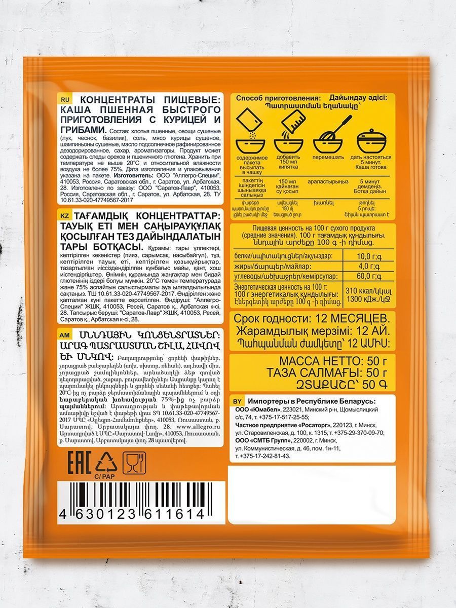 лук, чеснок, соль, перец красный, хлопья пшенные, базилик, мясо курицы сушеное, шампиньоны сушеные, масло подсолнечное рафинированное дезодорированное, сахар, ароматизатор Состав: хлопья ячменные (перловые), морковь, лук, петрушка, чеснок, масло подсолнечное рафинированное дезодорированное, мясо курицы сушеное, соль, крахмал, ароматизатор хлопья ячменные (перловые), морковь, лук, петрушка, чеснок, масло подсолнечное рафинированное дезодорированное, мясо курицы сушеное, соль, крахмал, ароматизатор