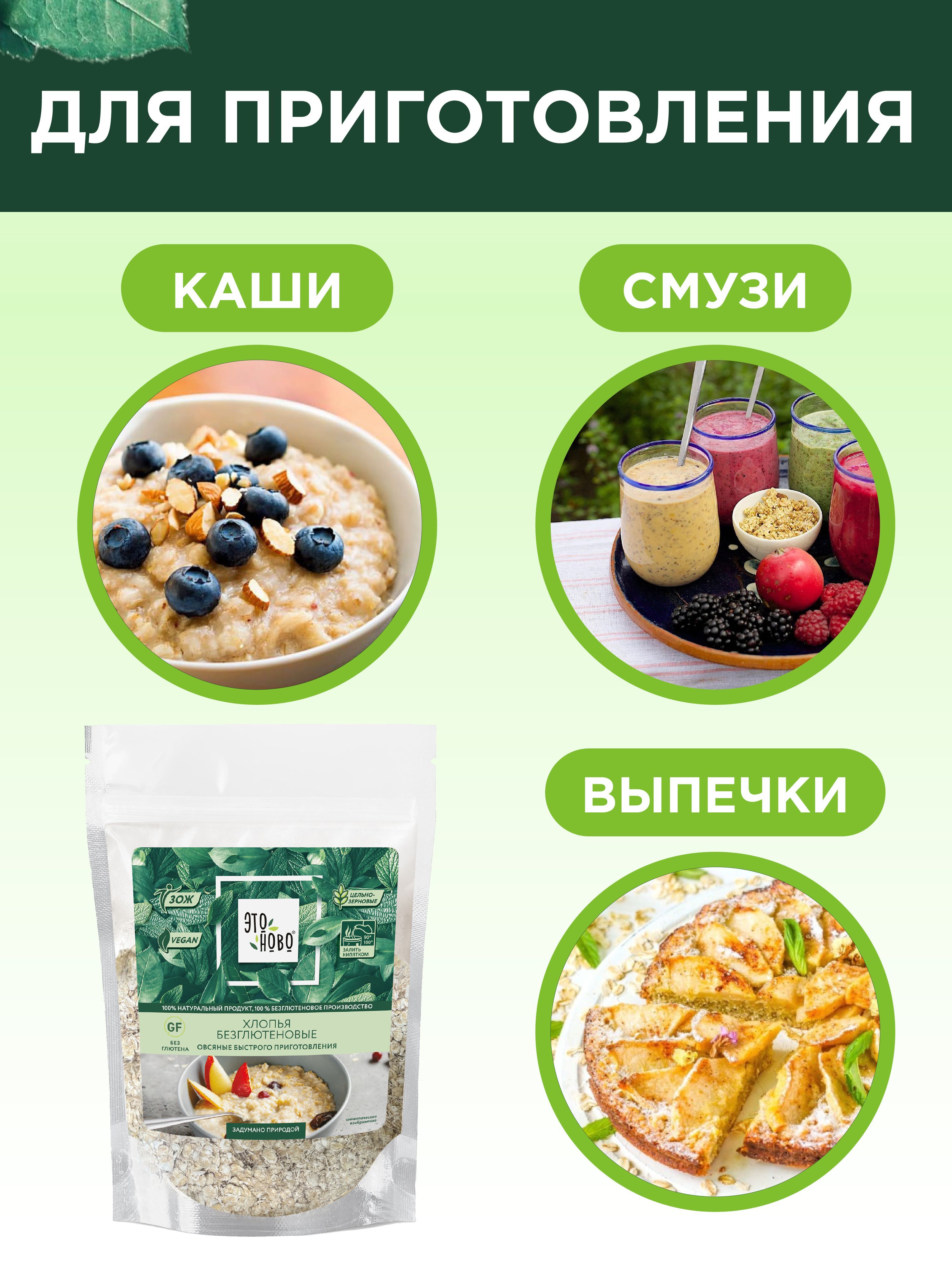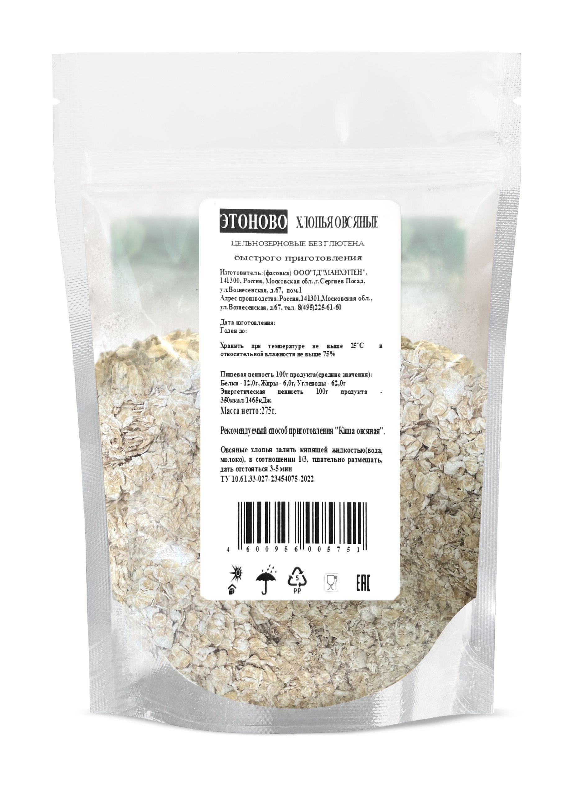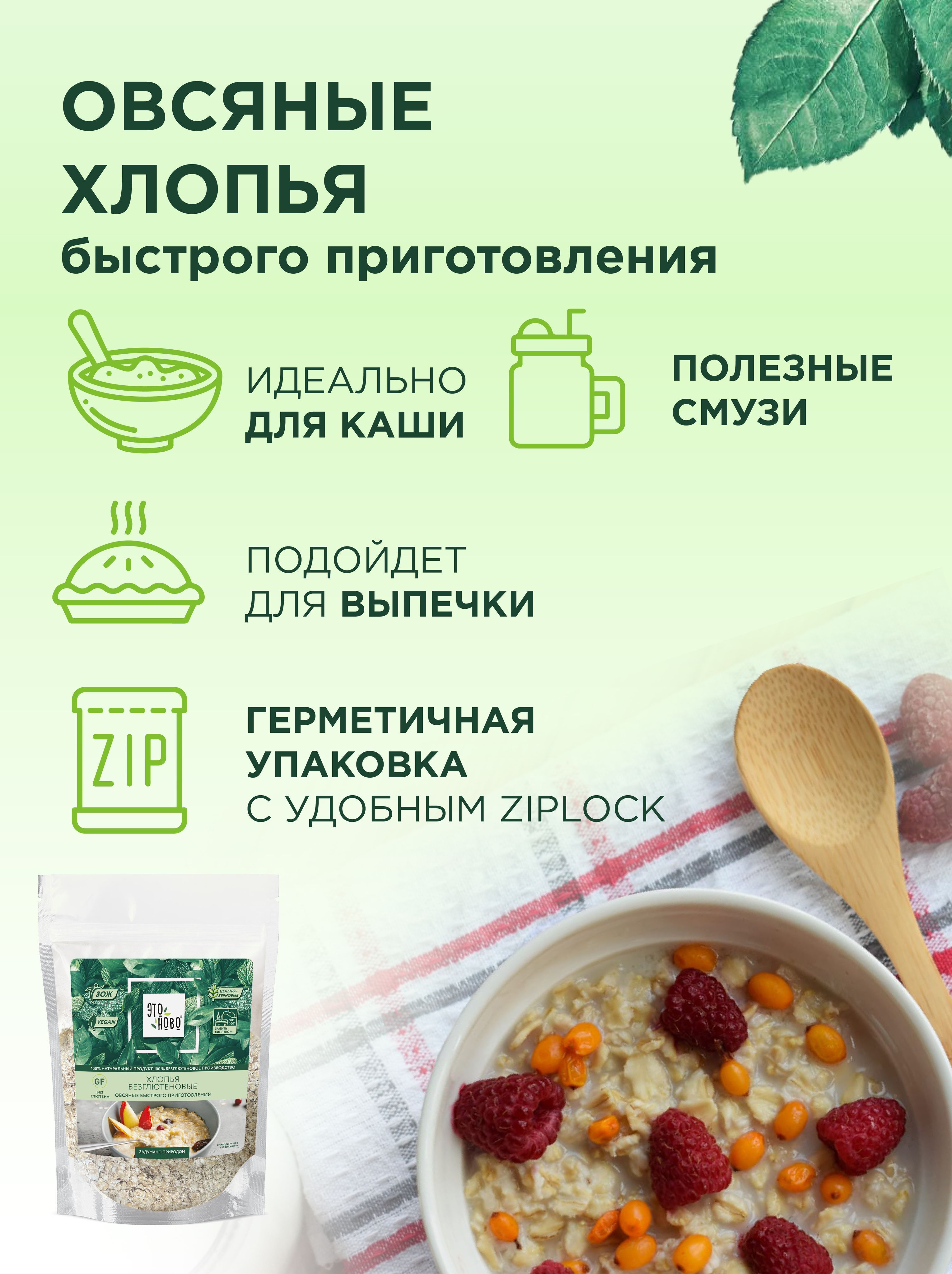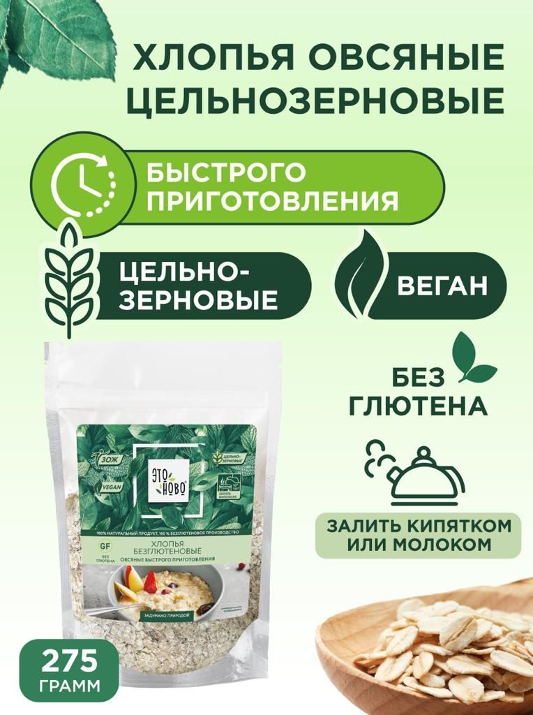 Описание: Овсяные хлопья для завтрака ЭТОНОВО каша быстрого приготовления без глютена 275г. Овсянка органическая – универсальное блюдо, которое подойдет не только на утро, но и на другие приемы пищи. Овес-это кладезь полезностей, ведь в нем содержатся: железо и фосфор, калий и цинк, витамины группы В и Е. Также присутствует магний, который позитивно влияет на сердечную деятельность и стимулирует обмен веществ.Употребление овса рекомендовано абсолютно всем. Но как быть тем, кто не может употреблять глютен, содержащегося в зерновых культурах? Мы в ЭТОНОВО находимся в постоянном поиске лучших ингредиентов. Нашей целью является создание натуральных продуктов, для полезного и правильного образа жизни без консервантов и красителей. Вкусно, без ограничений для организма, благотворно оказывает влияние на общее состояние здоровья теперь доступна каждому. Геркулес не требует варки, достаточно залить горячей водой или молоком температурой 90С-100С в соотношении 1 к 3, тщательно размешать и дать настояться  3-5 минут. Можно сдобрить по вкусу солью, сахарозаменителем Монк фрукт, маслом. Для настроения и хорошего аппетита добавить сухофрукты и ягоды. Наши безглютеновые хлопья раскатаны очень тонко, что сокращает время готовки. Прозрачная упаковка типа дой-пак с зип-застежкой обеспечивает удобное многоразовое расходование. Положительные изменения наблюдаются не только у детей и взрослых, но и у пожилых людей. Легко переваривается, не вызывает тяжести и дискомфорта.Позвольте себе легкость!