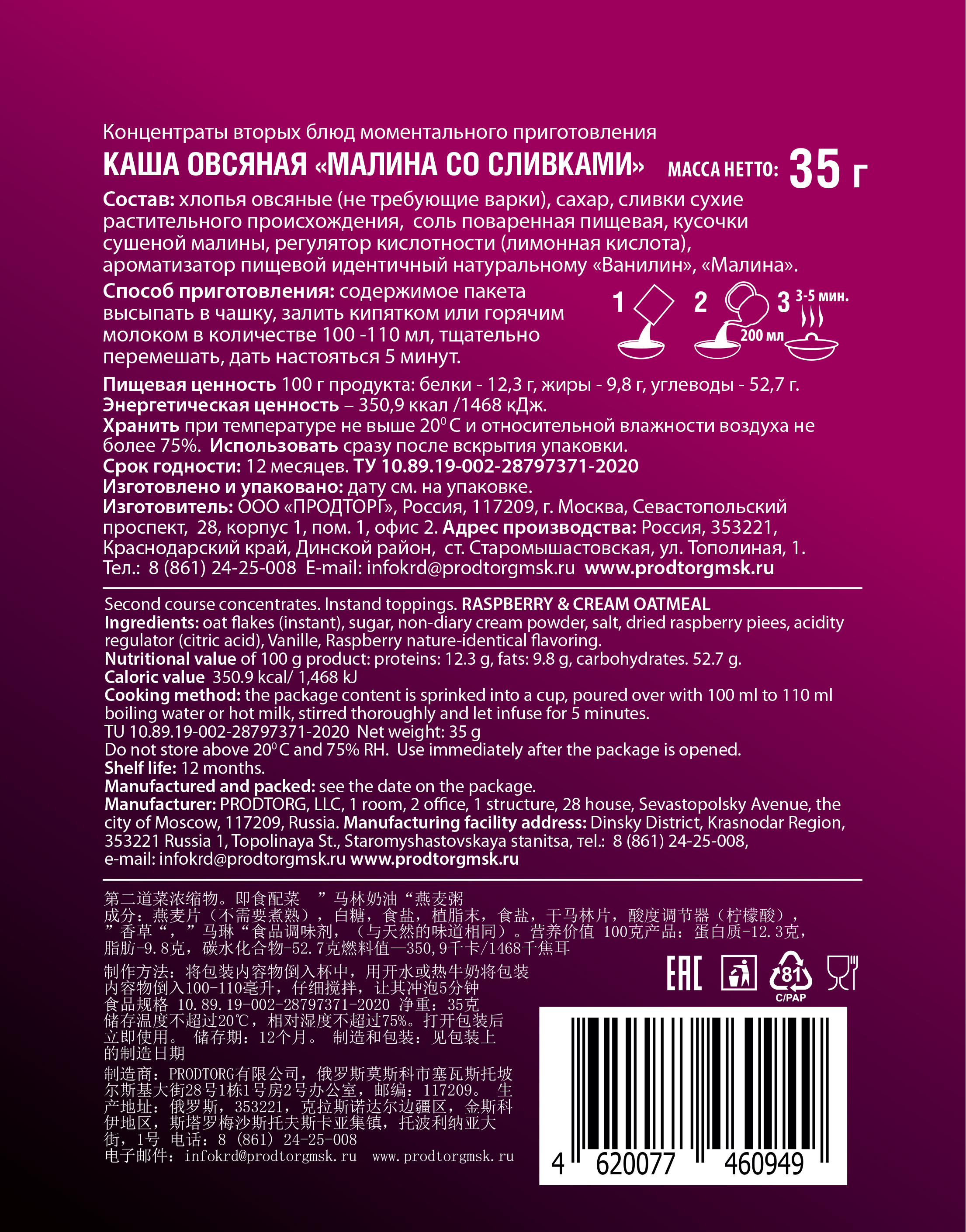 Состав: хлопья овсяные (не требующие варки), сахар, соль поваренная пищевая, сливки сухие растительного происхождения, крахмал картофельный, соль поваренная пищевая, кусочки сушеной малинф, регулятор кислотности (лимонная кислота), ароматизатор пищевой «Ванилин», «Малина» (идентичный натуральному), краситель пищевой «Кармуазин».