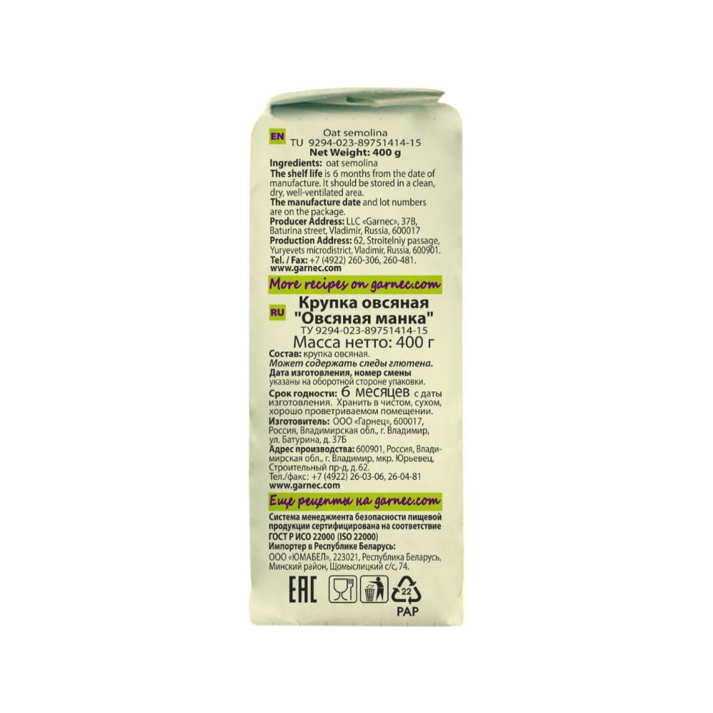 Каша Овсяная манка (крупка) Гарнец 2 шт по 400 гр