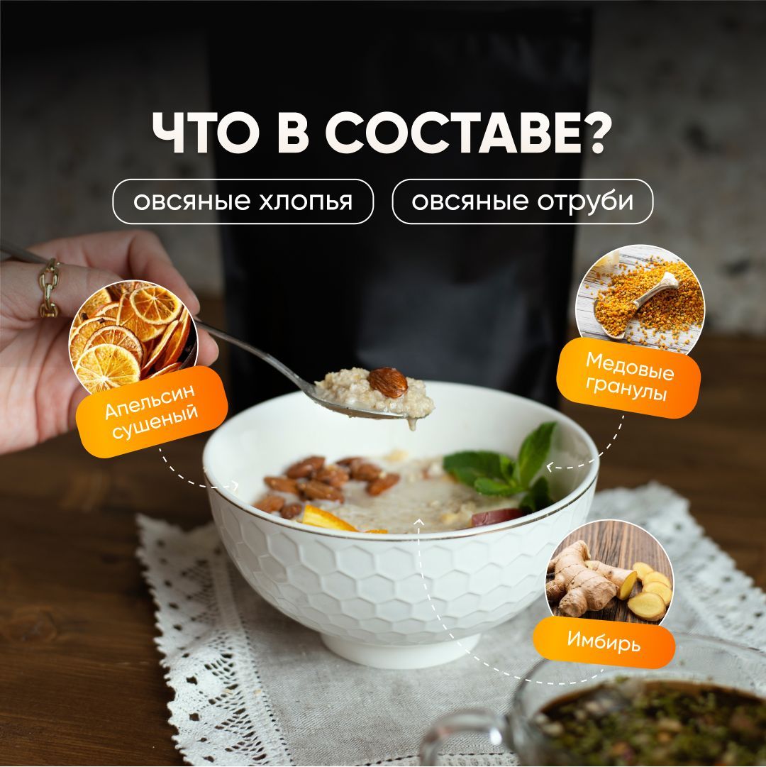 Хлопья овсяные, медовые гранулы, овсяные отруби, апельсин сушёный, имбирь молотый
