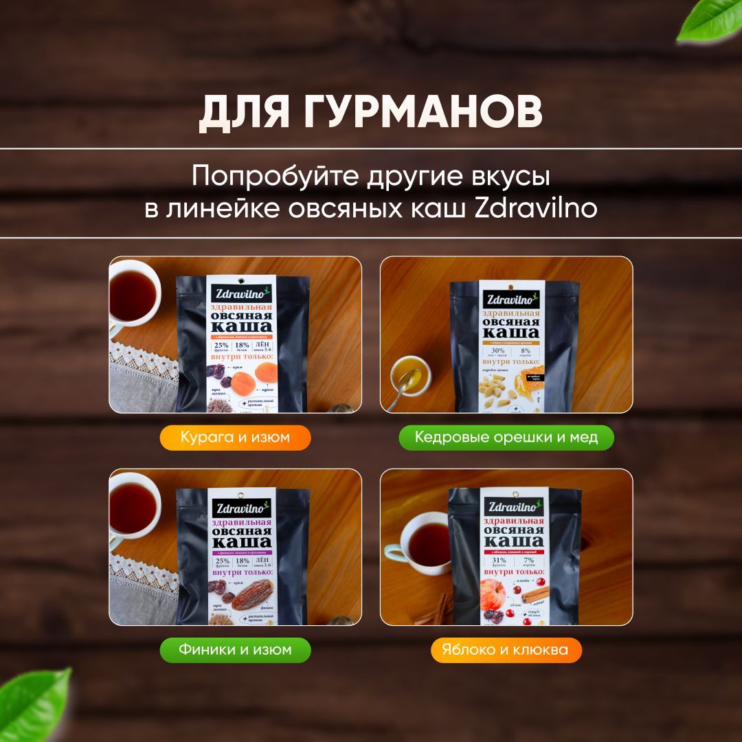 Описание: Овсяная каша быстрого приготовления бренда Zdravilno - это натуральный продукт без сахара и искусственных добавок, содержащий только овсянку с натуральными ингредиентами. Расшифровка названия "Здравильно" подразумевает под собой - здоровый правильный выбор. Удобный способ приготовления делает изделие идеальным перекусом, который можно взять с собой везде - в поход, на рыбалку, в поездки, на отдых или сплавы, достаточно только заварить кипятком. Вы точно можете быть уверенным, что ваш завтрак будет полезным и насыщенным. Пакет дой - пак удобно хранить. В составе злаковой каши отсутствуют сахар, его заменители, ароматизаторы и другие вредные вещества. Изумительный вкус продукта достигается добавлением большого количества натуральных ингредиентов (ягоды, медовые гранулы, орешки). В коллекции бренда представлены каши с льняной мукой, а также варианты с отрубями. Наличие нескольких вариантов изделия - со вкусом апельсина и имбиря, медовых гранул и кедровых орешков, а также двух протеиновых вкусов позволяет выбрать свой вариант каждому любителю вкусной и полезной каши. Купите овсяную кашу в порционных пакетах и наслаждайтесь полноценным завтраком каждый день недели без долгого приготовления. Это идеальный вариант здорового питания в любом месте: на работе, в дороге или в путешествии, во время отдыха на природе. Наша овсяная кашка - это не только быстрое и удобное решение для завтрака, но и полезный продукт для тех, кто следит за своей диетой и здоровым образом жизни. Так же вы найдете крупяные смеси с сухофруктами, орехами и ягодами, а также цельнозерновые хлопья и крупы в удобных пакетиках. Каша в упаковке подходит для легкой и быстрой варки дома. Каждый пакетик протеиновой каши с добавлением сушеных фруктов или ореховых кусочков, а также отрубей и гранул, содержит кладезь полезных веществ. Вкусная и нежная каша подойдет всем, от детей до взрослых, пожилых людей и лежачих больных. Такие кашки - это настоящая помощь для родителей, ведь они отлично подходят для детского питания. Также каша без добавления сахара и животных продуктов подходит для поста и веганской диеты. В каше много сложных углеводов и пищевых волокон, что делает ее идеальным выбором для правильного питания, похудения, обеспечивая Вас энергией на весь день. Медовые гранулы и измельченные кедровые орехи в нашей каше, придают ей приятный аромат и сладковатый вкус. Такая крупа в пачке, которая готовится буквально за минуту - идеальный вариант для любителей простых классических вкусов и рецептов. Подарочная упаковка делает продукт идеальным сувениром из России для туриста или друга. Растворимая постная каша подходит для быстрого перекуса на работе или во время прогулки по городу. Вкусное блюдо с фруктами и ягодами для здорового и правильного питания - это лучший вариант полезного завтрака утром. Овсяная крупка быстрого приготовления - это продукт бакалеи, которы должен быть в каждом доме. Такого рода продукты с молотыми и дроблеными добавками подходят для пп и домашней кулинарии. Если у вас всего "минутка" на обед, наша крупка станет отличным выбором. Это отличное походное и дорожное здоровое питание в удобной упаковке. Это универсальный подарок для детей, взрослых, мамы и папы, любимого человека, вегетарианцев и веганов на любой праздник. Кушайте на здоровье