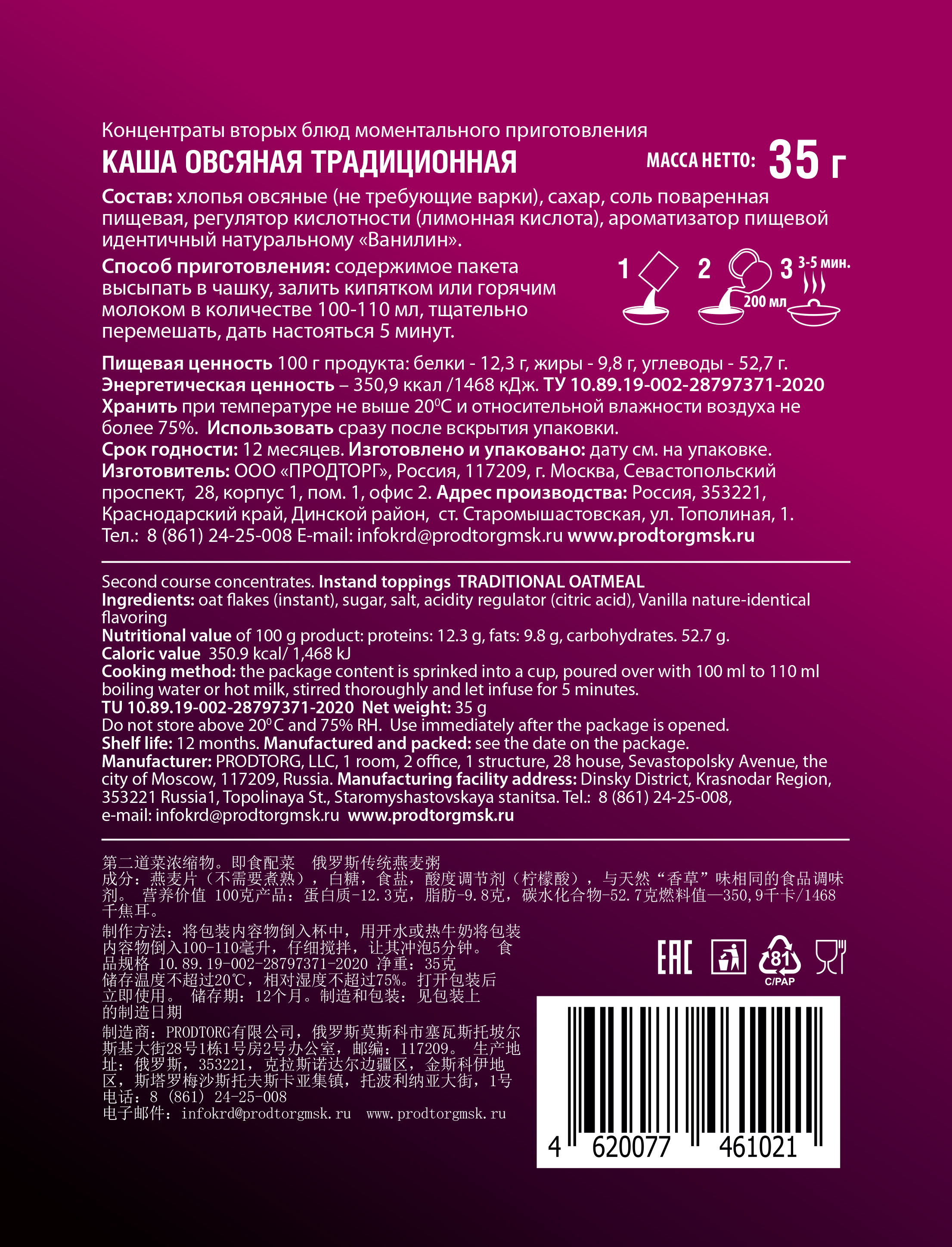 Каша овсяная традиционная "Кубанская кухня" 35г., набор 25 шт
