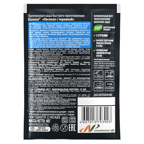 Описание: milk protein. Натуральная протеиновая овсяная каша Bionova® с черникой без добавления сахара, содержит 18 % белка, медленные (правильные) углеводы и пищевые волокна, в том числе инулин, поэтому она надолго придает чувство сытости, наполняя организм энергией и поддерживая аминокислотный баланс на протяжении длительного периода времени.