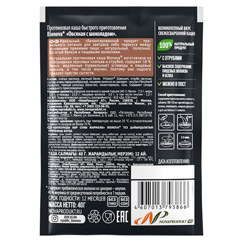 Каша протеиновая Bionova Овсяная с шоколадом, 7 штуки по 40 г