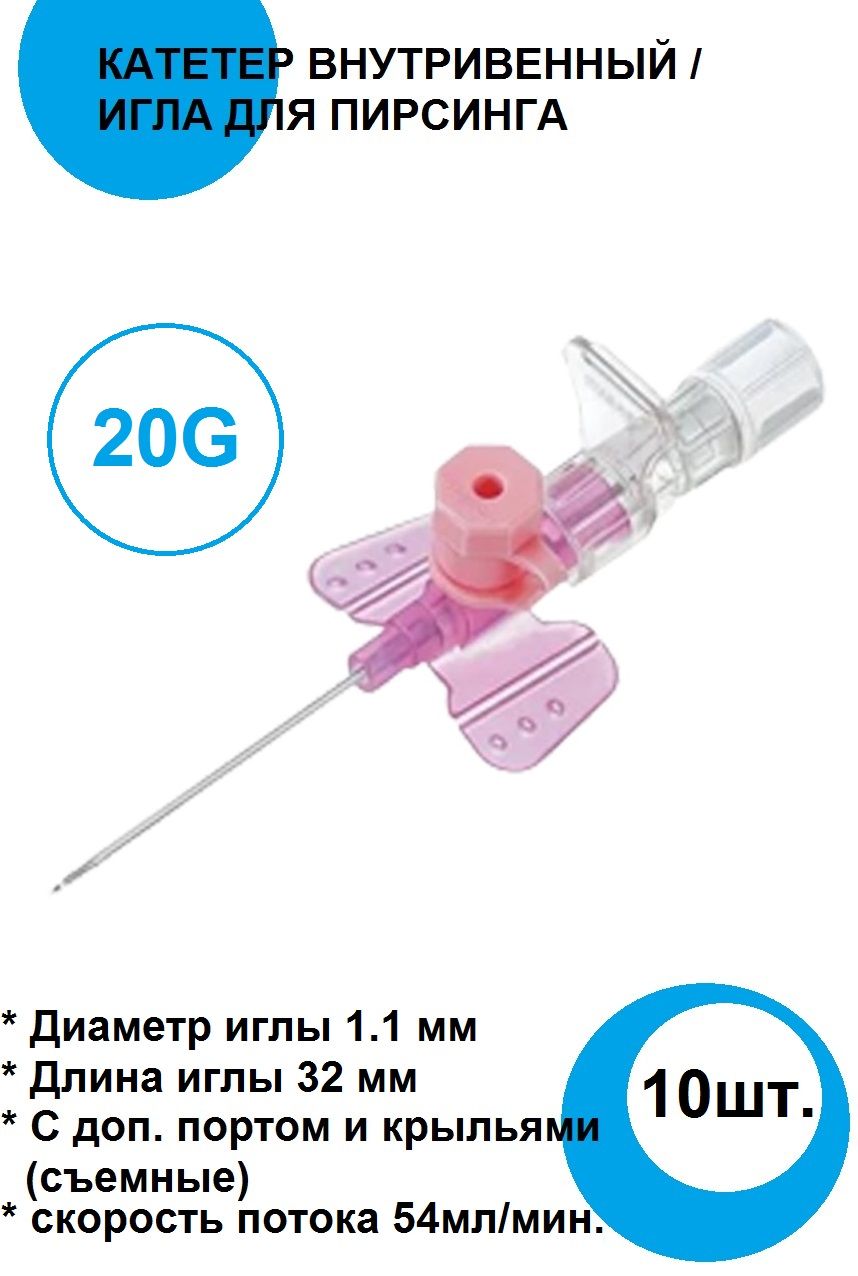 Катетер внутривенный 20G периферический, игла стилет с крылышками для пирсинга, шприцов и катетеризации Индия 1,1х32 мм - 54 мл/мин, набор 10 штук