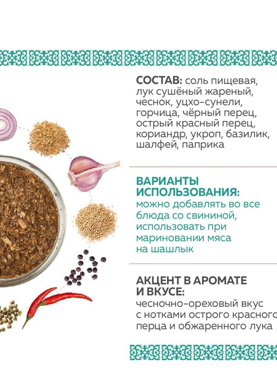 Назначение приправы: Для блюд на гриле, Для жаркого, Для мясных блюд, Для свинины, Для тефтелей, Для холодца