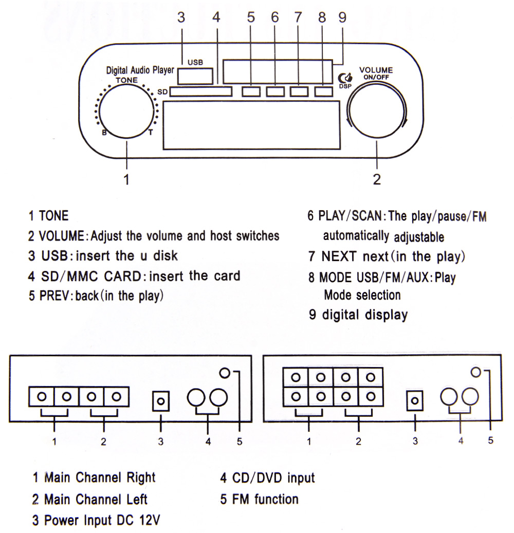 -Может воспроизводить U-диск SD / MMC-карту для музыки и FM-стерео радио, поддерживает музыкальный формат MP3.