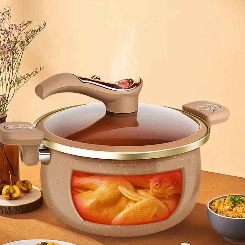 Наш горшок разработан с предохранительным клапаном и запирающей крышкой для предотвращения несчастных случаев. Приподнятый край кастрюли предотвращает переливание жидкости, а прозрачная крышка с первого взгляда делает приготовление пищи.