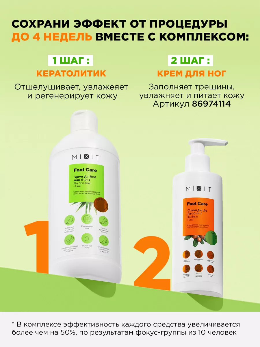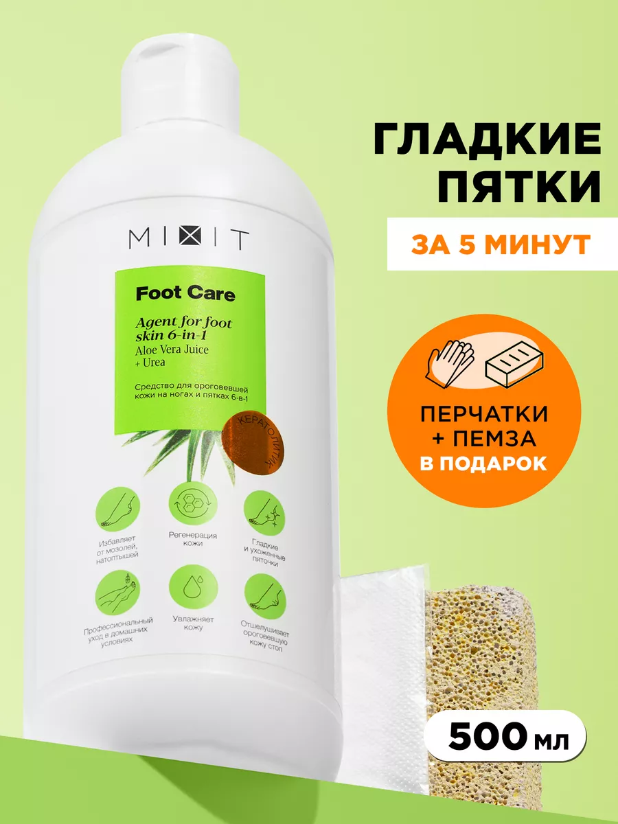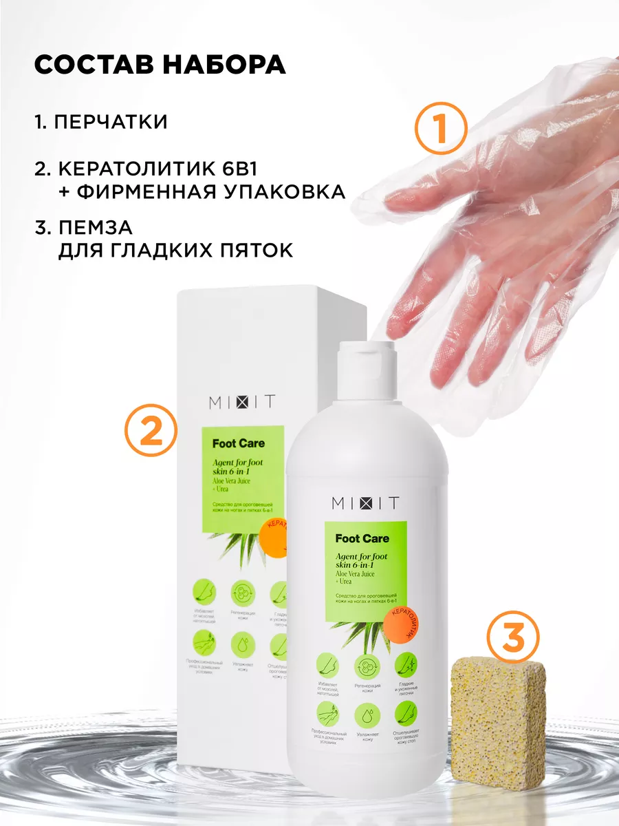 Комплектация Перчатки - 1 пара.; Отшелушивающая пемза - 1 шт; Кератолитик для ног - 500 мл, 1 шт.