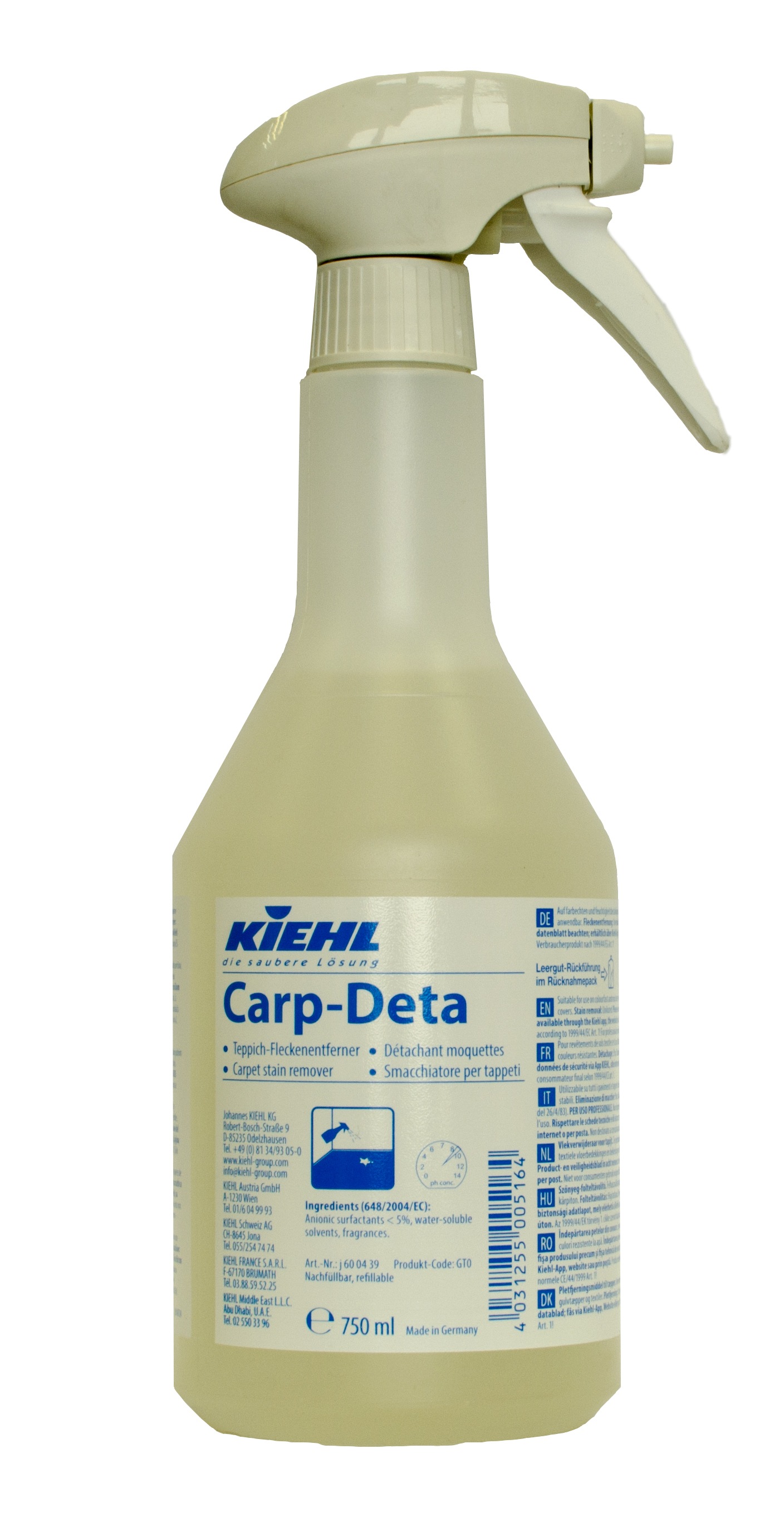 Перед первым применением убедитесь в стойкости красителей на небольшом участке в незаметном месте. Выведение пятен: Нанесите Carp-Deta на чистую сухую салфетку и обработайте пятно по направлению от периферии к центру. Удалите с обработанного участка избыточную влагу, многократно промокая его бумажной или текстильной салфеткой. Трудно поддающиеся пятна после предварительной обработки Carp-Deta удалите моющим пылесосом, пользуясь при этом, ручной насадкой.