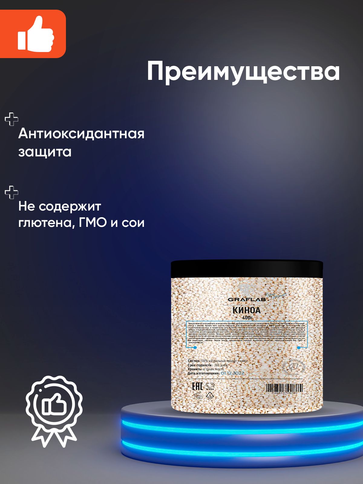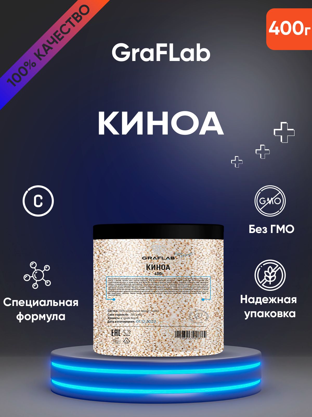 Легкие и нежные зерна киноа - кладезь полезных для здоровья микро- и макроэлементов, витаминов, пищевых волокон. От многих злаковых киноа отличает большая польза, в частности, в ней содержаться клетчатка, витамины группы А и В, С, Е, кальций, магний, цинк, селен, медь, железо, фосфор, натрий и холин. Продукт имеет низкий гликемический индекс, поэтому входит в рацион диетического питания. Богатый состав киноа позволяет использовать его в рационе беременных и кормящих женщин. Состав киноа позволяет заменить в рационе молочные продукты, поэтому семена часто включают в свой рацион те, кто не переносит лактозу. Зерна киноа натуральный продукт высокого качества, приготовленный без ГМО и консервантов. Покупайте безопасное для себя и своих близких!