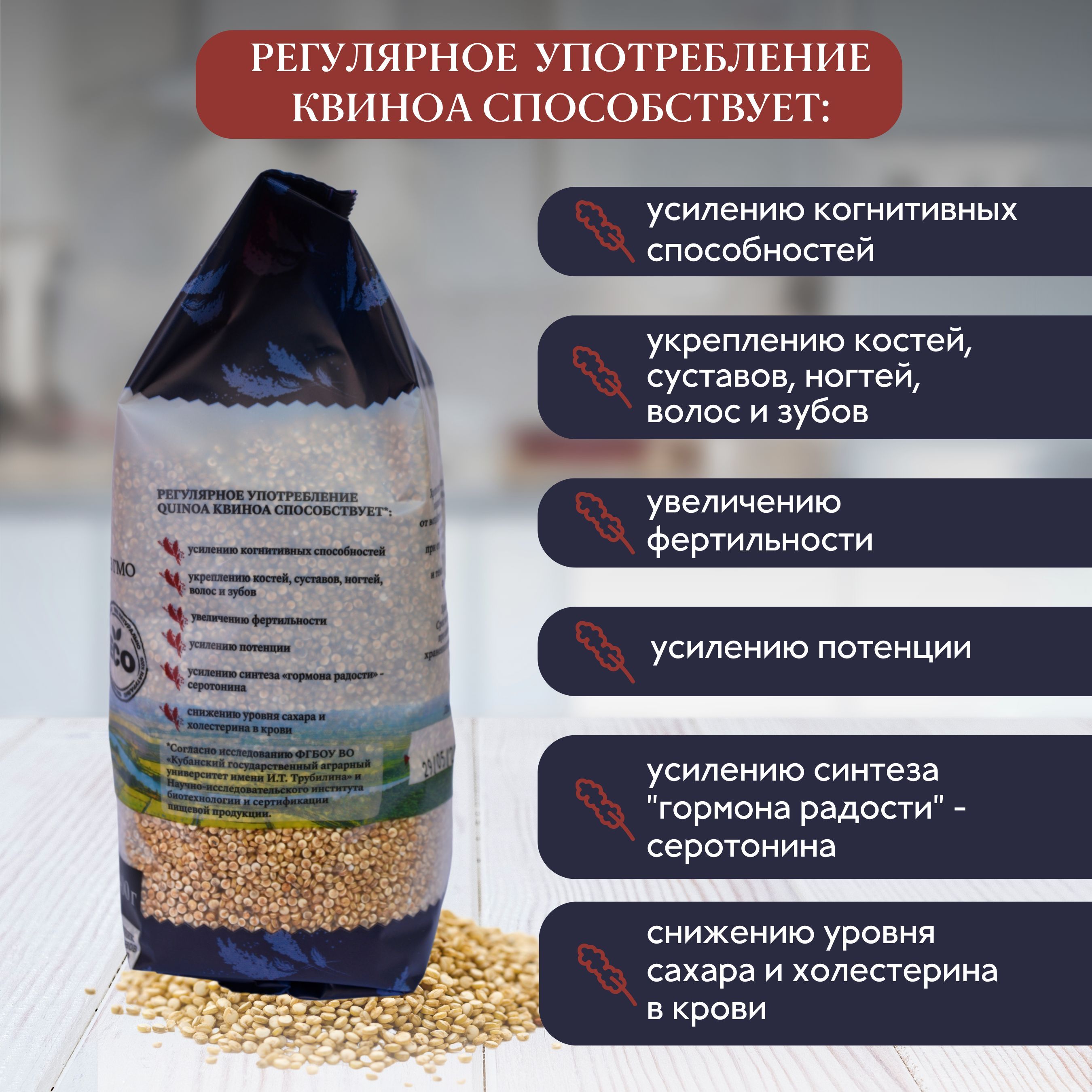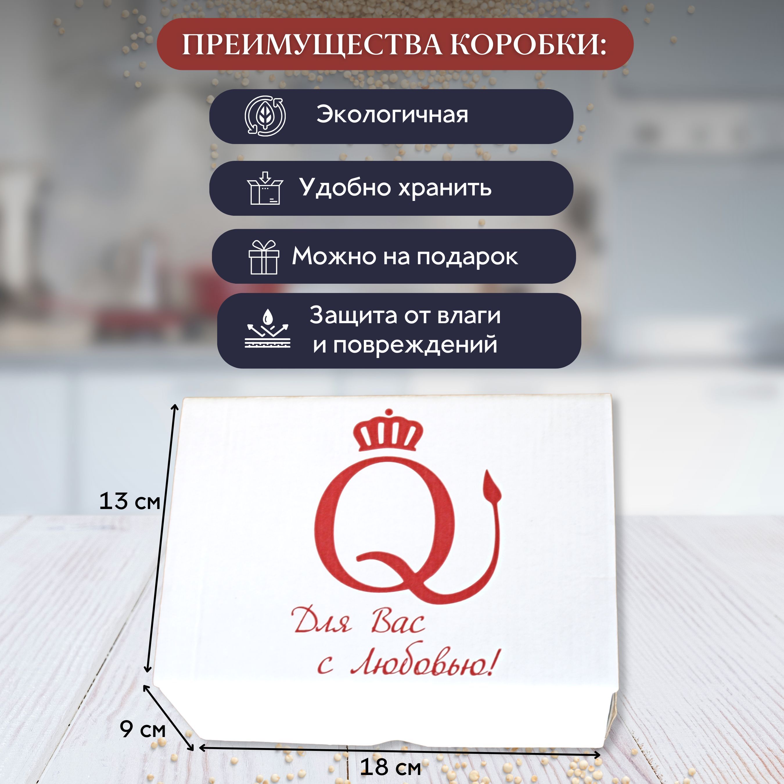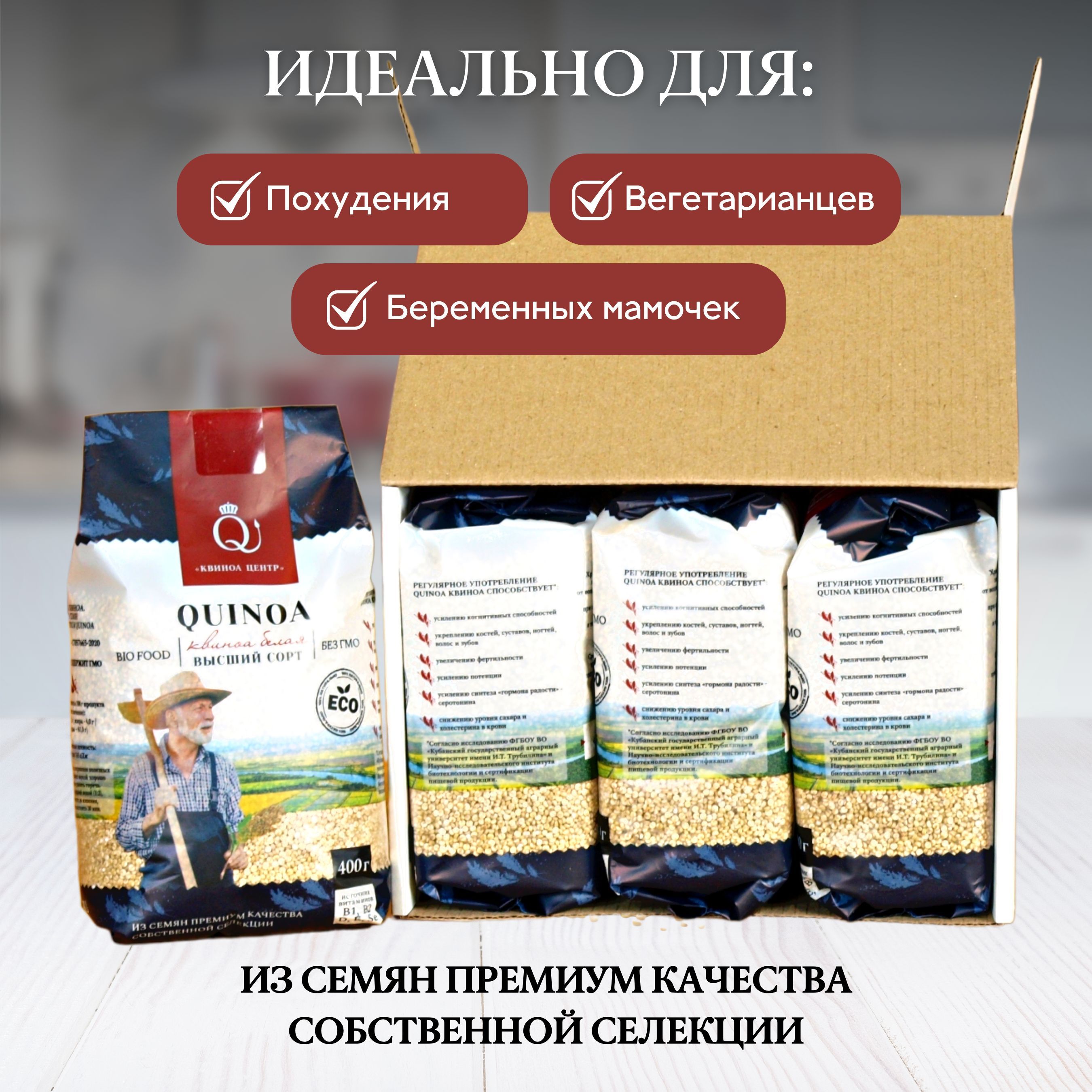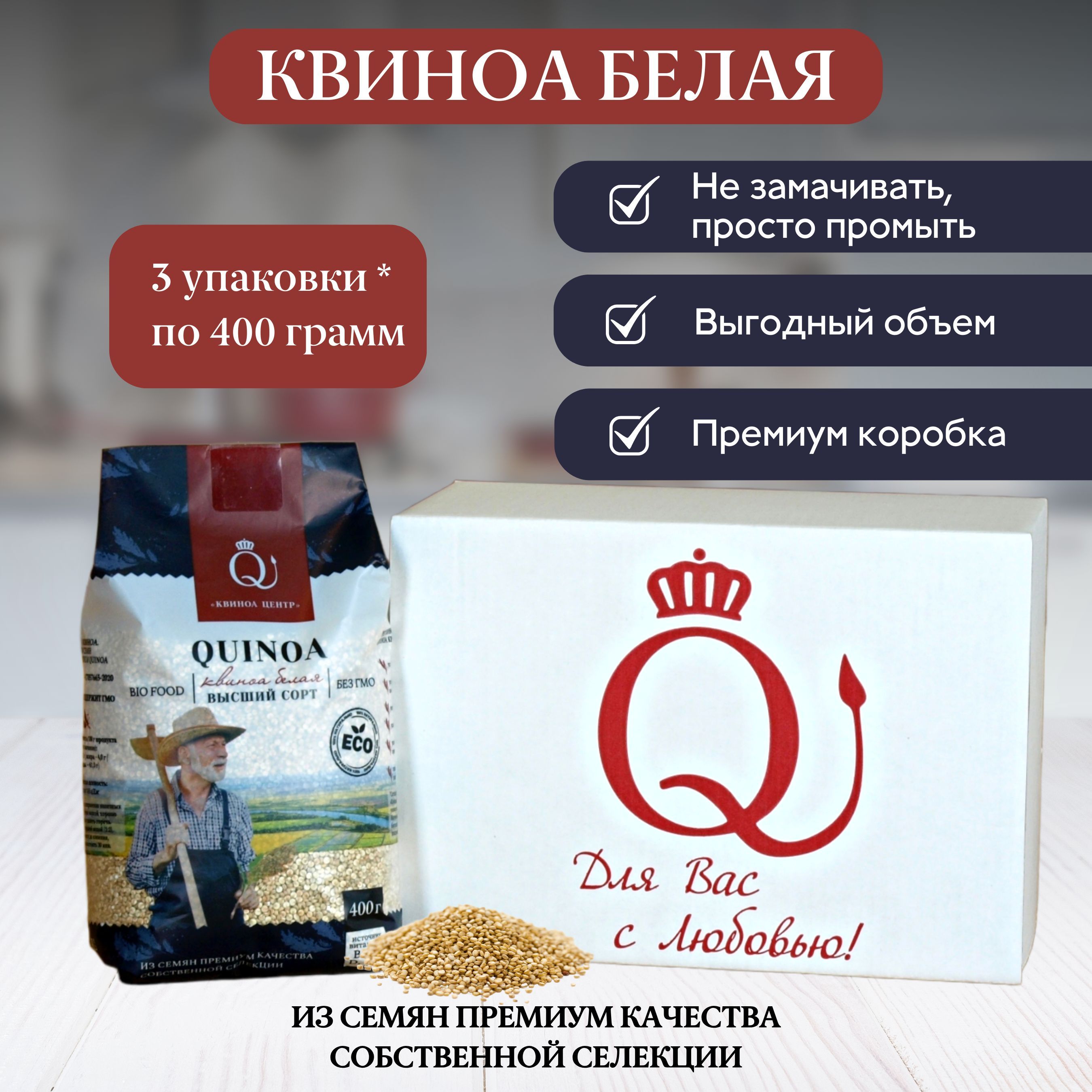 Киноа - это премиум продукт высочайшего качества, выращенный путем собственной селекции в России. Она белая, органическая и не содержит ГМО. Это означает, что семена были выращены без использования химических удобрений и пестицидов, что делает их экологически чистым продуктом.