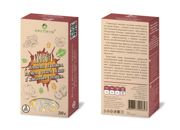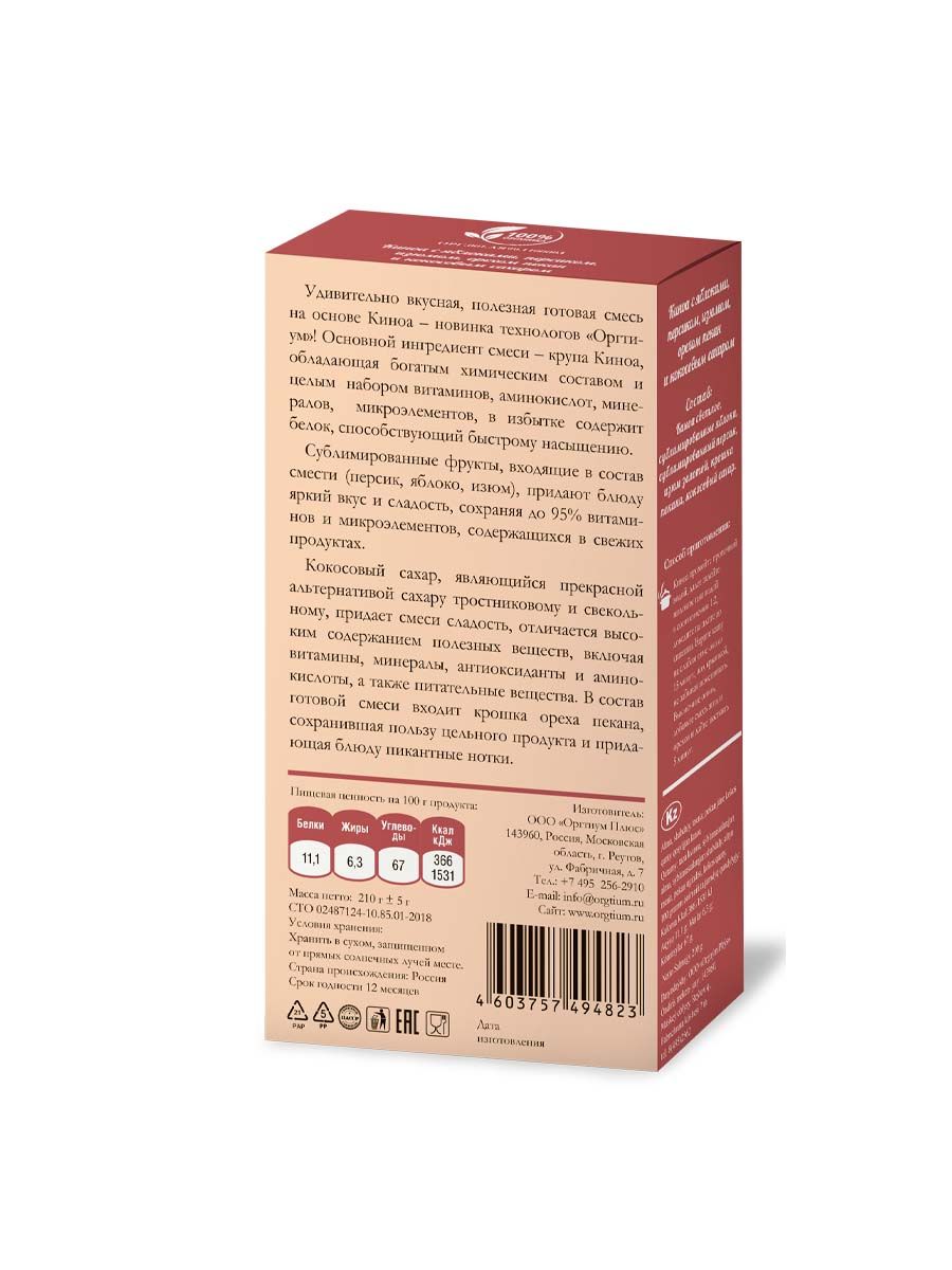 Киноа с яблоками, персиком, изюмом, орехом пекан и кокосовым сахаром, 210г. Оргтиум