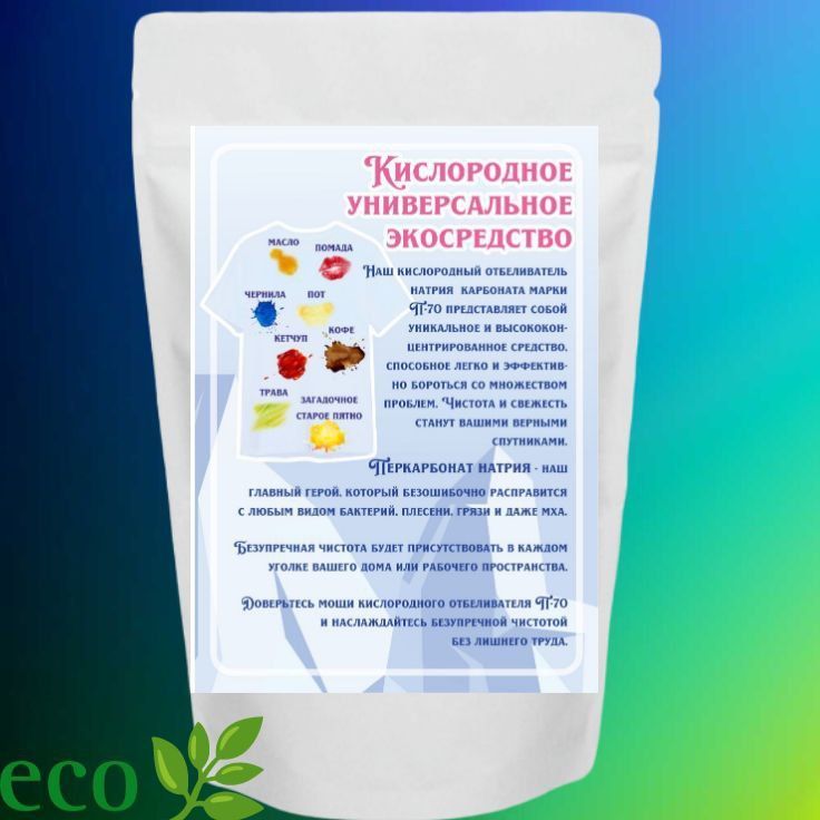 Описание: Кислородное Универсальное ЭКОсредствоСпособное легко и эффективно бороться со множеством проблем. Чистота и свежесть станут вашими верными спутниками. Полное отсутствие хлора, благодаря чему нет едкого запаха. Моющее средство для посуды, отбеливатель для белья в том числе и детского, пятновыводитель, кислородный отбеливатель для посуды с нагаром и налётом, очиститель от плесени на разных поверхностях.Идеально для белогоВеликолепно отбелит все белые рубашки,блузки и уберет пятна. Безопасен для стирки детской одежды.
