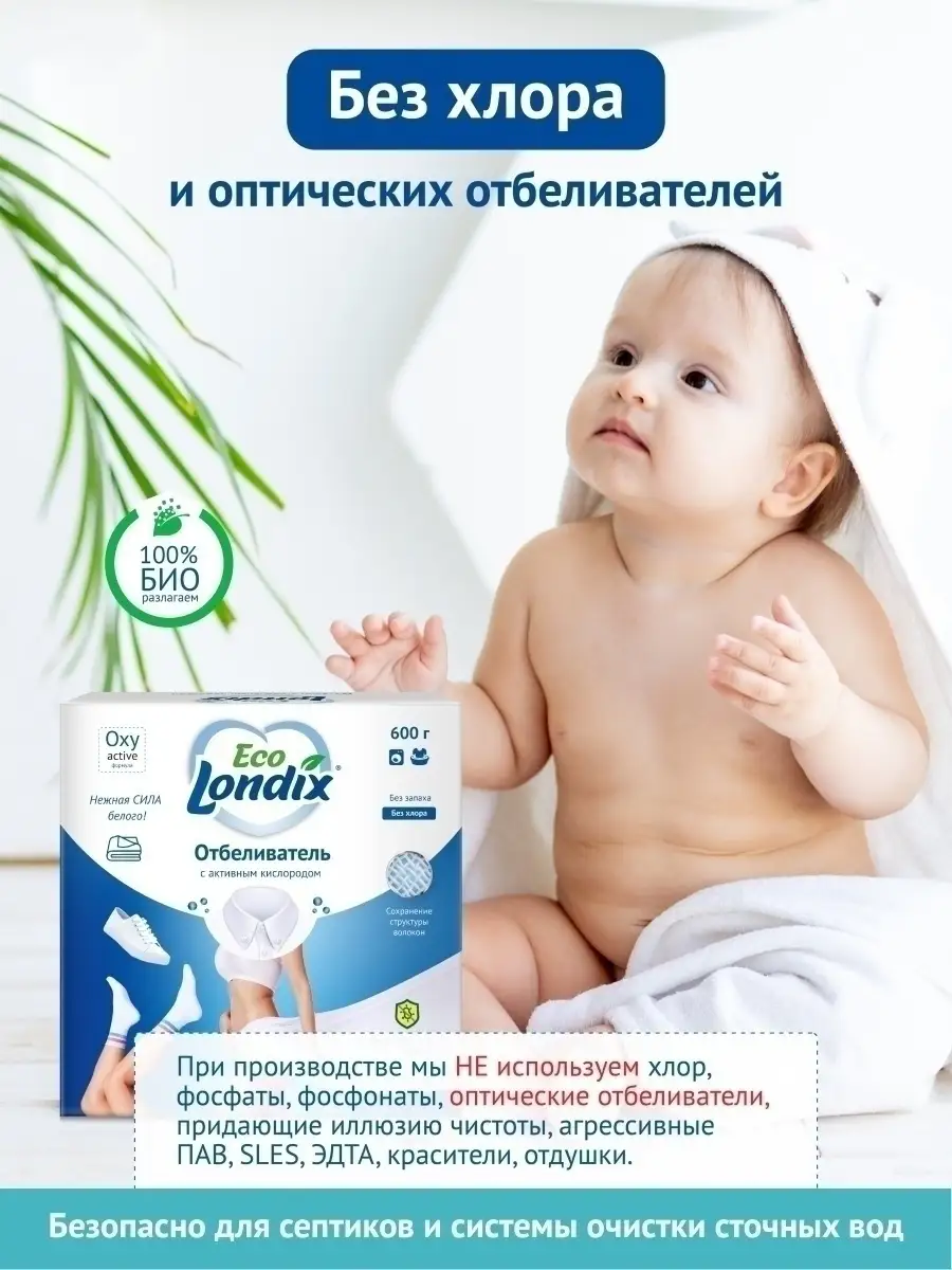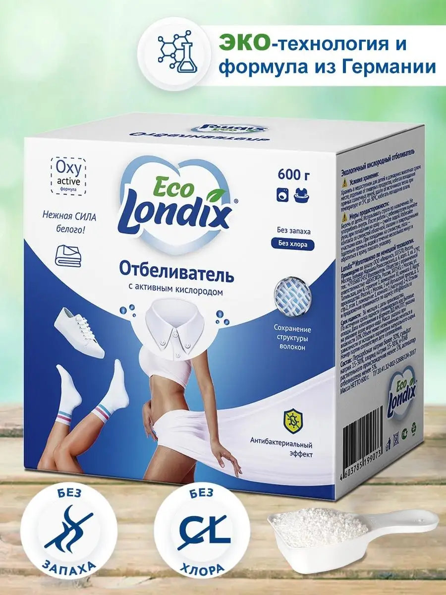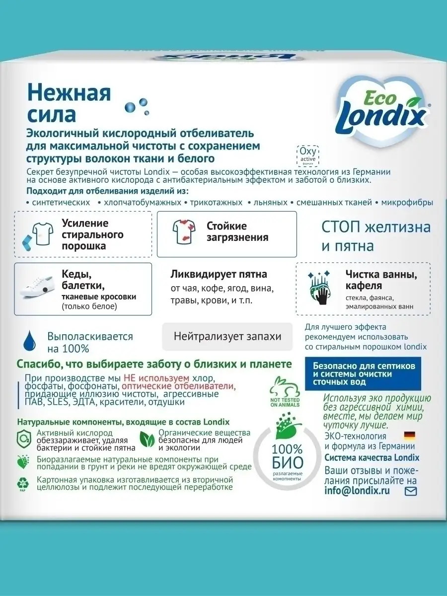 Описание: Универсальный отбеливатель для белья на основе активного кислорода Eco Londix бережно и эффективно возвращает вещам первоначальную белизну, удаляет пятна, обеззараживает, нейтрализует запахи. Он не имеет запаха, безопасен для стирки детского белья с рождения, полностью растворяется в воде и выполаскивается из ткани водой на 100%. Активный кислород проникает глубоко в волокна ткани и, сохраняя структуру волокон, справляется с пятнами от вина, чая, кофе, грязи. Так же, эффективно отстирываются "детские" загрязнения - следы от ягод, фруктов, сока, шоколада. Отбеливатель Londix для белого обладает накопительным эффектом – при регулярной стирке с ним происходит постепенное отбеливание пожелтевшего или посеревшего белья. Области применения универсального отбеливателя Londix в домашнем хозяйстве очень широкие: 1 - замачивание и выведение пятен с белого и светлого белья. 2 - добавление к стиральному порошку в качестве усилителя стирки. 3 - отбеливатель для детского белья 0+. 4 - чистка ванны, кафеля, межплиточных швов, фаянса. 5 - отбеливание тюля, штор, кружев и нижнего белья. Особой популярностью наш отбеливатель пользуется для восстановления цвета белых тканевых кроссовок, кед и балеток. И очистке, с приданием белого цвета, белым подошвам и рантам обуви. Для максимальной эффективности отбеливания рекомендуется следовать инструкции на упаковке и стирать на максимальной температуре, указанной на ярлыке изделия. Наилучший результат достигается при стирке на температуре от 60 градусов. При использовании отбеливателя для одежды не стоит забывать о важных правилах стирки, которые помогут убрать пятна, не испортив ткань: обязательно изучите символы по уходу за текстильными изделиями на вещах. Не используйте отбеливатель для ткани, если его применение не разрешено на бирке. Так как данное средство изначально представляет из себя порошок, при ручной стирке обязательно убедитесь, что отбеливатель в воде растворился полностью и на дне тазика не осталось крупинок. Эко отбеливатель кислородный Лондикс НЕ СОДЕРЖИТ хлора, фосфатов, фосфонатов. Так же отметим, что мы не используем оптические отбеливатели, поэтому отбеливающий эффект с нашим средством реальный, а не обман зрения. Экономичен и безопасен для септиков и систем очистки сточных вод. ЭКО-технология и формула из Германии.
