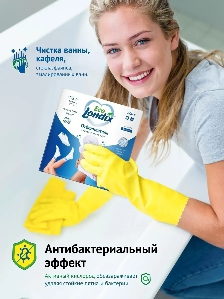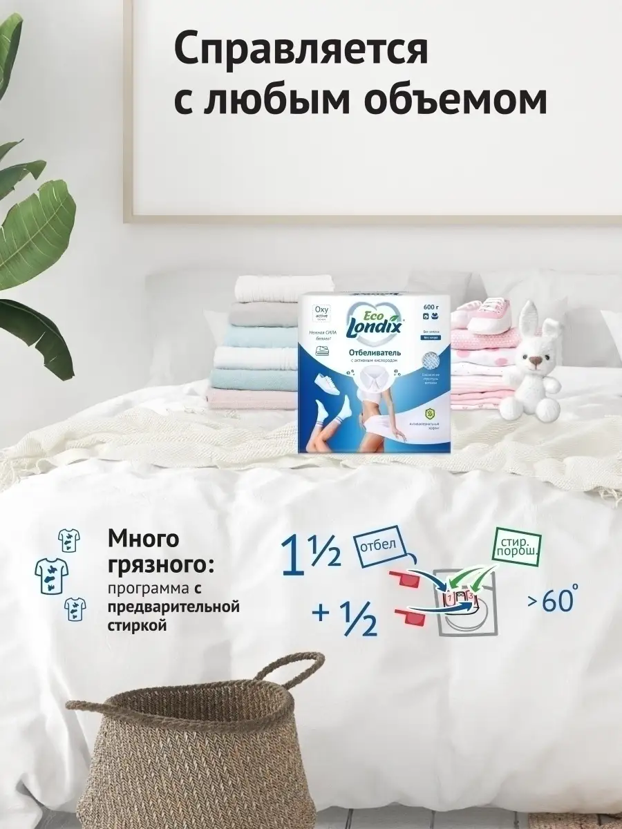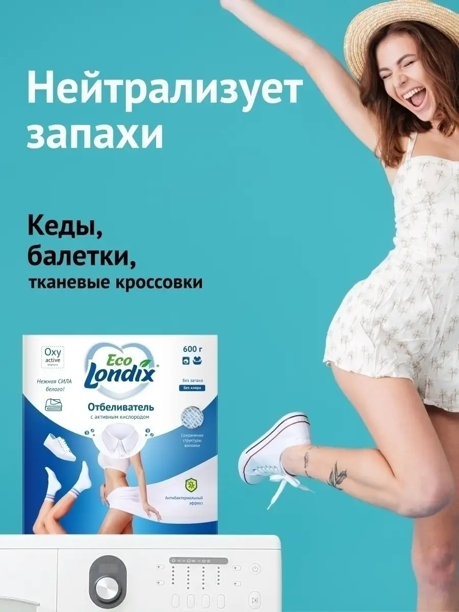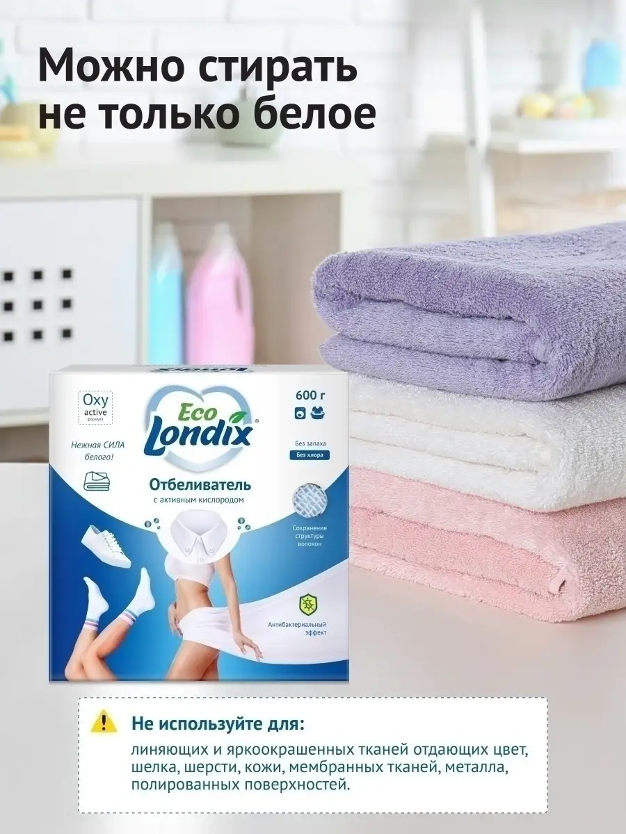 Описание: Универсальный отбеливатель для белья на основе активного кислорода Eco Londix бережно и эффективно возвращает вещам первоначальную белизну, удаляет пятна, обеззараживает, нейтрализует запахи. Он не имеет запаха, безопасен для стирки детского белья с рождения, полностью растворяется в воде и выполаскивается из ткани водой на 100%. Активный кислород проникает глубоко в волокна ткани и, сохраняя структуру волокон, справляется с пятнами от вина, чая, кофе, грязи. Так же, эффективно отстирываются "детские" загрязнения - следы от ягод, фруктов, сока, шоколада. Отбеливатель Londix для белого обладает накопительным эффектом – при регулярной стирке с ним происходит постепенное отбеливание пожелтевшего или посеревшего белья. Области применения универсального отбеливателя Londix в домашнем хозяйстве очень широкие: 1 - замачивание и выведение пятен с белого и светлого белья. 2 - добавление к стиральному порошку в качестве усилителя стирки. 3 - отбеливатель для детского белья 0+. 4 - чистка ванны, кафеля, межплиточных швов, фаянса. 5 - отбеливание тюля, штор, кружев и нижнего белья. Особой популярностью наш отбеливатель пользуется для восстановления цвета белых тканевых кроссовок, кед и балеток. И очистке, с приданием белого цвета, белым подошвам и рантам обуви. Для максимальной эффективности отбеливания рекомендуется следовать инструкции на упаковке и стирать на максимальной температуре, указанной на ярлыке изделия. Наилучший результат достигается при стирке на температуре от 60 градусов. При использовании отбеливателя для одежды не стоит забывать о важных правилах стирки, которые помогут убрать пятна, не испортив ткань: обязательно изучите символы по уходу за текстильными изделиями на вещах. Не используйте отбеливатель для ткани, если его применение не разрешено на бирке. Так как данное средство изначально представляет из себя порошок, при ручной стирке обязательно убедитесь, что отбеливатель в воде растворился полностью и на дне тазика не осталось крупинок. Эко отбеливатель кислородный Лондикс НЕ СОДЕРЖИТ хлора, фосфатов, фосфонатов. Так же отметим, что мы не используем оптические отбеливатели, поэтому отбеливающий эффект с нашим средством реальный, а не обман зрения. Экономичен и безопасен для септиков и систем очистки сточных вод. ЭКО-технология и формула из Германии.