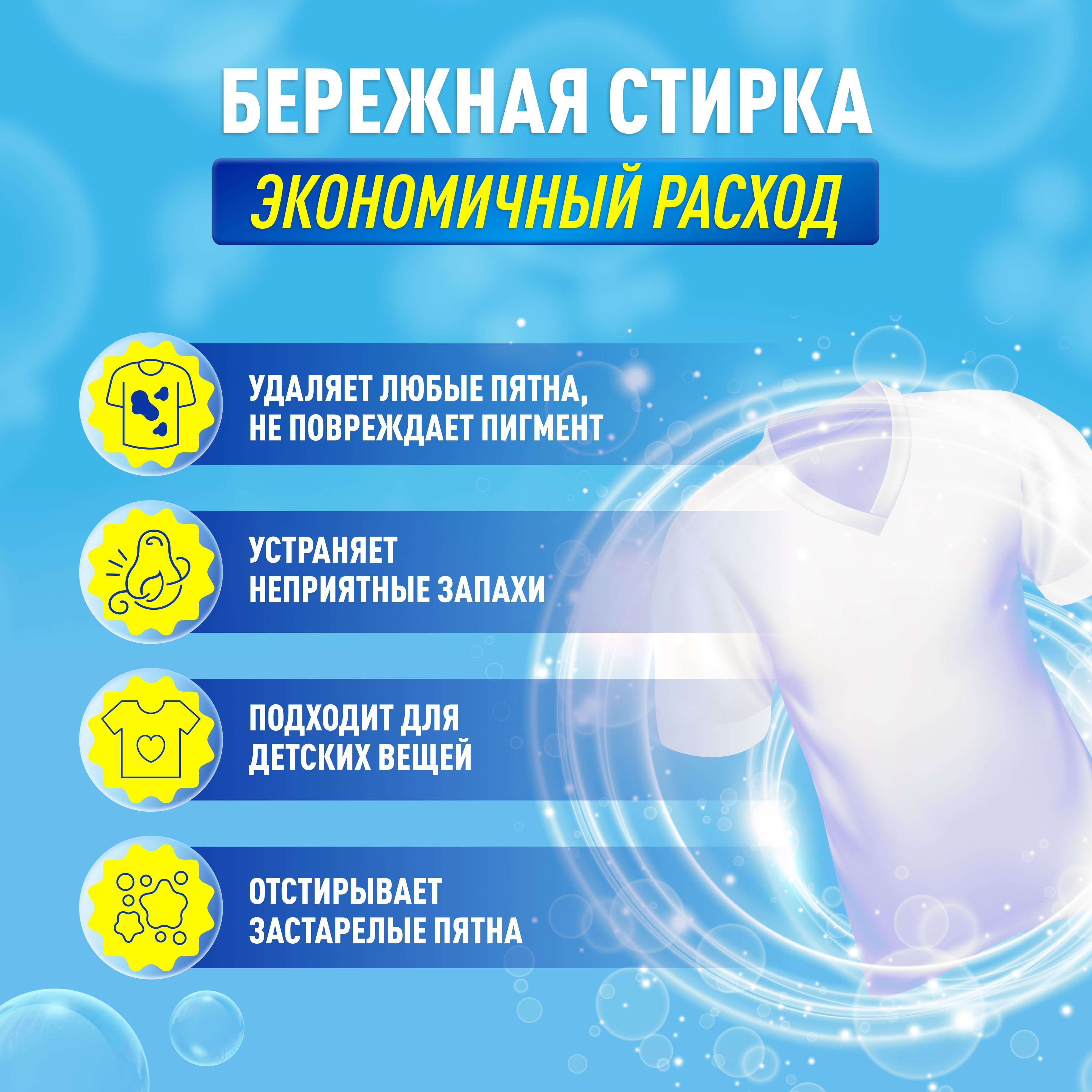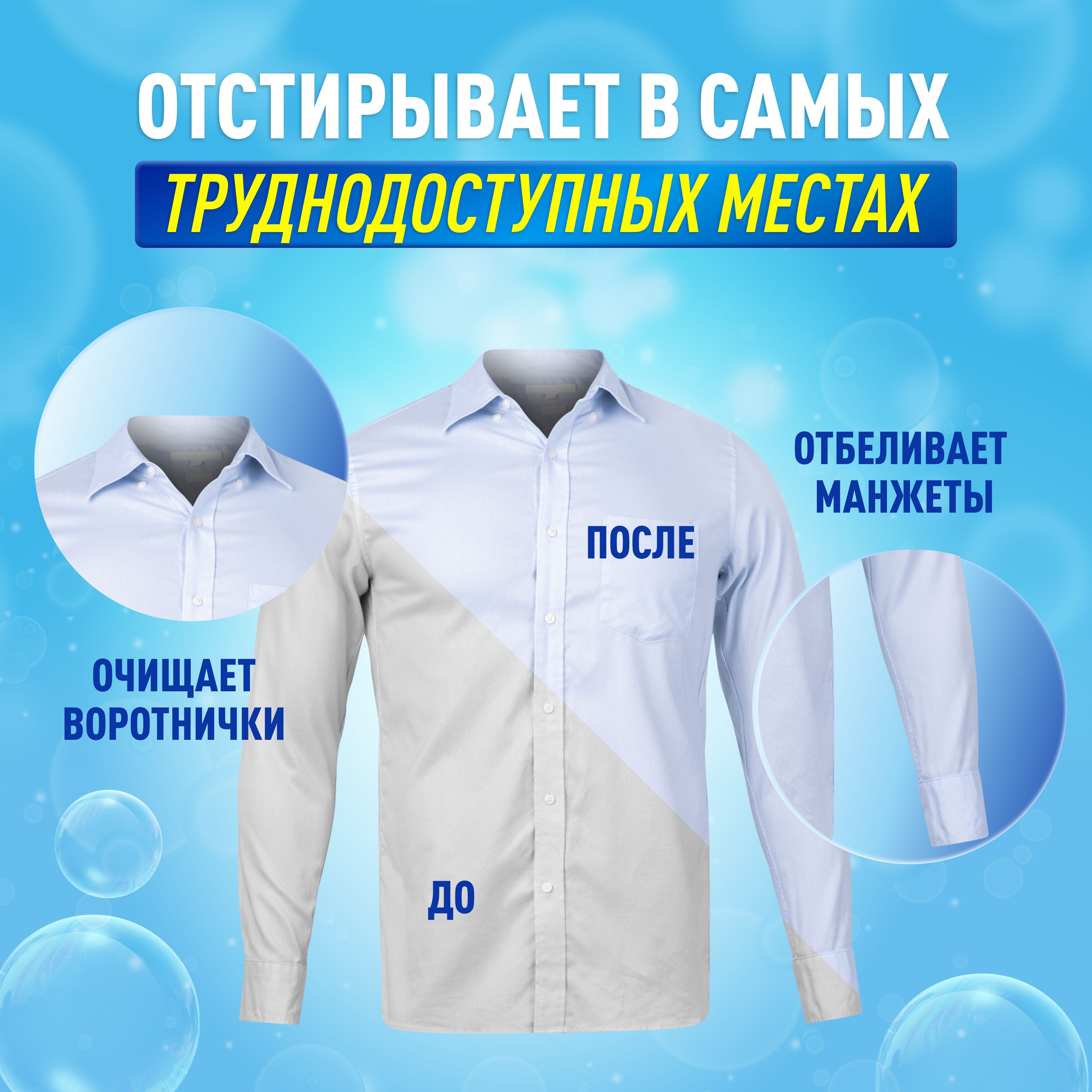 Отбеливает пятна от супа, крови, напитков и еды, а также очищение воротничков и манжет. Обеззараживание одежды.