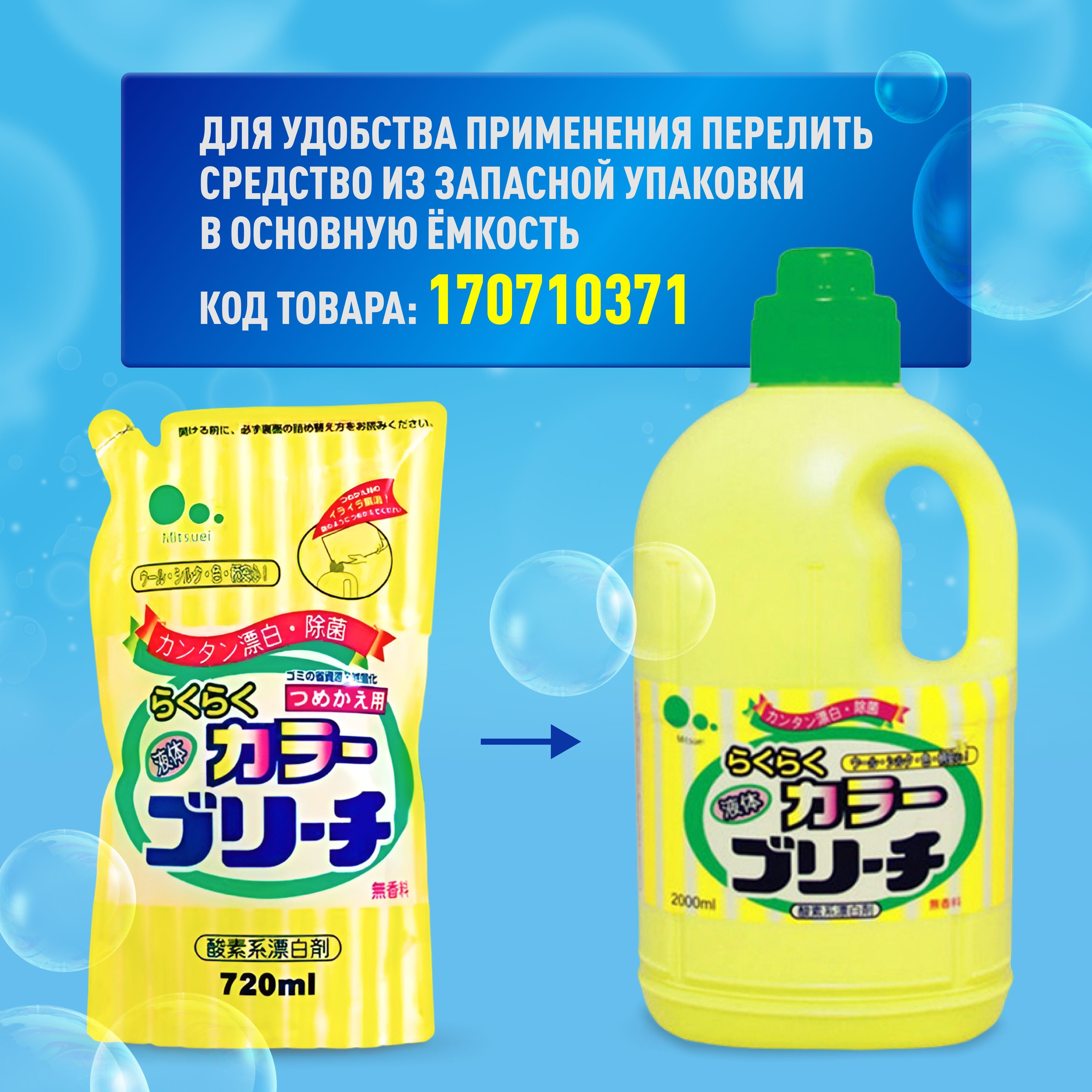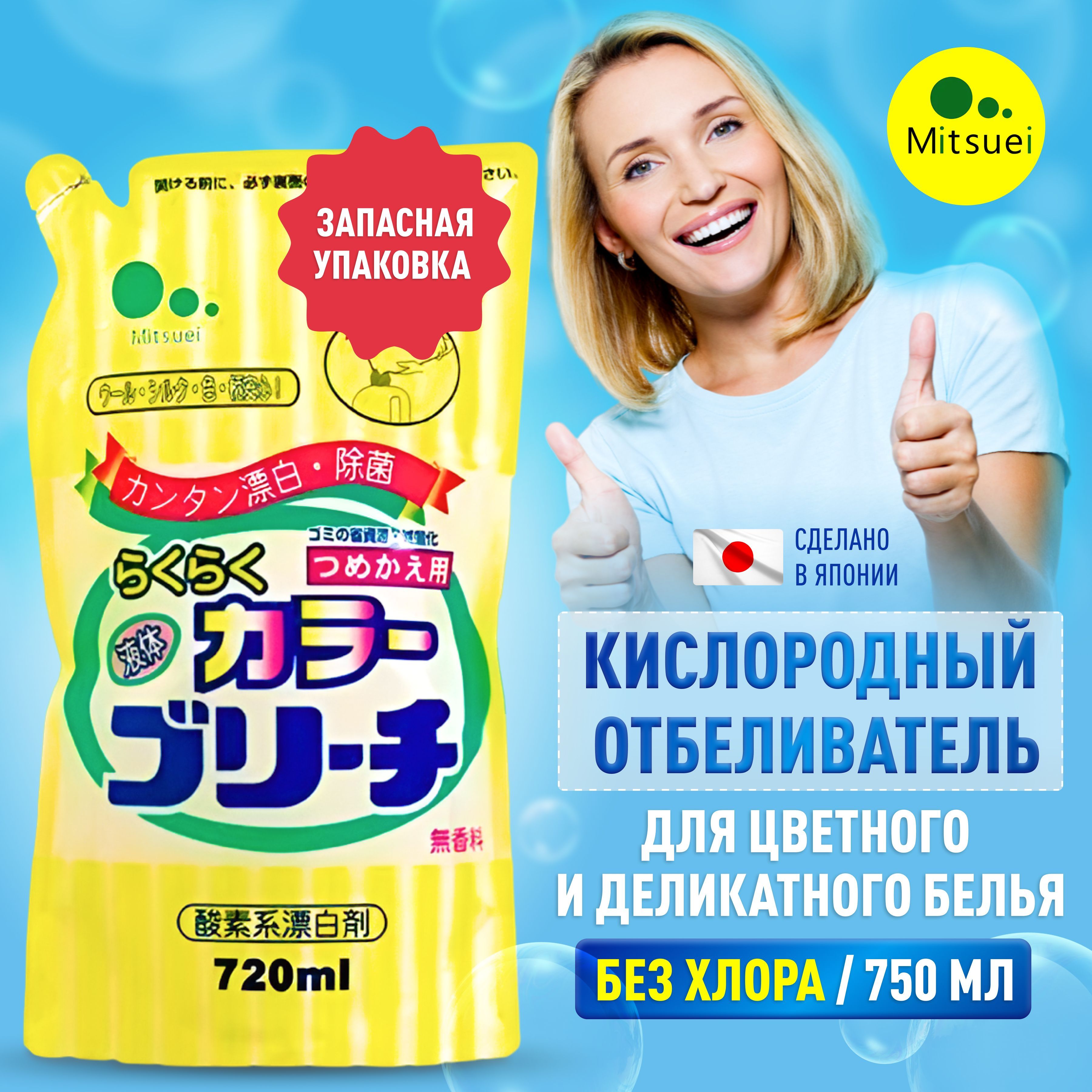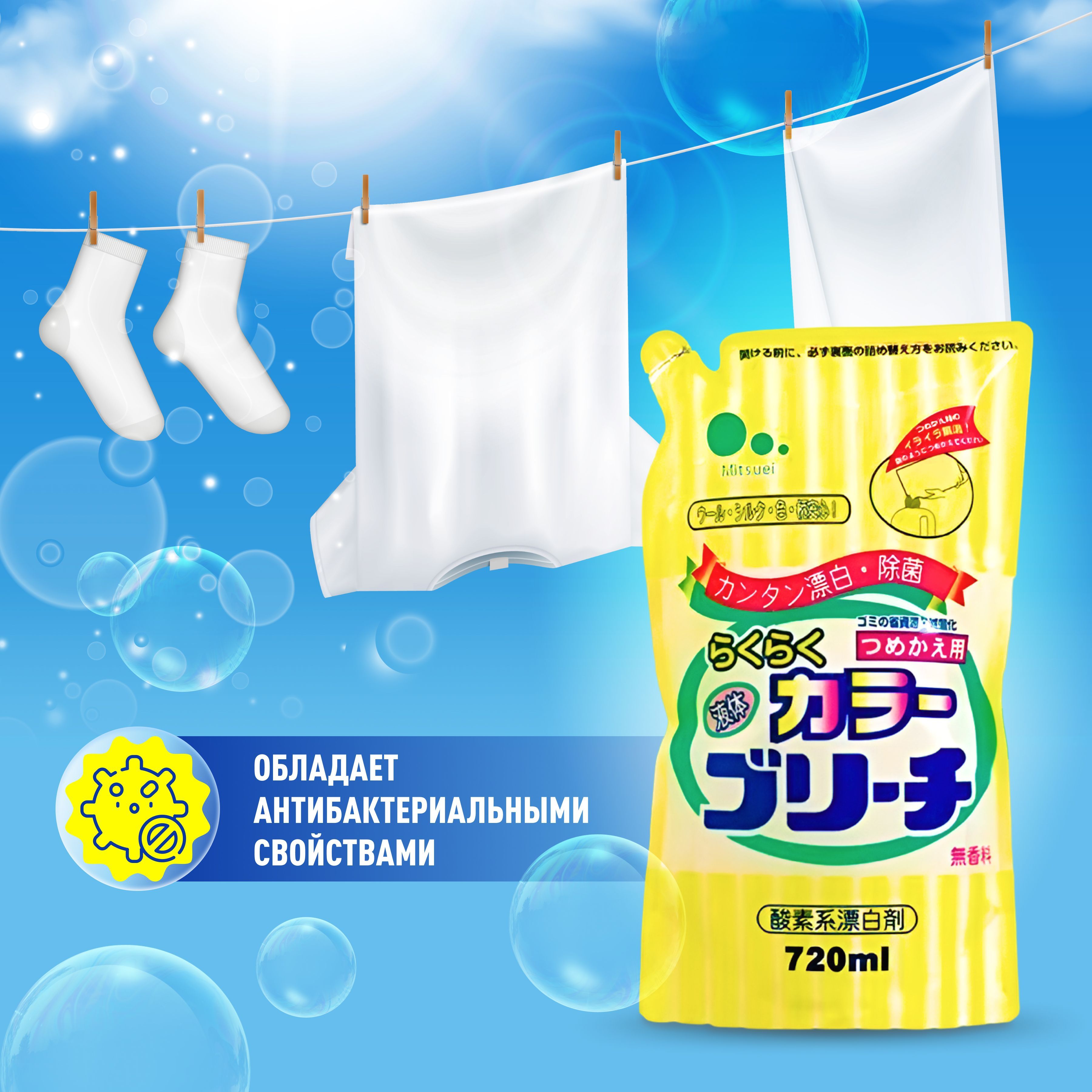 Кислородный отбеливатель Mitsuei Япония для цветного и деликатного для белья, 720 мл, в мягкой упаковке, Жидкий пятновыводитель для стирки вещей без хлора