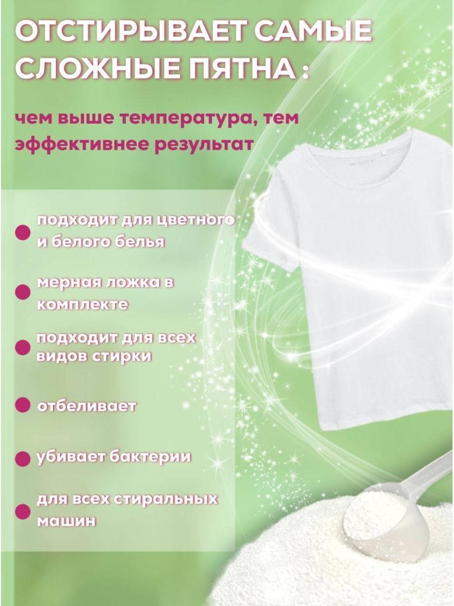 Описание: Отбеливатель кислородный для всего — это универсальное многофункциональное чистящее средство, которое особенно действенно борется с пятнами, а также отбеливает при стирке одежду. Средство абсолютно экологичное и безопасное полезное для применения целого ряда задач, поэтому необходим в любом хозяйстве. Немаловажно то что, этот натуральный продукт повышает эффективность стирального порошка, а также его можно применять не только для стирки, но и для мытья посуды, для удаления застаревших и сложных загрязнений. Эффективен при температуре воды не менее 90С и даже в холодной воде благодаря высокому содержанию активного кислорода. Отбеливатель для белья энергично проникает в волокна ткани и устраняет въевшуюся грязь пятна от кофе, сока, ягод и жира. Отбеливатель для белого убирает желтизну и серость с белых тканей и восстанавливает яркость цветным. Гипоаллергенно можно применять для детских вещей порошок хорошо выполаскивается из ткани не портит и не разрушает её даже после многократных стирок. Не имеет в составе хлор, а так же является дезинфицирующим и антибактериальным. Не содержит токсических и ядовитых веществ, опасных для кожи и органов дыхания, полностью разлагается в окружающей среде, а это значит, что его можно использовать для мытья посуды, может применяться в автоматических посудомоечных машинах Он прекрасно очистит кафель, удалит плесень и грибок, очищать ковры и обивку мягкой мебели. Важно соблюдать меры предосторожности!