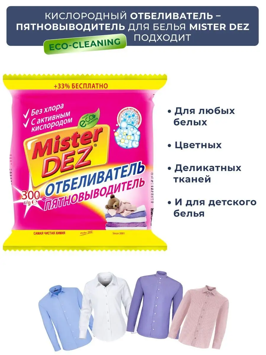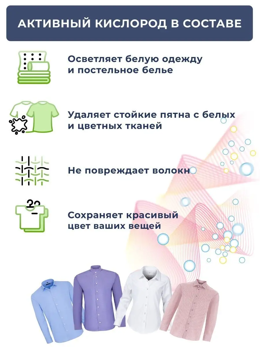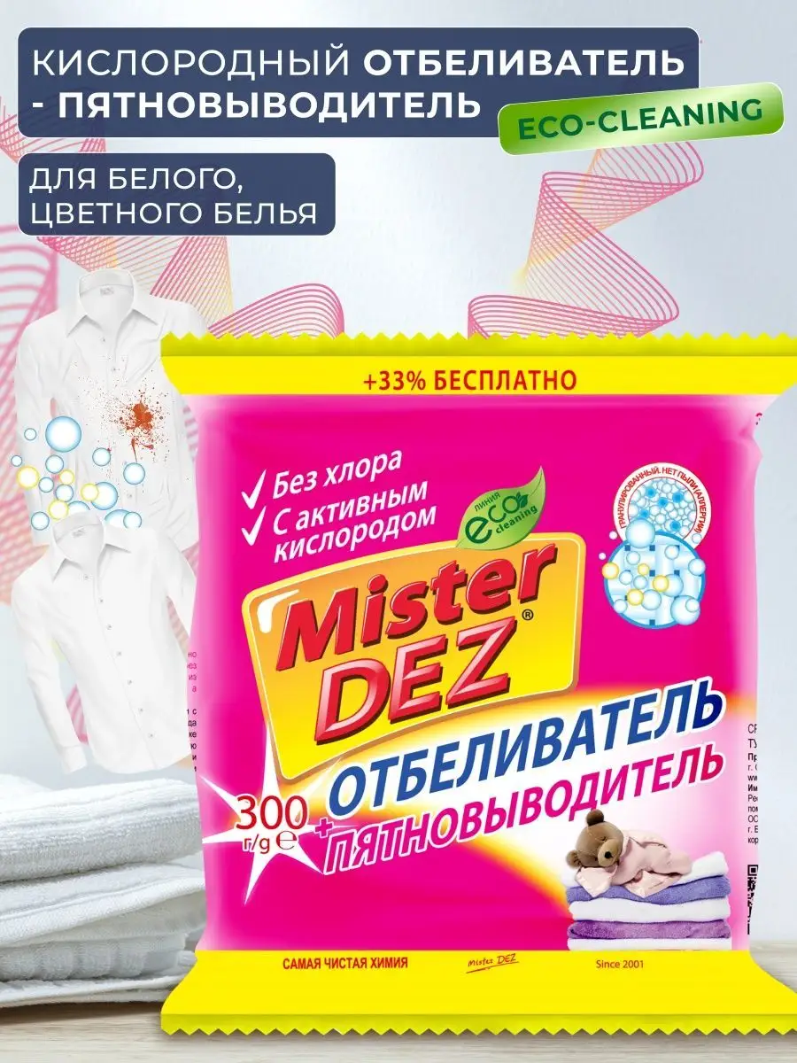 Описание: Пятна на одежде могут легко испортить Вам настроение. Кислородный отбеливатель – пятновыводитель для белья Mister Dez Eco-Cleaning – это быстрое и простое решение проблемы. Средство специально разработано для эффективного удаления различных пятен и стойких загрязнений, а также для безупречного отбеливания тусклых и пожелтевших вещей. Универсальное средство не содержит хлора и безопасно для ваших вещей и здоровья. Активный кислород в составе осветляет белую одежду и постельное белье, удаляет пятна с белых и цветных тканей, не повреждает волокна, сохраняет красивый цвет ваших вещей. Комплекс энзимов эффективно удаляет загрязнения белкового происхождения. Уникальная формула позволяет справиться с широким спектром пятен: вино, кофе, кровь, жирные соусы, въевшаяся грязь, следы от травы, ягод. Кислородный отбеливатель – пятновыводитель для белья Mister Dez Eco-Cleaning подходит для любых белых, цветных, деликатных тканей, а также для детского белья. Эффективен уже при +40 °C. Устраняет неприятные запахи, обладает дезинфицирующими свойствами. Для ручной и машинной стирки. Не вызывает коррозию внутренних элементов стиральных машин. Гранулированная форма не пылит и не раздражает слизистую носа при вдыхании. Товар сертифицирован. Входит в линейку Eco Cleaning - не содержит вредные и опасные для окружающей среды химические вещества. Поставка от производителя. Состав: 30% и более содосульфатная смесь; 15% и более, но менее 30% перкарбонат натрия; менее 5%: триполифосфат натрия, хлорид натрия, А-ПАВ, энзимы, ТАЕД-усилитель стирального порошка, оптический отбеливатель.