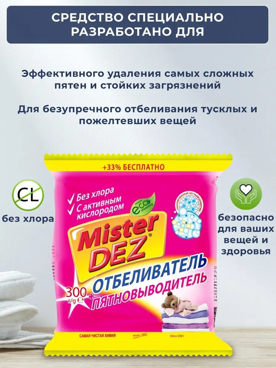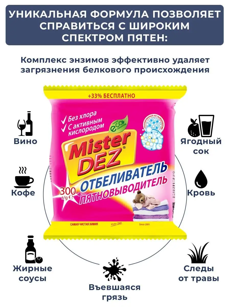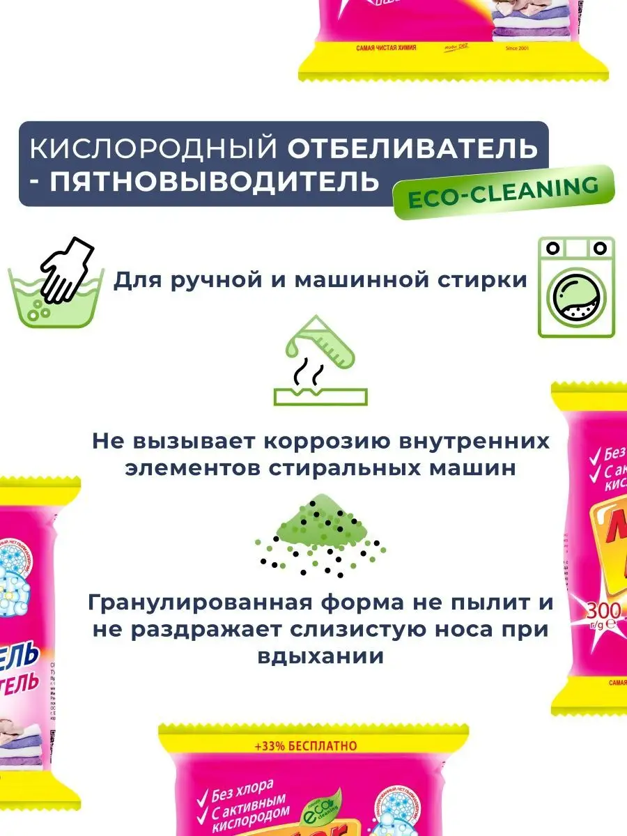 Описание: Пятна на одежде могут легко испортить Вам настроение. Кислородный отбеливатель – пятновыводитель для белья Mister Dez Eco-Cleaning – это быстрое и простое решение проблемы. Средство специально разработано для эффективного удаления различных пятен и стойких загрязнений, а также для безупречного отбеливания тусклых и пожелтевших вещей. Универсальное средство не содержит хлора и безопасно для ваших вещей и здоровья. Активный кислород в составе осветляет белую одежду и постельное белье, удаляет пятна с белых и цветных тканей, не повреждает волокна, сохраняет красивый цвет ваших вещей. Комплекс энзимов эффективно удаляет загрязнения белкового происхождения. Уникальная формула позволяет справиться с широким спектром пятен: вино, кофе, кровь, жирные соусы, въевшаяся грязь, следы от травы, ягод. Кислородный отбеливатель – пятновыводитель для белья Mister Dez Eco-Cleaning подходит для любых белых, цветных, деликатных тканей, а также для детского белья. Эффективен уже при +40 °C. Устраняет неприятные запахи, обладает дезинфицирующими свойствами. Для ручной и машинной стирки. Не вызывает коррозию внутренних элементов стиральных машин. Гранулированная форма не пылит и не раздражает слизистую носа при вдыхании. Товар сертифицирован. Входит в линейку Eco Cleaning - не содержит вредные и опасные для окружающей среды химические вещества. Поставка от производителя. Состав: 30% и более содосульфатная смесь; 15% и более, но менее 30% перкарбонат натрия; менее 5%: триполифосфат натрия, хлорид натрия, А-ПАВ, энзимы, ТАЕД-усилитель стирального порошка, оптический отбеливатель.