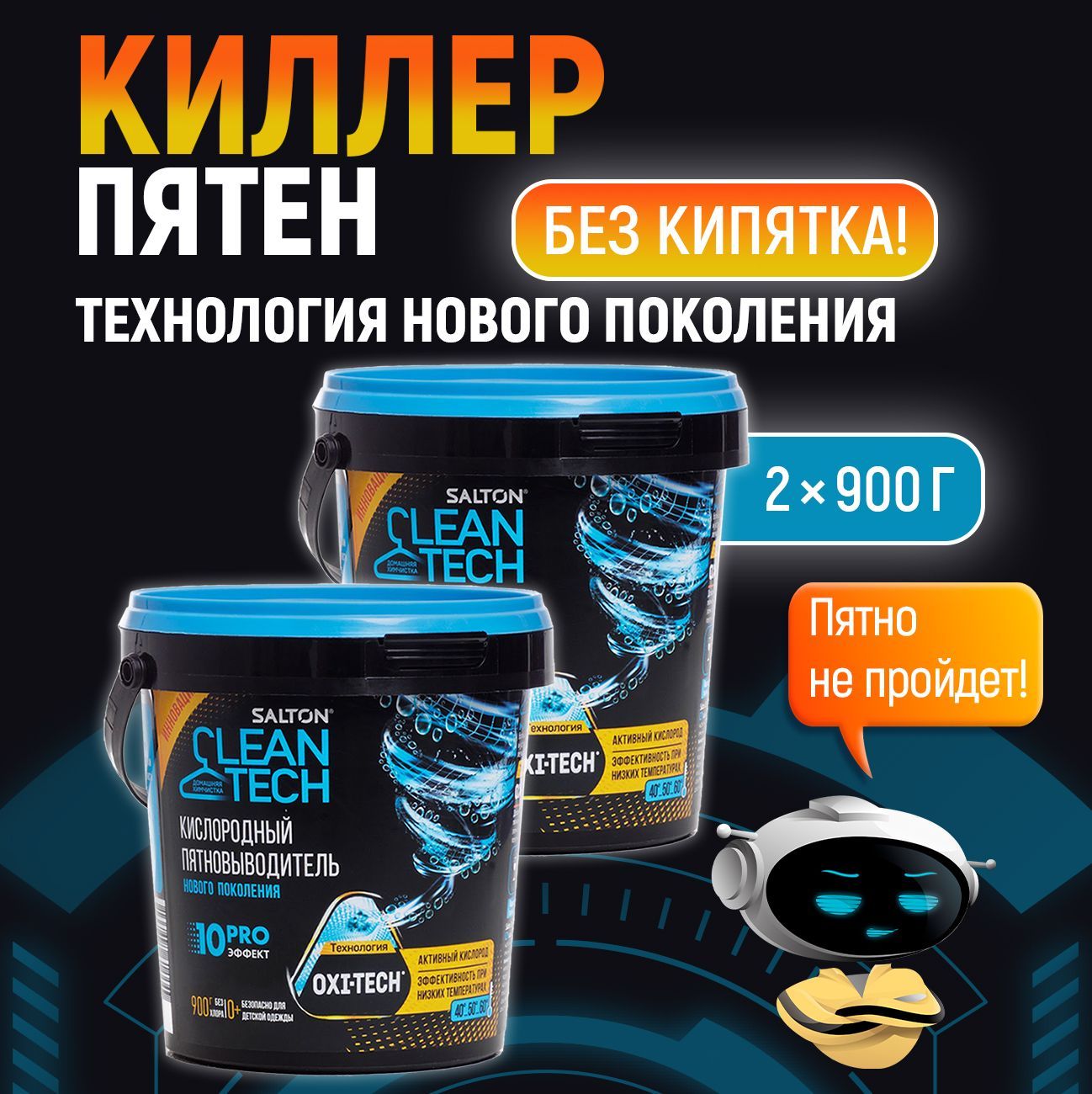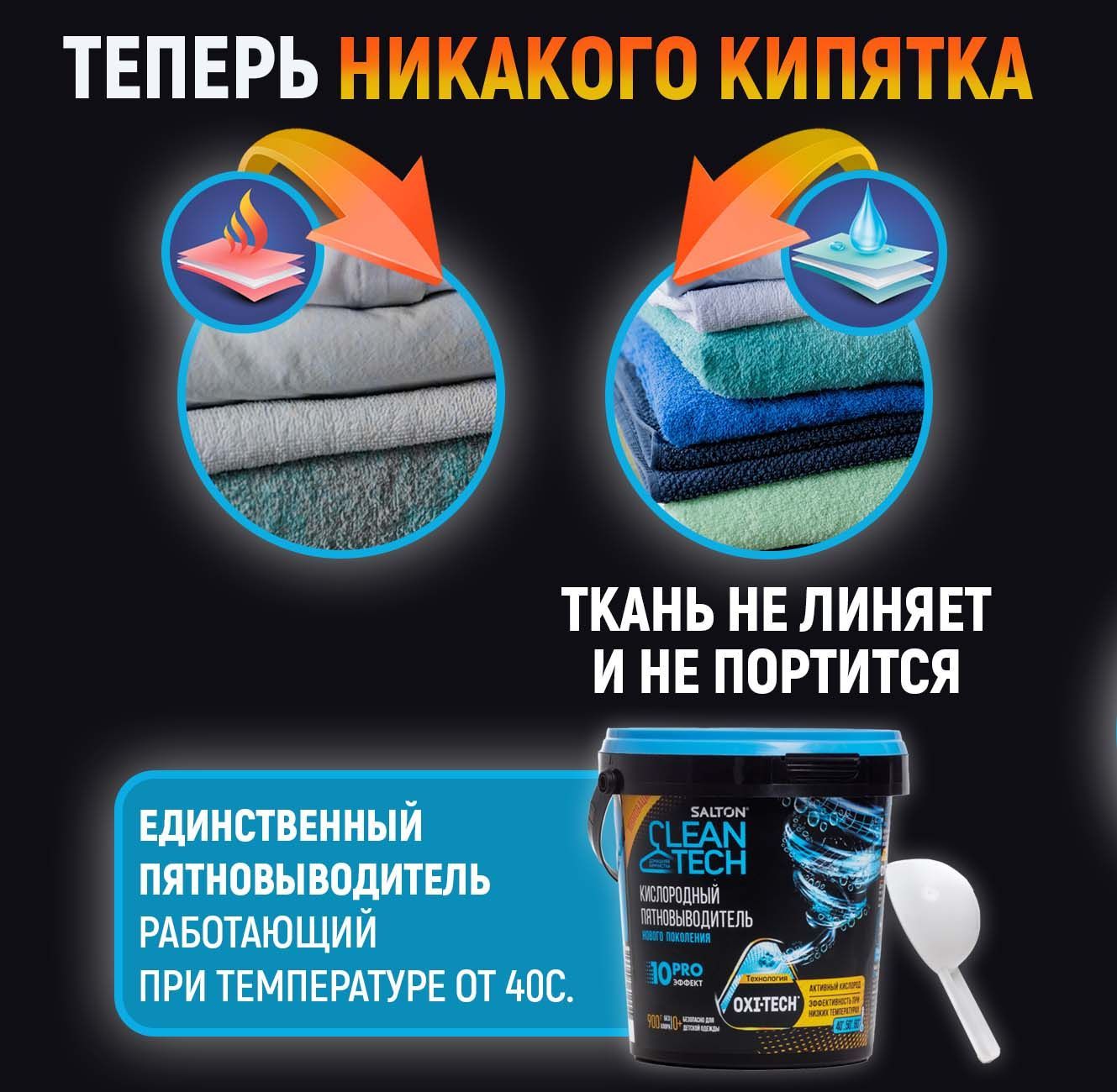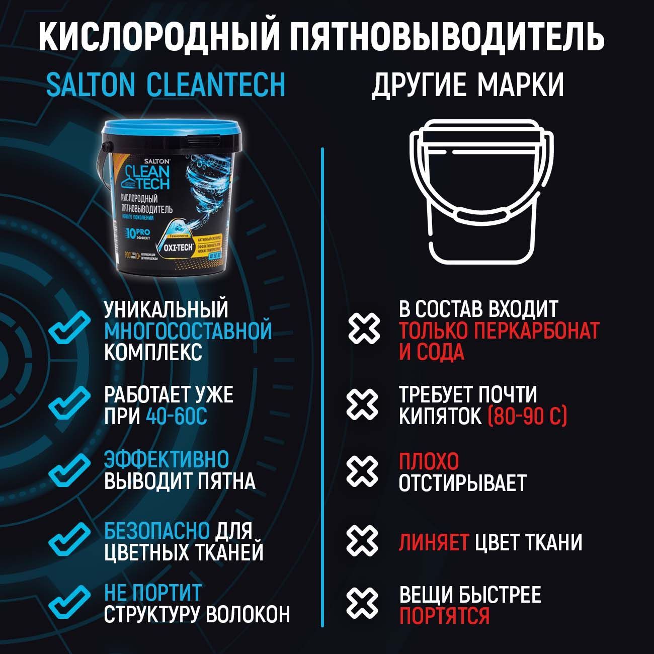 Описание: Снова переживаете из-за случайно поставленных на одежду пятен? Тратите уйму времени и сил на постоянное застирывание? Не стоит! От лишних хлопот поможет избавить новый универсальный кислородный пятновыводитель нового поколения Salton CleanTech, который с легкостью решает сразу несколько проблем. Этот уникальный чистящий порошок от пятен действует в десяти направлениях: эффективно и бережно устраняет большинство трудновыводимых пятен, отбеливает, освежает белье, безопасен для стирки детской одежды, для белых и цветных тканей, без хлора, SLS и фосфатов, нейтрализует неприятные запахи, а также усиливает действие любых других стиральных средств, легко очищает поверхности, удаляет жир.
