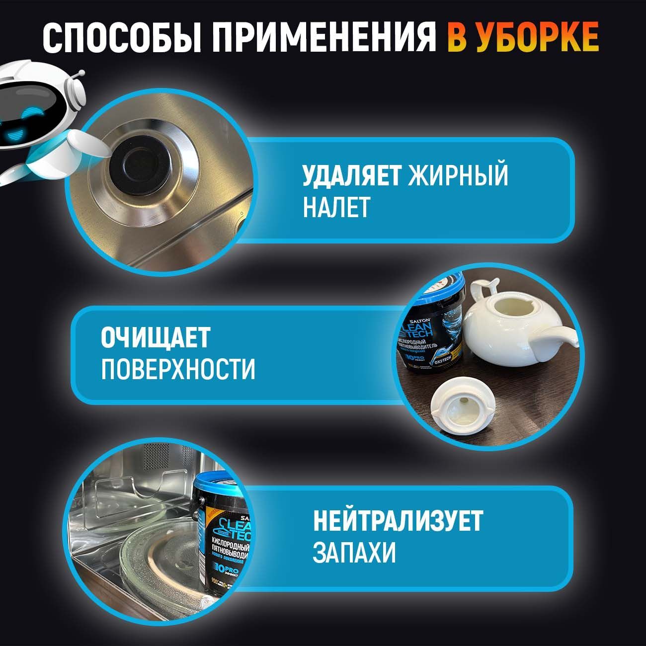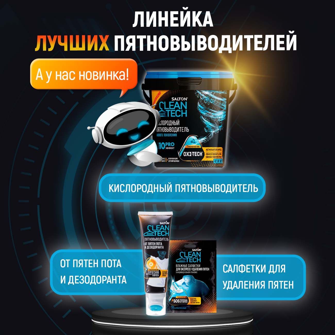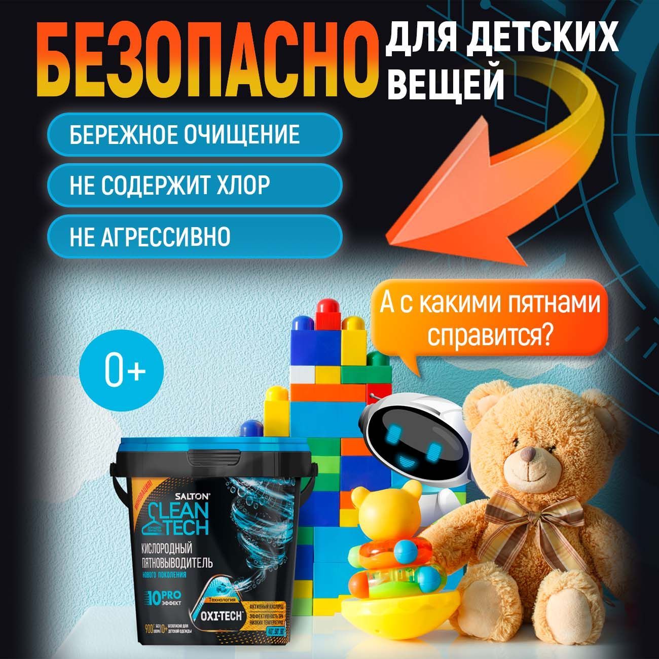 Описание: Снова переживаете из-за случайно поставленных на одежду пятен? Тратите уйму времени и сил на постоянное застирывание? Не стоит! От лишних хлопот поможет избавить новый универсальный кислородный пятновыводитель нового поколения Salton CleanTech, который с легкостью решает сразу несколько проблем. Этот уникальный чистящий порошок от пятен действует в десяти направлениях: эффективно и бережно устраняет большинство трудновыводимых пятен, отбеливает, освежает белье, безопасен для стирки детской одежды, для белых и цветных тканей, без хлора, SLS и фосфатов, нейтрализует неприятные запахи, а также усиливает действие любых других стиральных средств, легко очищает поверхности, удаляет жир.