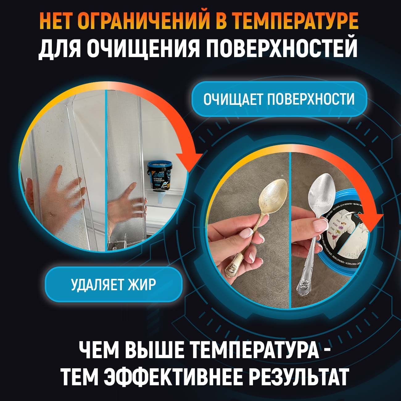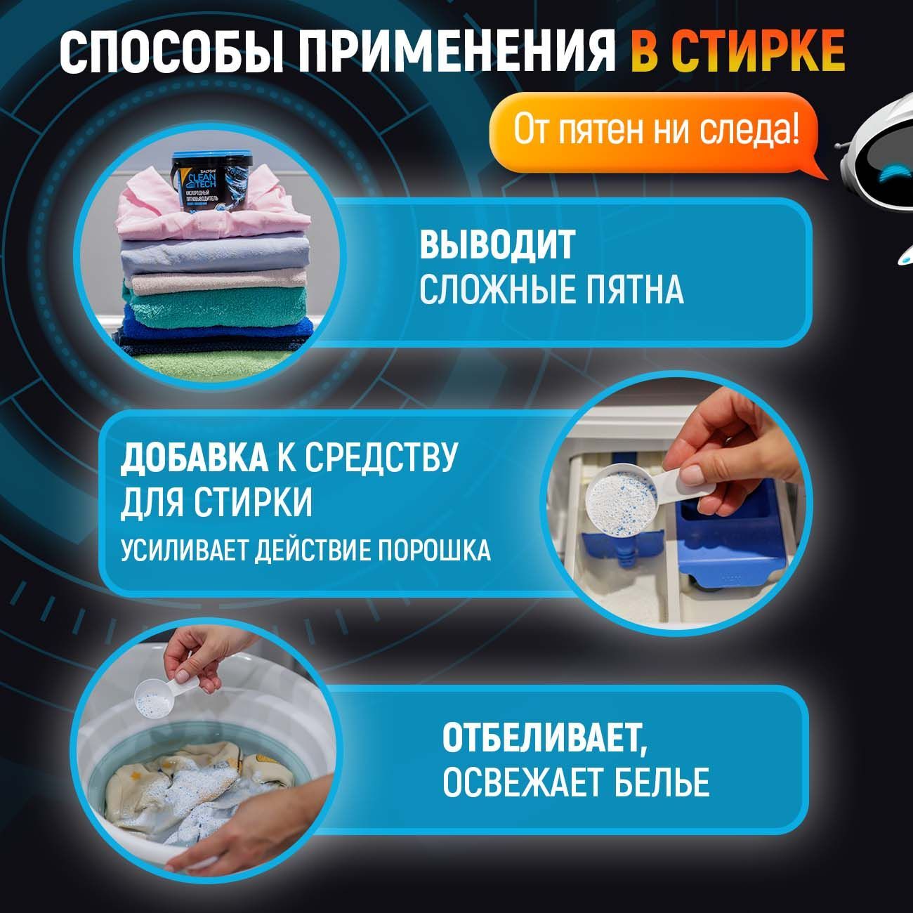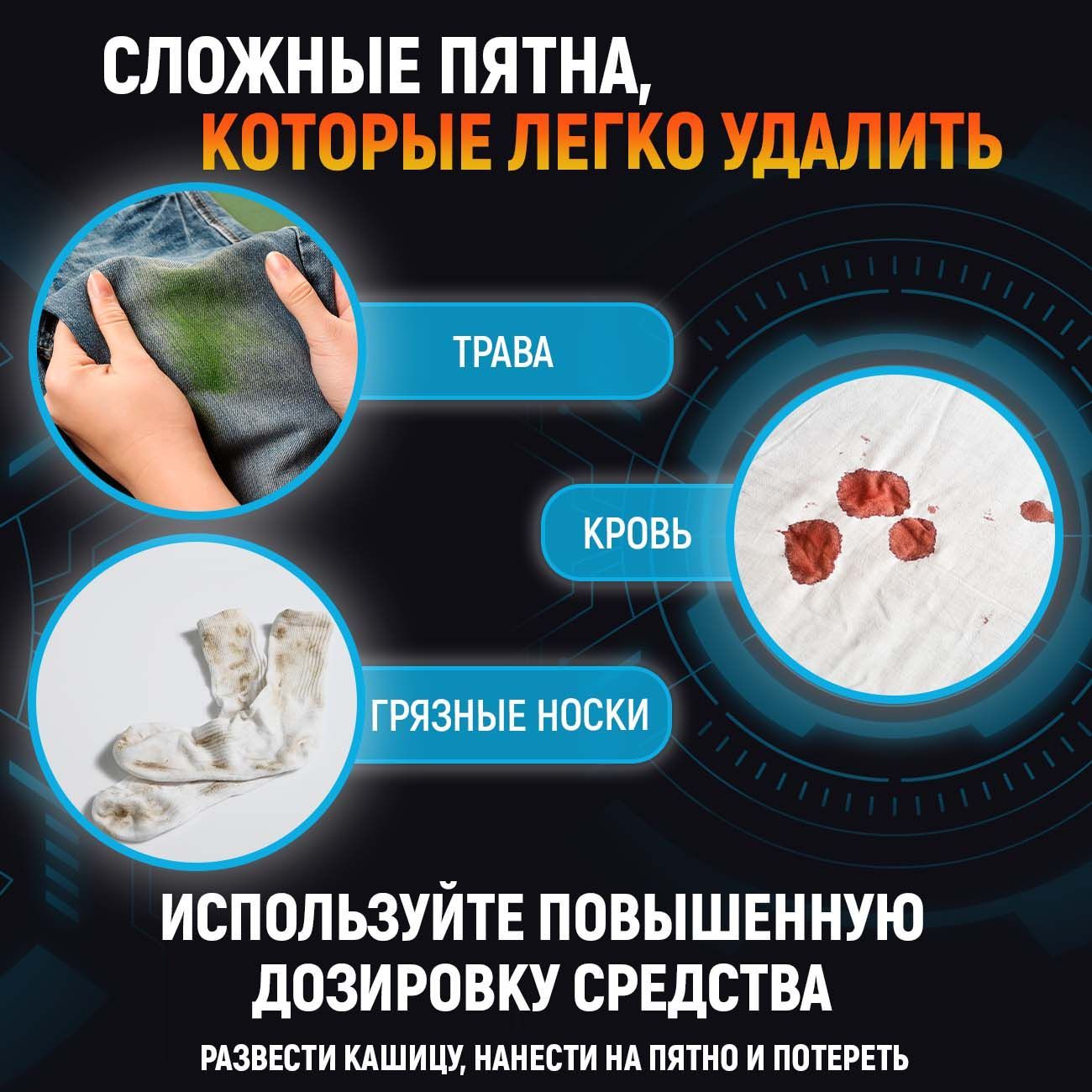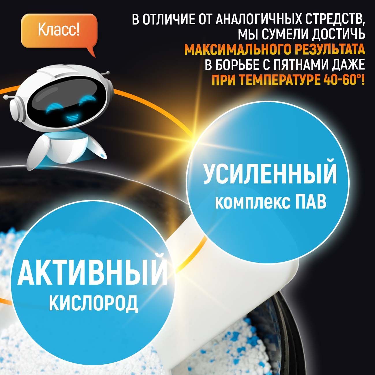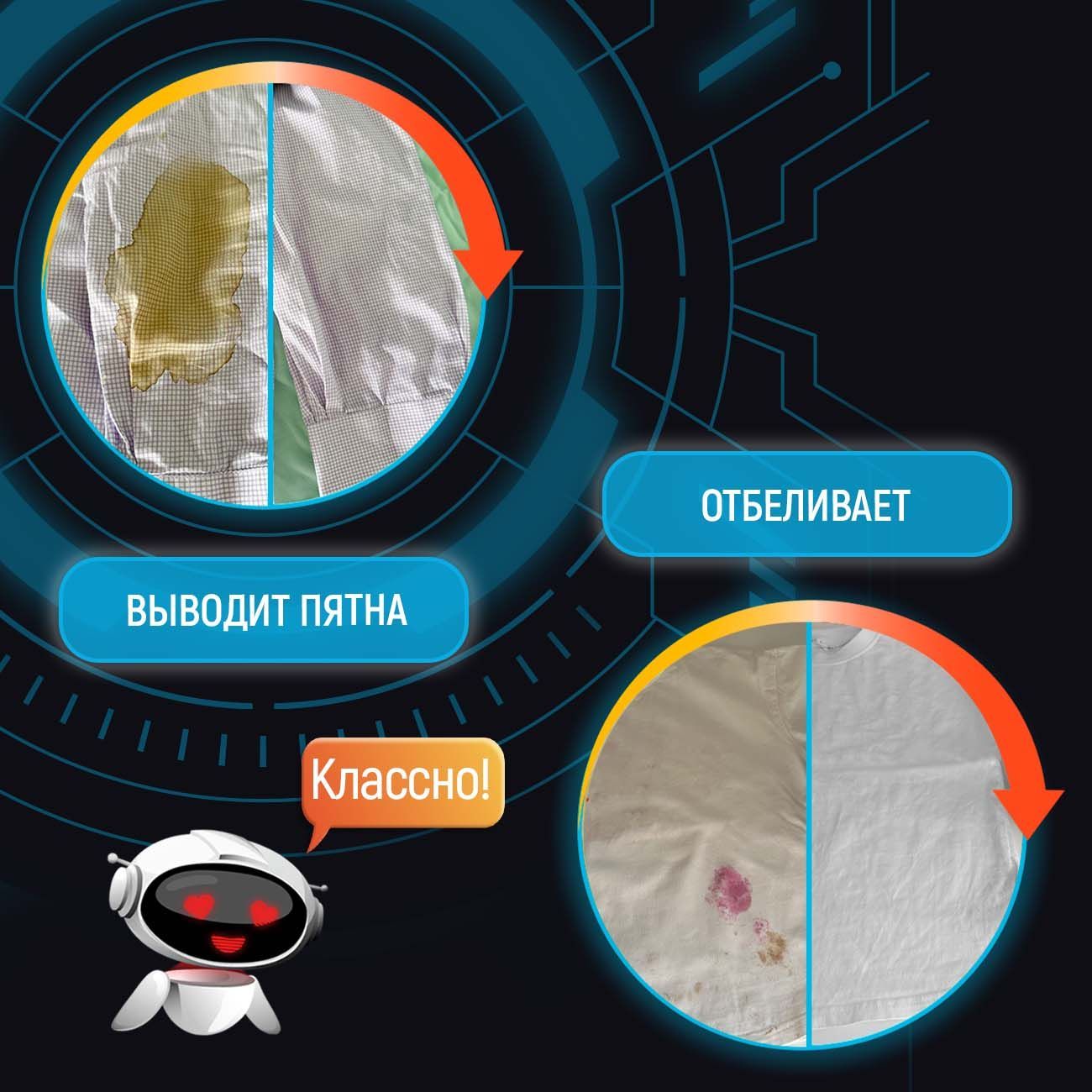 Благодаря высокой концентрации активного кислорода быстро удаляет самые частые и сложные пятна: от ягод, варенья, травы, чая, кофе, вина, фруктов, овощей, сока, горчицы, крови и многие другие.