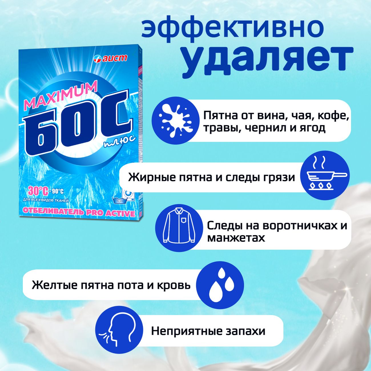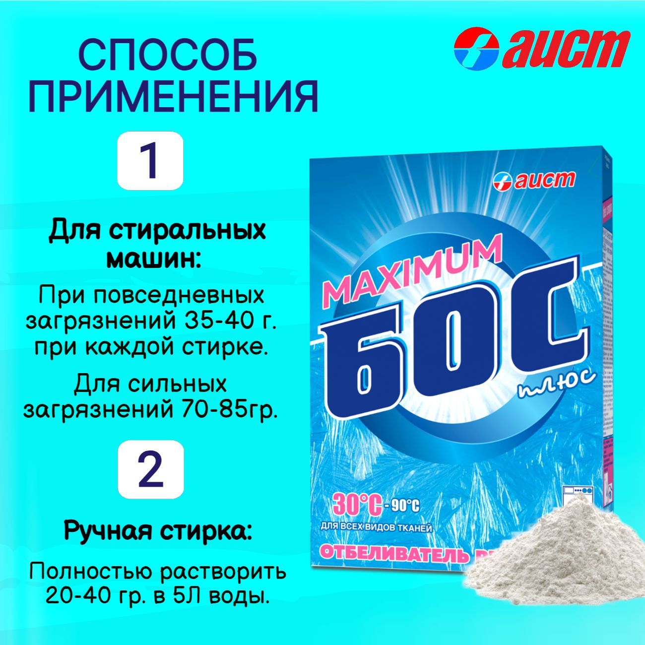 Усиленная формула oxigen отбеливатель для белья БОС - ПЛЮС Maximum oxygen с большим составом активного кислорода специально разработана для отбеливания тканей, включая шёлк и шерсть, а также детского белья baby при температурах 30С - 50С. Эффективного удаляет самые сложные пятна и стойкие загрязнения, а также для безупречно отбеливает тусклые и пожелтевшие вещи доя дома. Действует как пятновыводитель, перкарбонат натрия удаляет самые сложные пятна. Бос перкарбонат натрия 100% справится со следами от вина, кофе, крови, жирных соусов, въевшейся грязи, шторы цветные, травы, ягод. Отбеливатель для уборки. Мягкое средство eco товары воздействует на волокна, поэтому ткань не желтеет, стирка не деформируется и не теряет прочность. Бос отбеливатель для белого рекомендует для применения как добавка с моющими средствами в стиральной машине или замачивания.