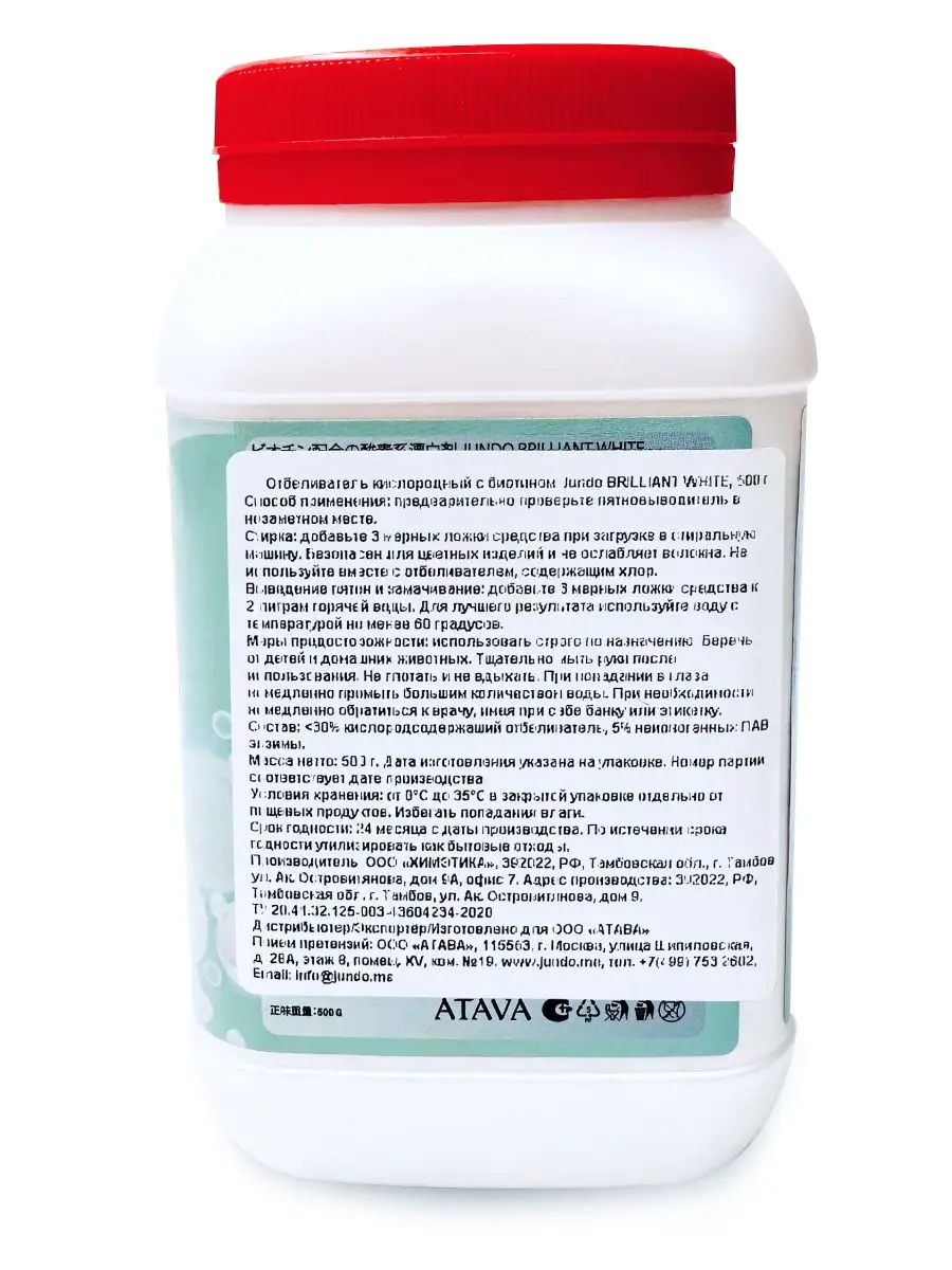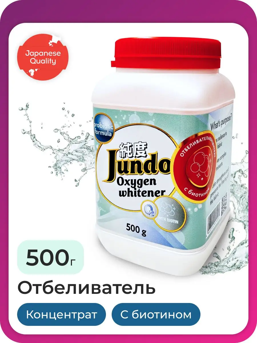 Описание: Кислородный отбеливатель пятновыводитель Jundo BRILLIANT WHITE бережно и эффективно удаляет въевшиеся пятна, придает сияние белым вещам, не повреждая структуру ткани, даже при частых стирках. Активный кислород проникает глубоко в волокна ткани и легко справляется с пятнами от тональных средств, помады, кофе, вина, шариковой ручки, йода, зелёнки, крови, жирных пятен, травы, пищи и жевательной резинки. Биотин в составе средства укрепляет ткани и препятствует их износу от частых стирок. Использование универсального порошка очистителя позволяет добиваться высоких результатов стирки даже при низких температурах. Помимо этого, удалитель пятен может быть использован для усиления действия стирального порошка или геля. В составе концентрата уникальные добавки, которые защищают ткань от повреждения во время стирки и делают его очень бережным к одежде. Это делает отбеливатель для стирки одним из наиболее надежных кислородных отбеливателей на рынке. Средство отлично возвращает ткани первоначальный цвет ткани, делает белье более свежим и приятным на ощупь. Не содержит хлора, за счет чего одежда не теряет цвет. Не содержит отдушек, благодаря чему безопасен для аллергиков и новорожденных. Он бережно относится как к вещам из синтетики, так и из хлопковой ткани. Этим отбеливателем можно мыть раковины, ванны, кафельную плитку, ламинат – он прекрасно справляется даже с застарелыми пятнами, одновременно создавая ощущение свежести и чистоты. Способ применения: предварительно проверьте пятновыводитель в незаметном месте. Стирка: добавьте 3 мерных ложки средства при загрузке в стиральную машину. Безопасен для цветных изделий и не ослабляет волокна. Не используйте вместе с отбеливателем, содержащим хлор. Выведение пятен и замачивание: добавьте 3 мерных ложки средства к 2 литрам горячей воды. Для лучшего результата используйте воду с температурой не менее 60 градусов. Перкарбонат для белья Джундо является надежным средством для отбеливания, которое гарантирует безупречную чистоту и свежесть вашего белья. Отбеливатель кислородный для белья подходит для замачивания детской одежды. Средство для стирки работает как отбеливатель для кроссовок. Моющее средство может использоваться как для предварительного замачивания белья, так и для стирки вместе со стиральным порошком для удаления сложных пятен. Не рекомендуем использовать для изделий из шерсти, шелка, пуха и пера, кожи, замши, нубука, мембранных тканей, меди, алюминия. Средство предназначено специально для легкого и эффективного отбеливания Ваших вещей. Jundo - заботясь о семье, не забывайте о себе!