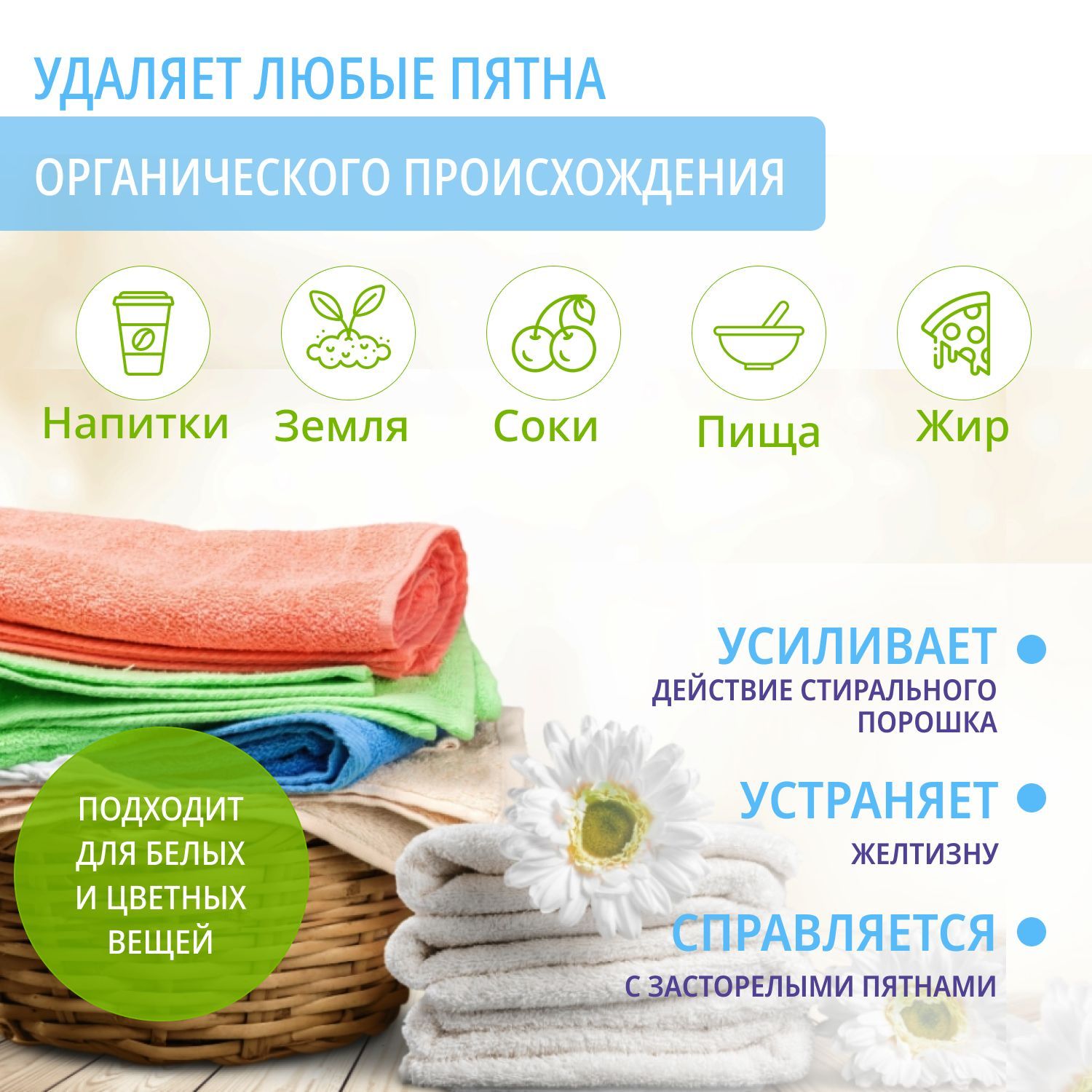 Эффективно удаляет пятна от чая, соков фруктов, жира, ягод, травы и множества других въевшихся пятен..
