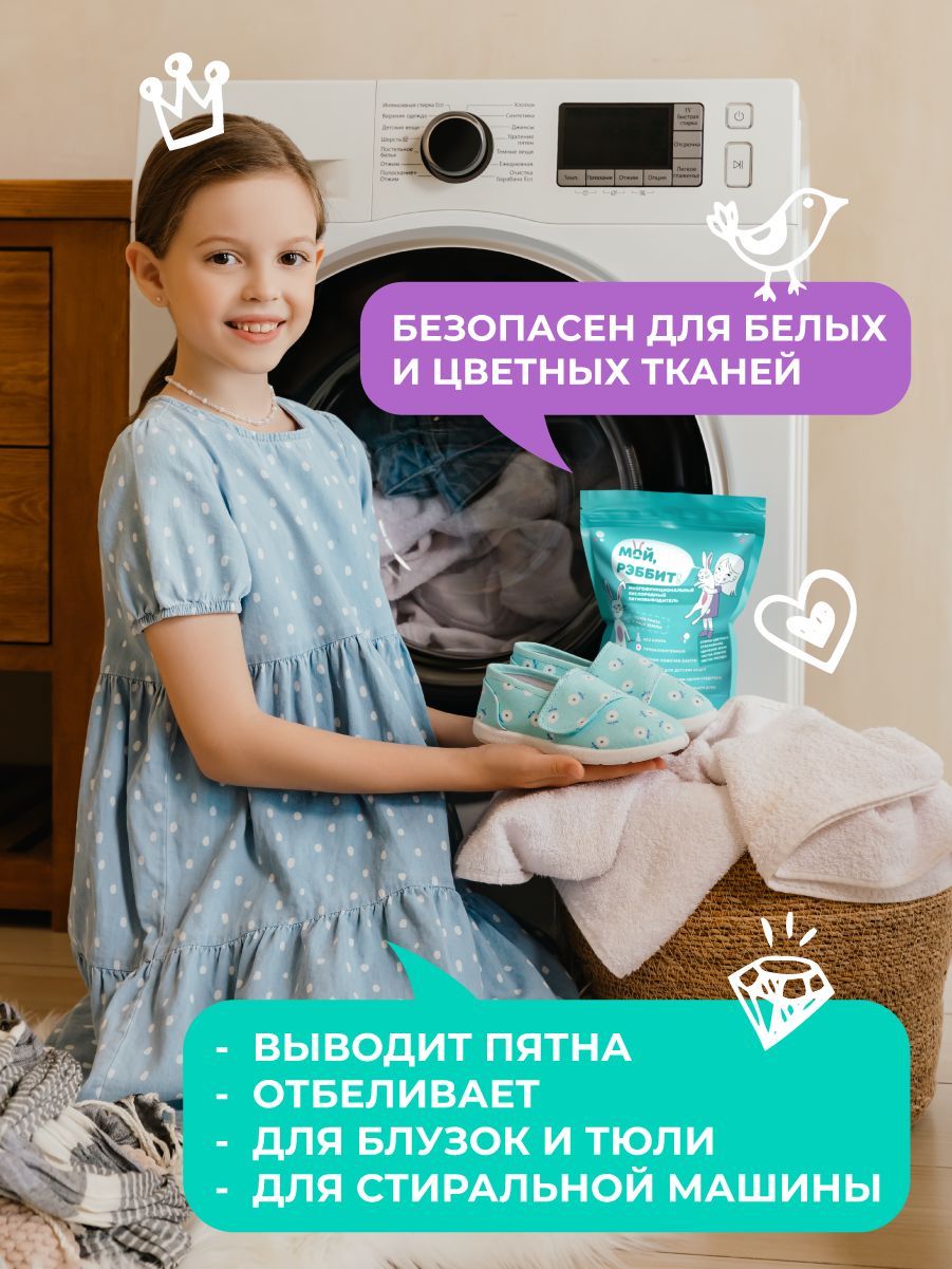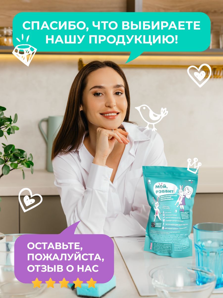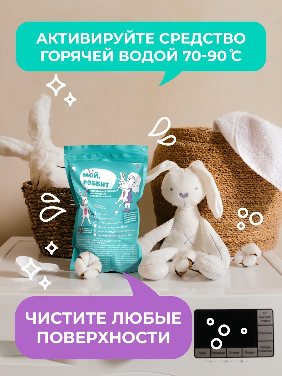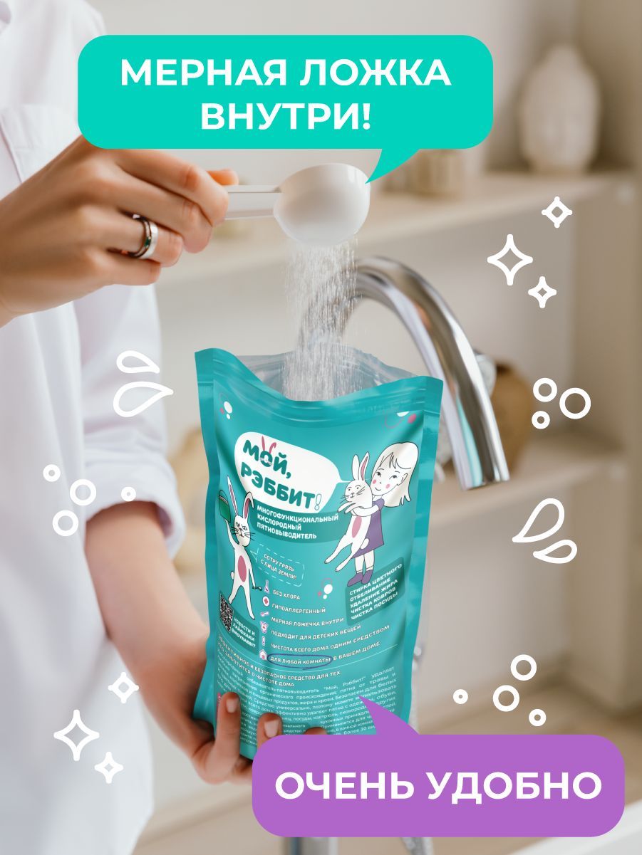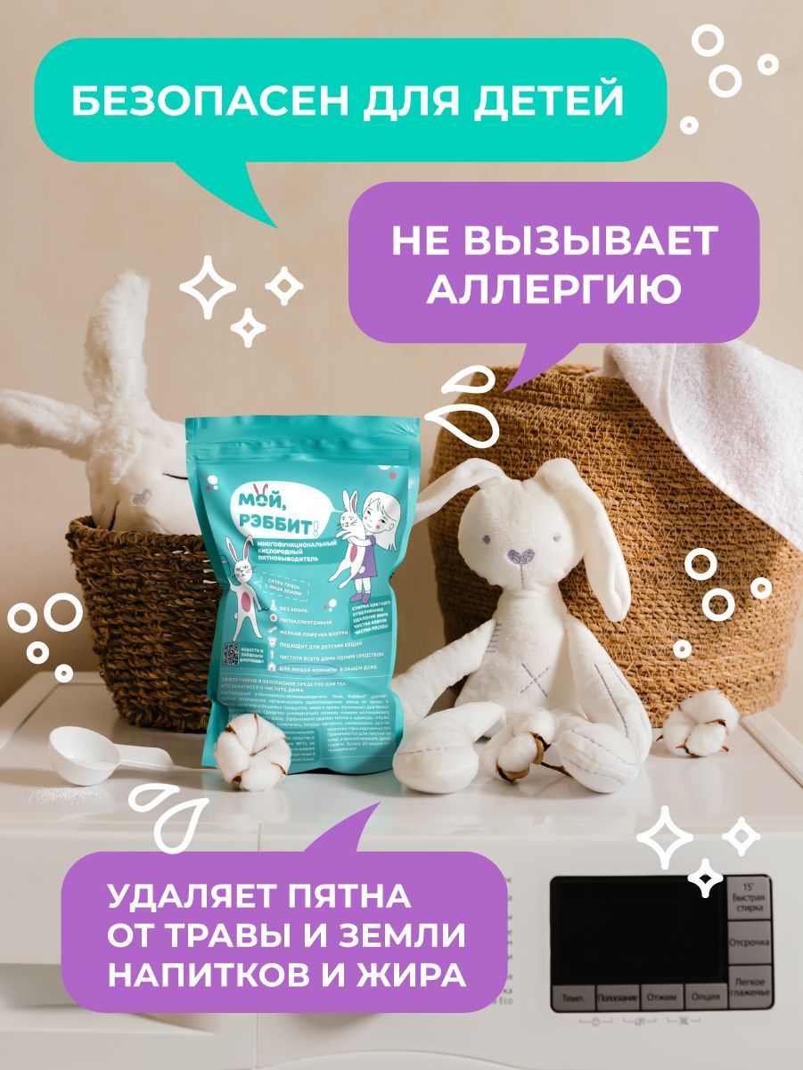🕊️ Помимо очищения, "Мой, Рэббит!" дезинфицирует и удаляет неприятные запахи. Средство абсолютно безопасно для всех - в его составе нет хлора. Гипоаллергенный ЭКО-порошок, можно применять для детских вещей.