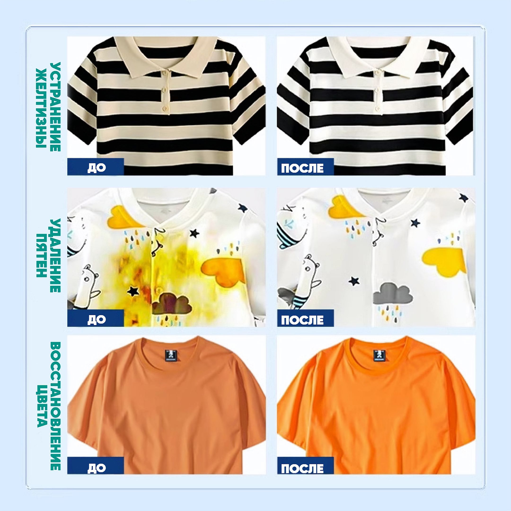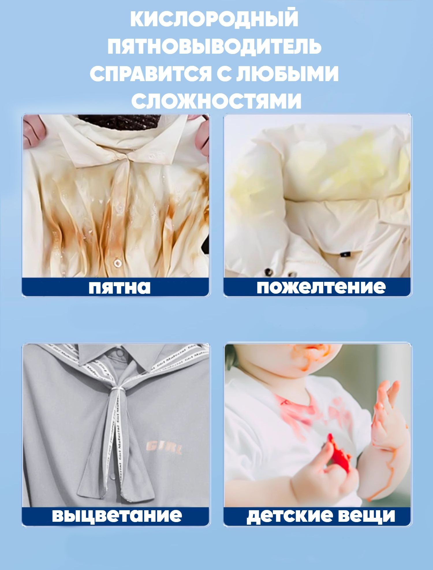Описание: Устали застирывать пятна?Кислородный отбеливатель и пятновыводитель1. Подходит для хлопка, полиэстера, синтетических волокон и других материалов.