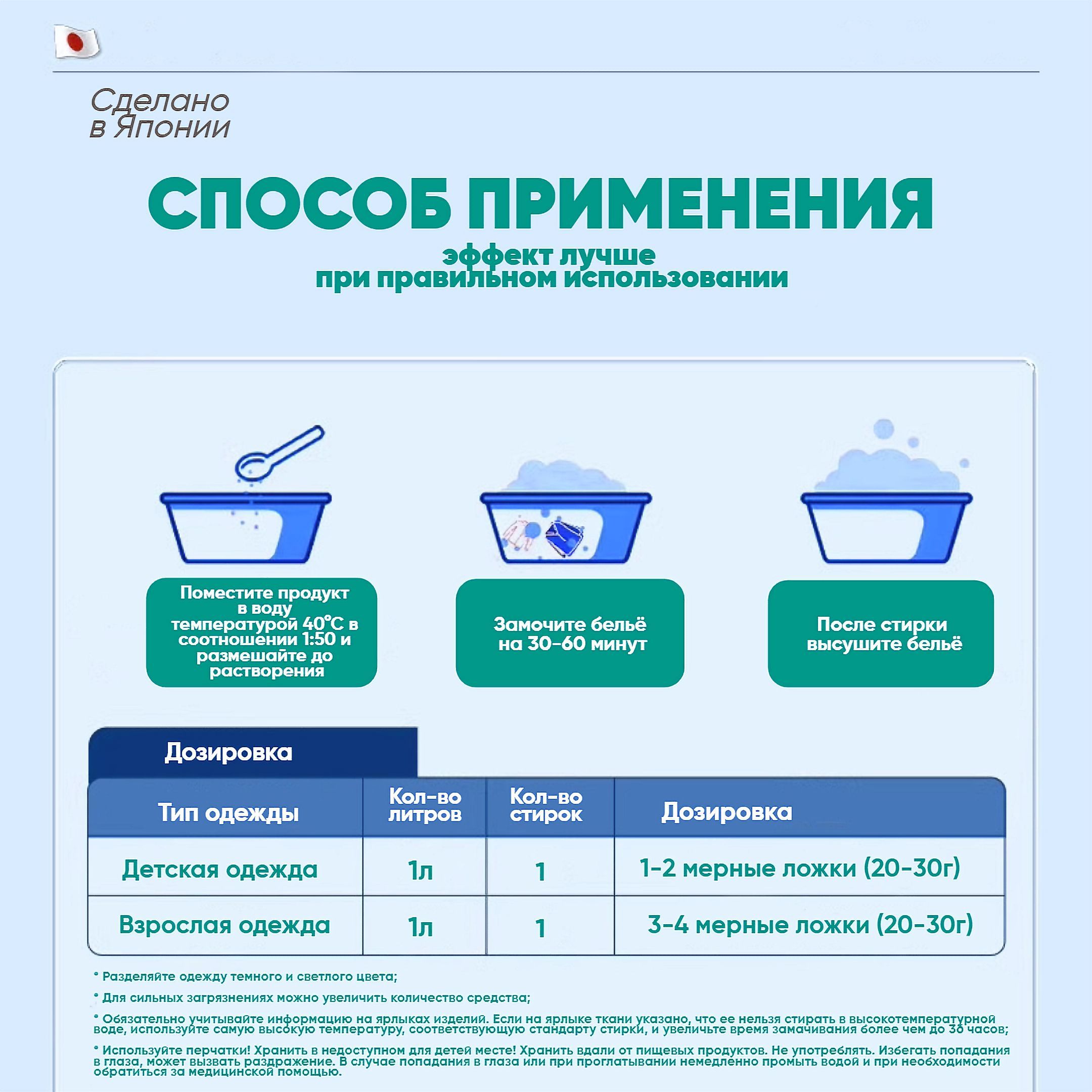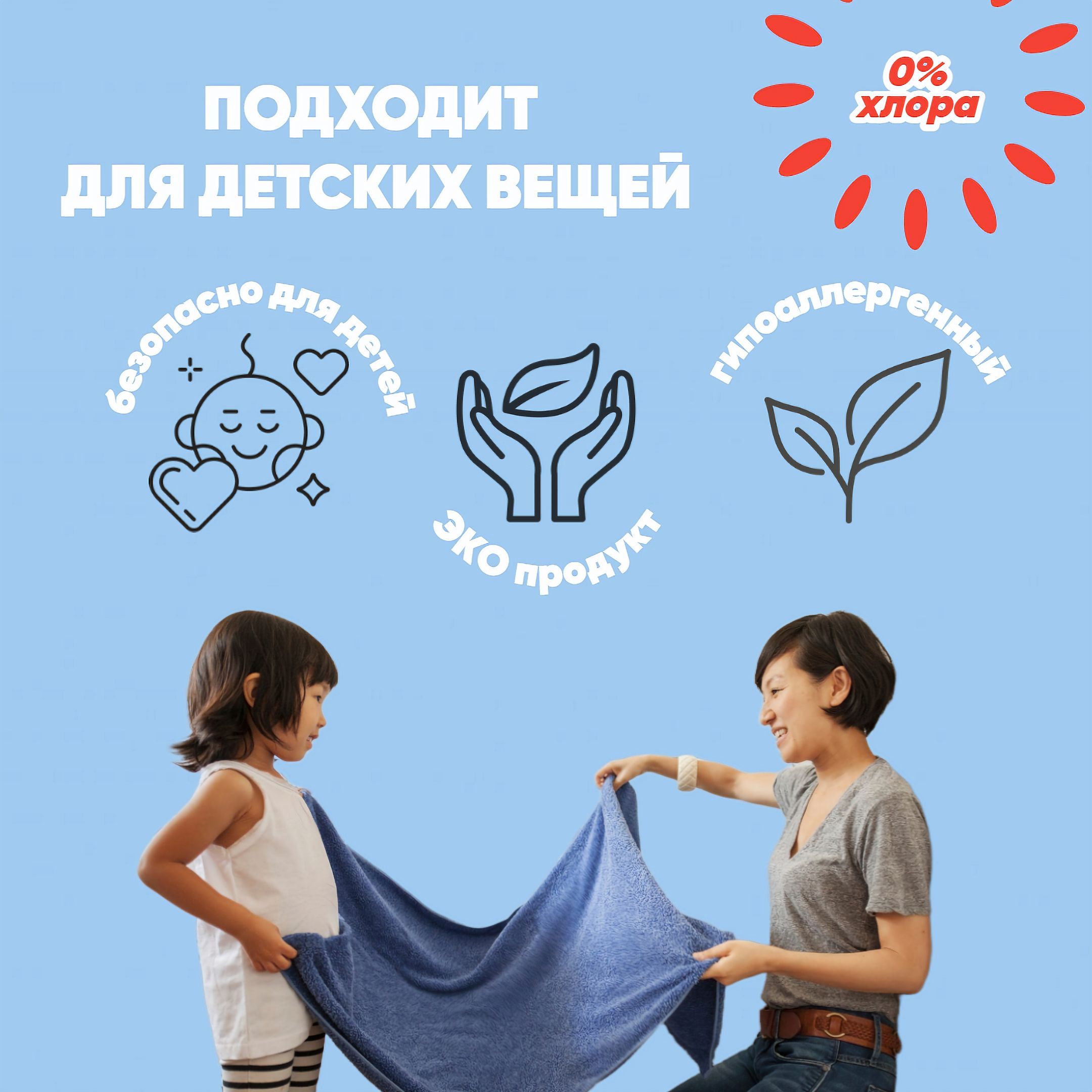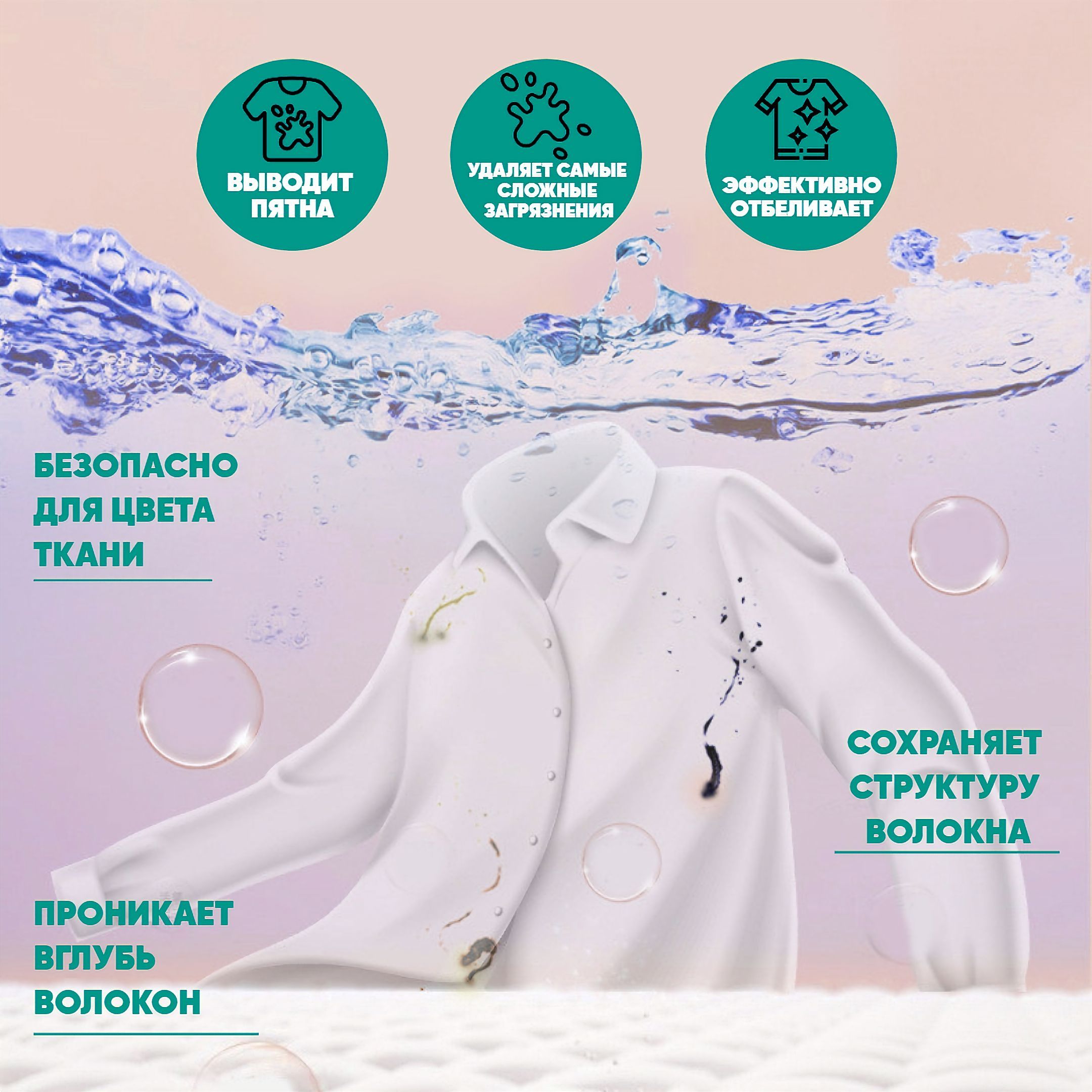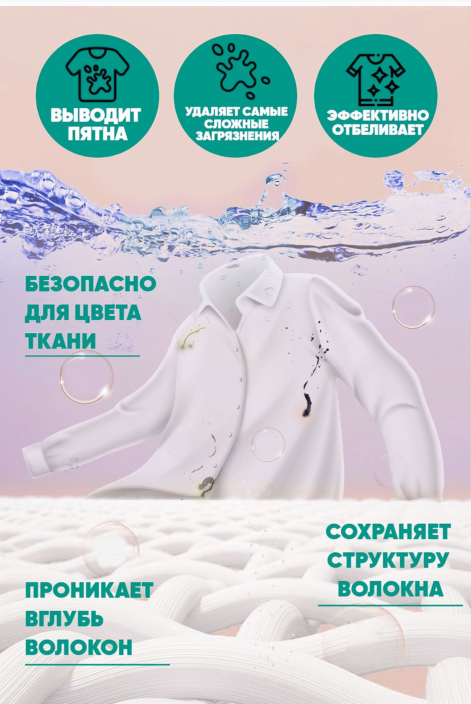 3. Обладает отбеливающими и пятновыводящими свойствами. Подходит для стирки белья и выведения пятен на белых и цветных тканях. Также подходит для замачивания и стирки детских вещей.