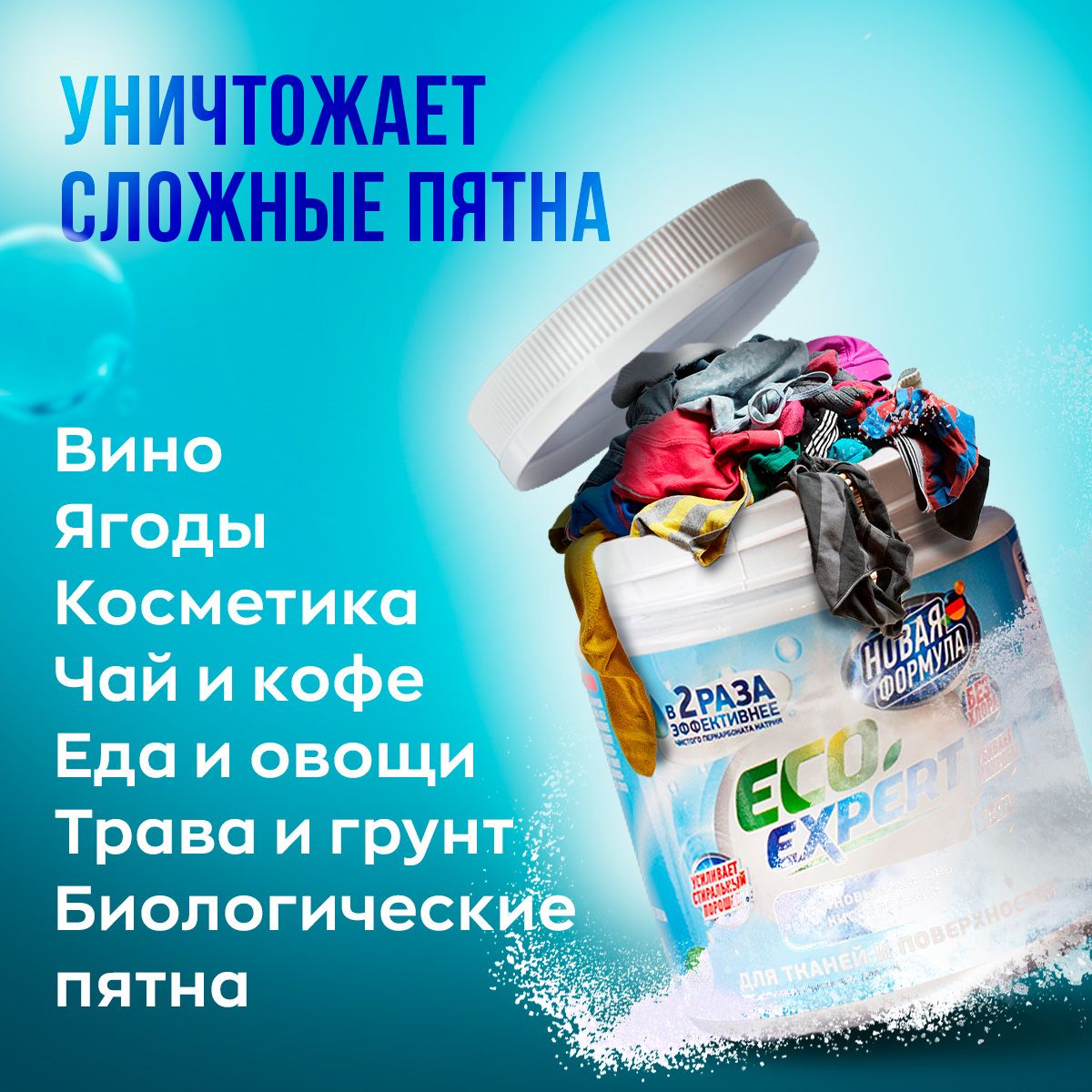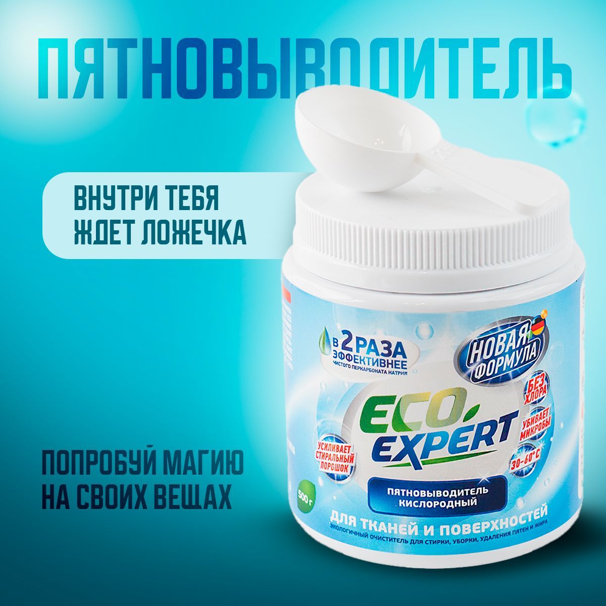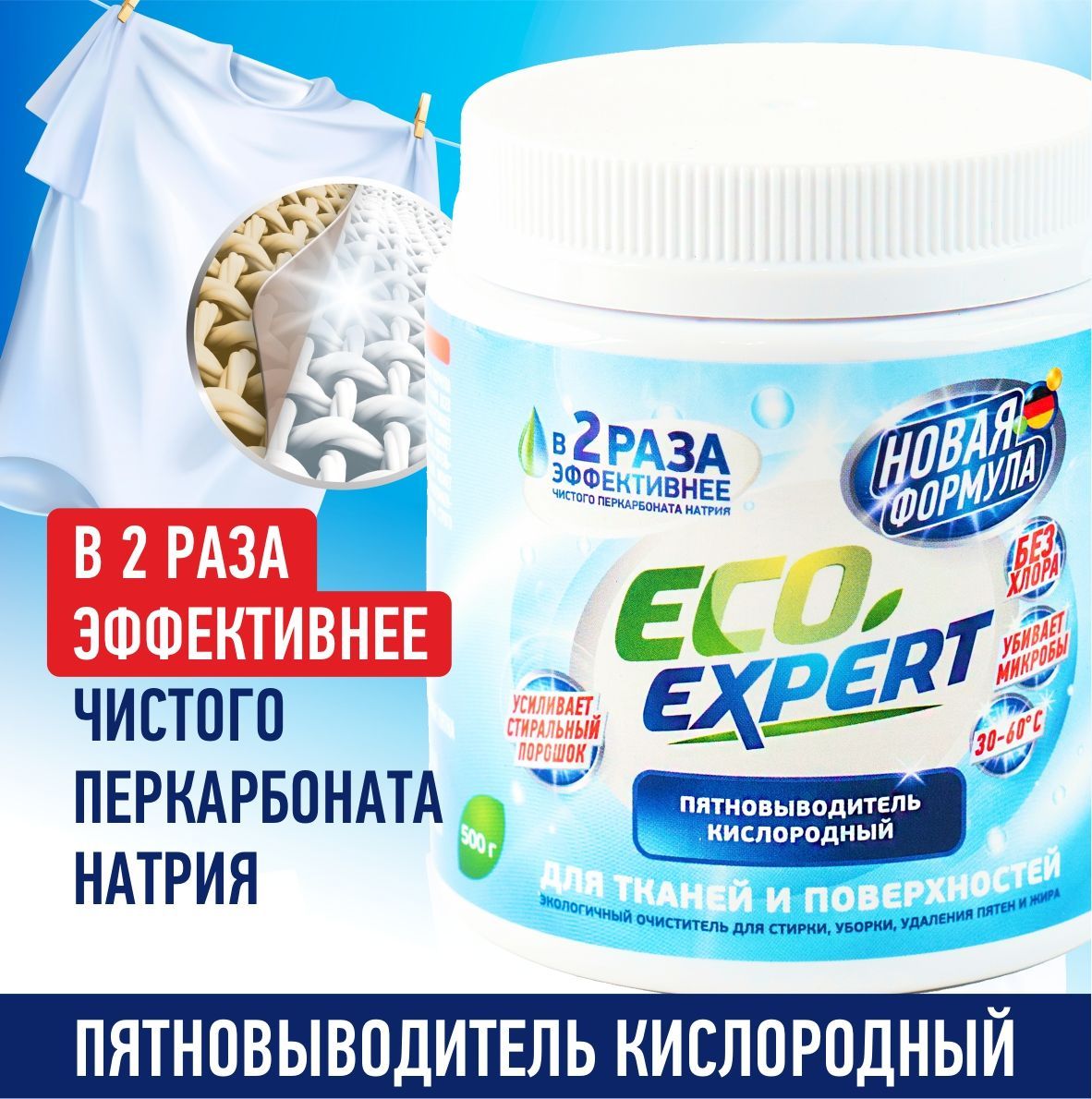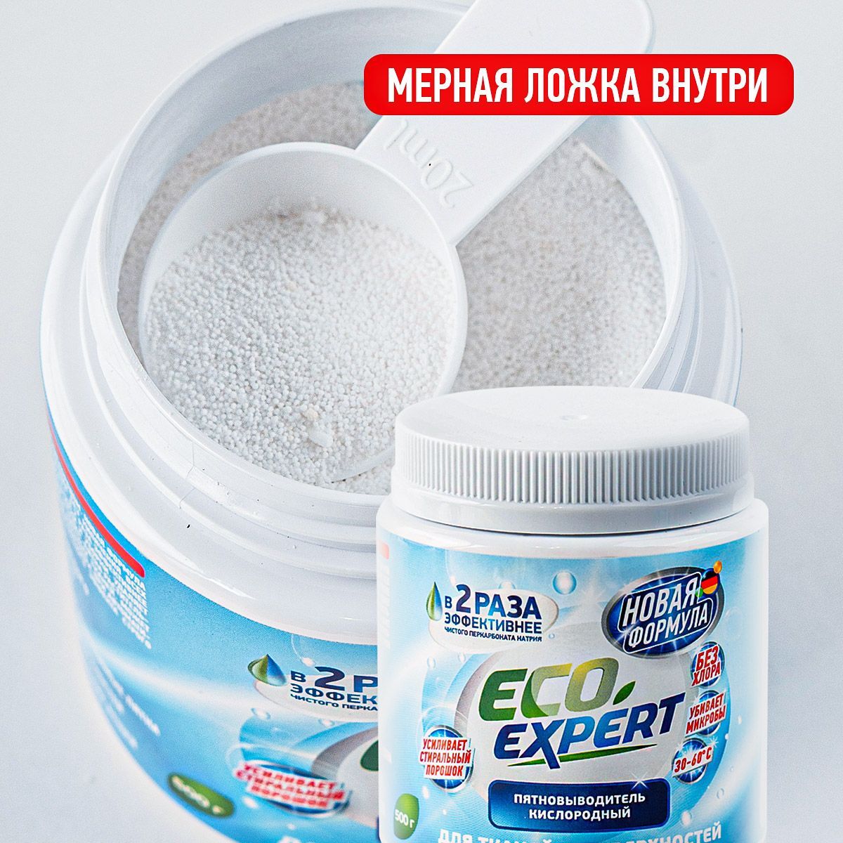 При взаимодействии кислородного отбеливателя с водой происходит химическая реакция, в ходе которой выделяется кислород. Пузырьки кислорода эффективно растворяют застаревшие пятна и выталкивают их наружу, остаётся лишь немного потереть поверхность.БИОРАЗЛАГАЕМЫЙ СОСТАВ - БЕЗОПАСНОЕ СРЕДСТВО ДЛЯ ВСЕГОВ СОСТАВЕ ТОЛЬКО ЭКОЛОГИЧНЫЕ КОМПОНЕНТЫ. Усилитель стирального порошка Кислородный пятновыводитель Eco Expert усилит действие вашего стирального порошка. Необходимо добавить одну мерную ложку в отсек вместе с порошком, или развести в небольшом количестве горячей воде, после активации пятновыводителя, добавить к вещам в стиральной машине. Пятновыводитель в надежной упаковкеУдобная пластиковая банка с крышкой займет не много места. Такая упаковка надежней в перевозке и минимизирует повреждение при транспортировке. Порошок в банке удобно хранить на полке в шкафу, не рассыпется при открытии. Внутри баночки мы положили мерную ложку для удобства использования порошка. Универсальный пятновыводитель станет надежным помощником и средством для всего в доме. ОЧИСТИТЕЛЬ ВСЕГО В ДОМЕ - 100 РЕШЕНИЙ!Примените порошок Eco Expert не только для стирки и выведения пятен, но и для чистки поверхностей. Одно средство для решения вопроса чистоты во всем доме. Подходит для белого и цветного бельяПятновыводитель эффективен для белого и цветного белья, бережно выводит пятна, сохраняет целостность и цвет ткани.
