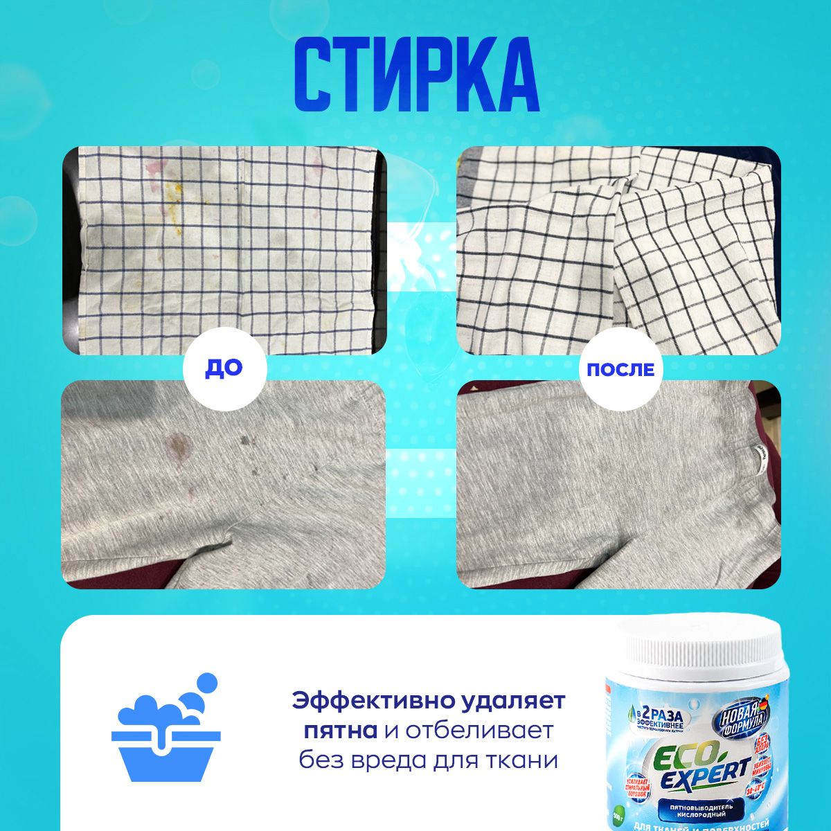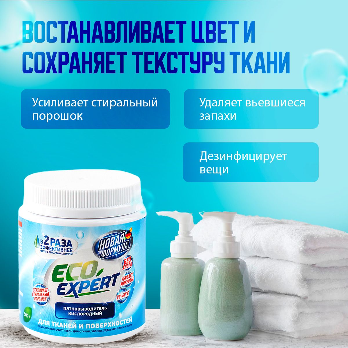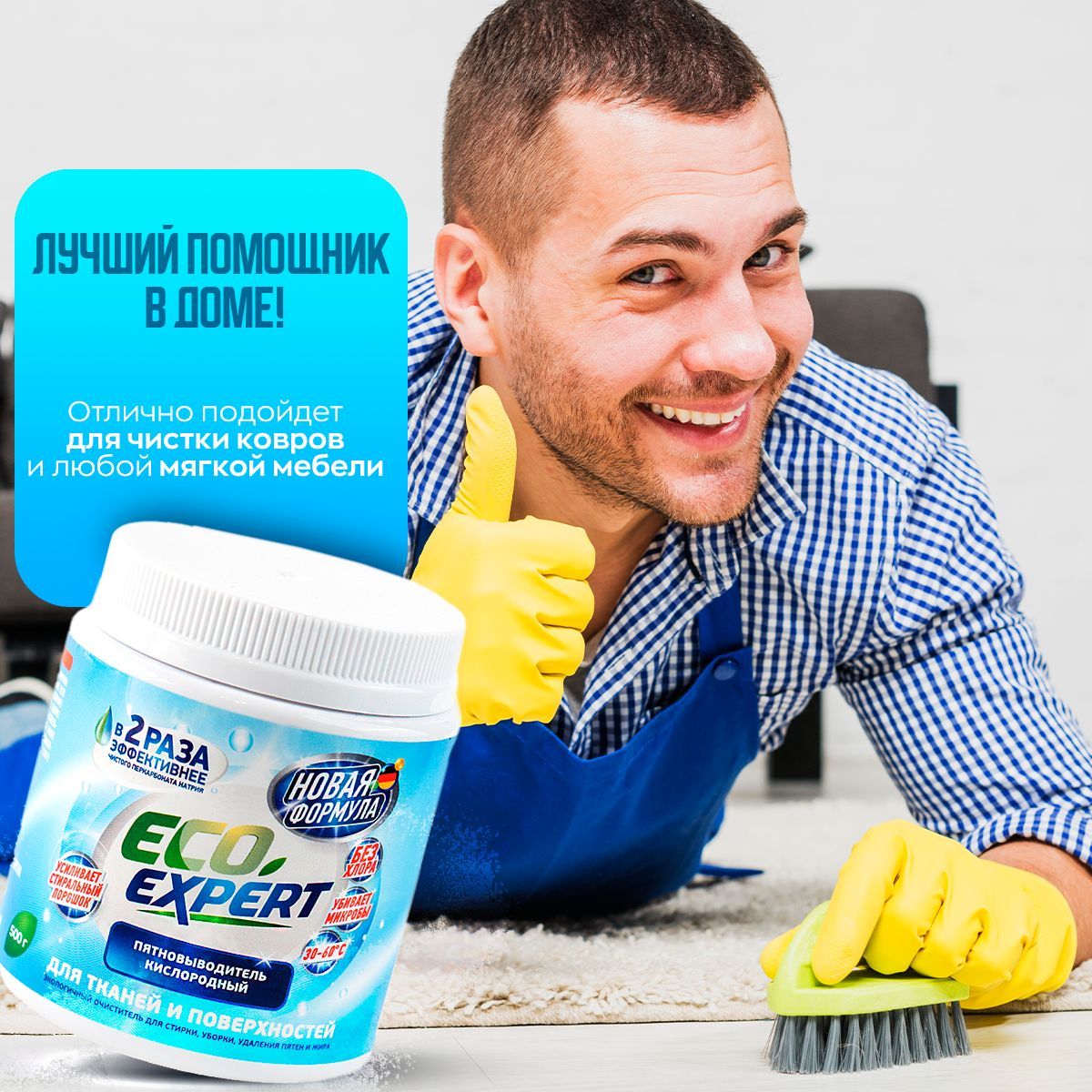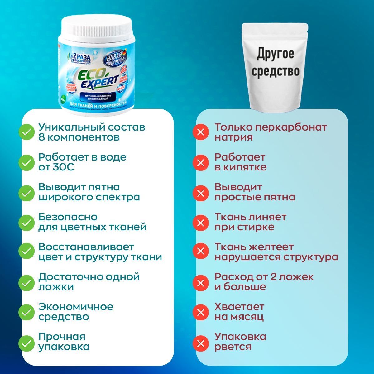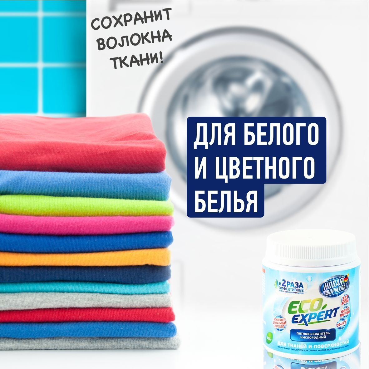 При взаимодействии кислородного отбеливателя с водой происходит химическая реакция, в ходе которой выделяется кислород. Пузырьки кислорода эффективно растворяют застаревшие пятна и выталкивают их наружу, остаётся лишь немного потереть поверхность.БИОРАЗЛАГАЕМЫЙ СОСТАВ - БЕЗОПАСНОЕ СРЕДСТВО ДЛЯ ВСЕГОВ СОСТАВЕ ТОЛЬКО ЭКОЛОГИЧНЫЕ КОМПОНЕНТЫ. Усилитель стирального порошка Кислородный пятновыводитель Eco Expert усилит действие вашего стирального порошка. Необходимо добавить одну мерную ложку в отсек вместе с порошком, или развести в небольшом количестве горячей воде, после активации пятновыводителя, добавить к вещам в стиральной машине. Пятновыводитель в надежной упаковкеУдобная пластиковая банка с крышкой займет не много места. Такая упаковка надежней в перевозке и минимизирует повреждение при транспортировке. Порошок в банке удобно хранить на полке в шкафу, не рассыпется при открытии. Внутри баночки мы положили мерную ложку для удобства использования порошка. Универсальный пятновыводитель станет надежным помощником и средством для всего в доме. ОЧИСТИТЕЛЬ ВСЕГО В ДОМЕ - 100 РЕШЕНИЙ!Примените порошок Eco Expert не только для стирки и выведения пятен, но и для чистки поверхностей. Одно средство для решения вопроса чистоты во всем доме. Подходит для белого и цветного бельяПятновыводитель эффективен для белого и цветного белья, бережно выводит пятна, сохраняет целостность и цвет ткани.