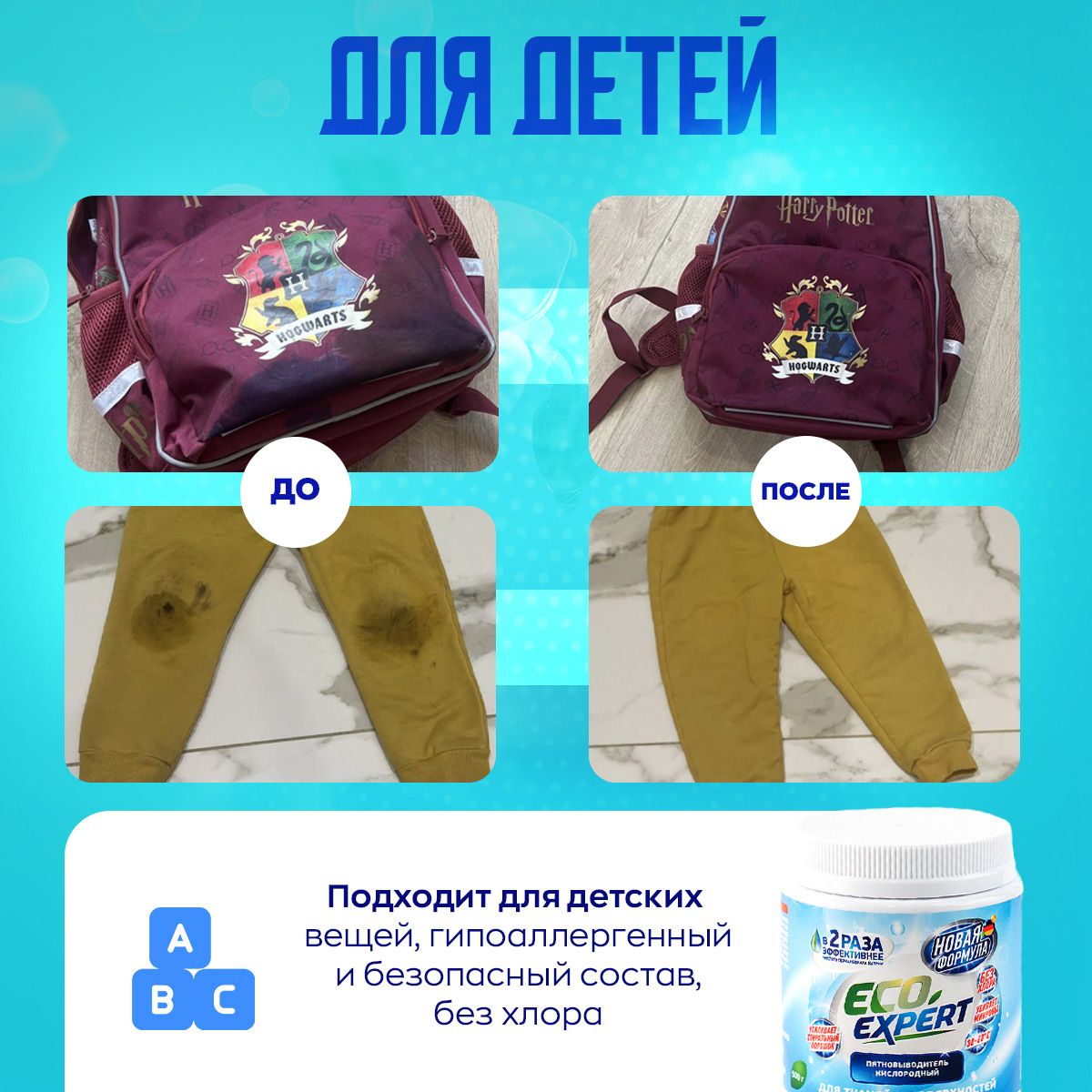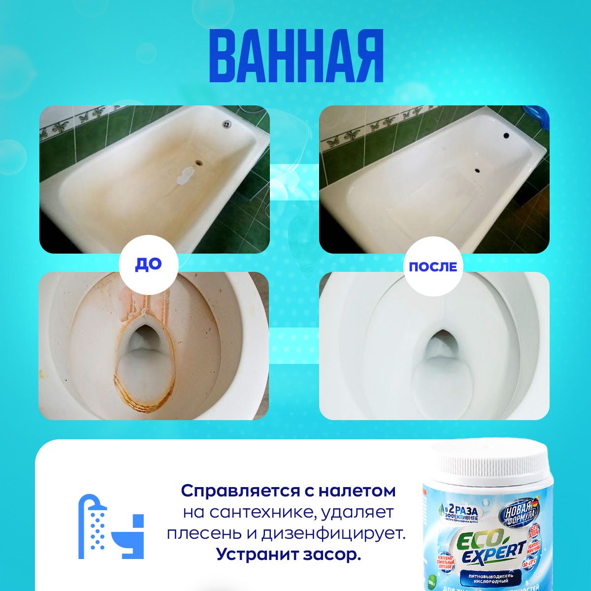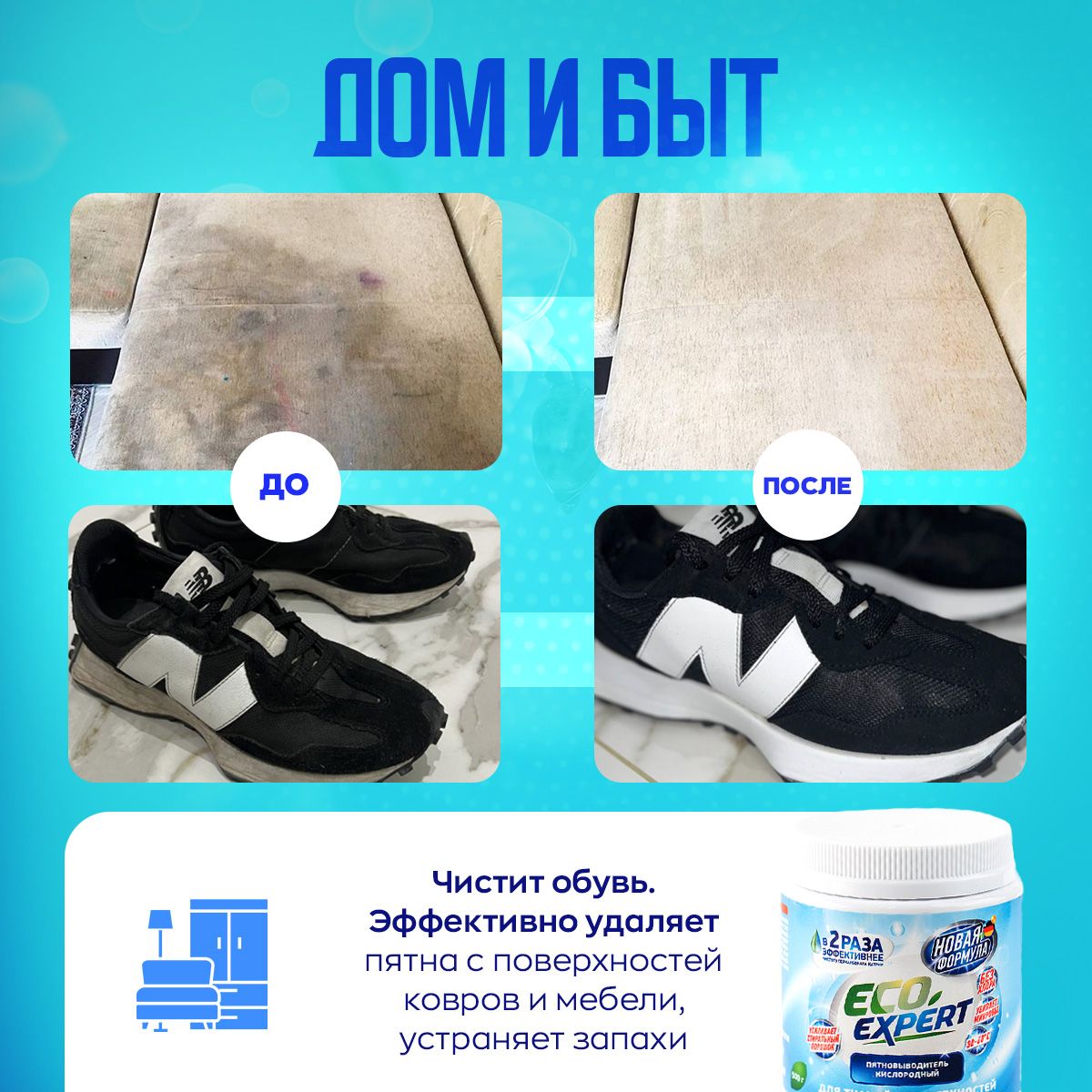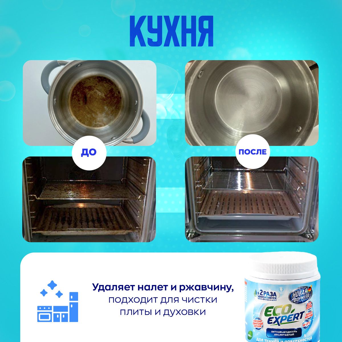 Обязательно следуйте инструкции и учитывайте рекомендацию на ярлычках вашей одежды. Для поверхностей в домеОчиститель подходит для чистки поверхностей на кухне и в ванной. Отлично справится с сантехникой, санфаянсом, кафелем и прочими поверхностями. При этом окажет дезинфицирующее действие и устранит посторонний запах. Чистая посуда на вашей кухнеПодходит для столовых приборов, тарелок, кастрюль и сковородок, а также очистит плиту и духовку. Необходимо замочить в горячей воде с добавлением кислородного пятновыводителя Eco Expert.