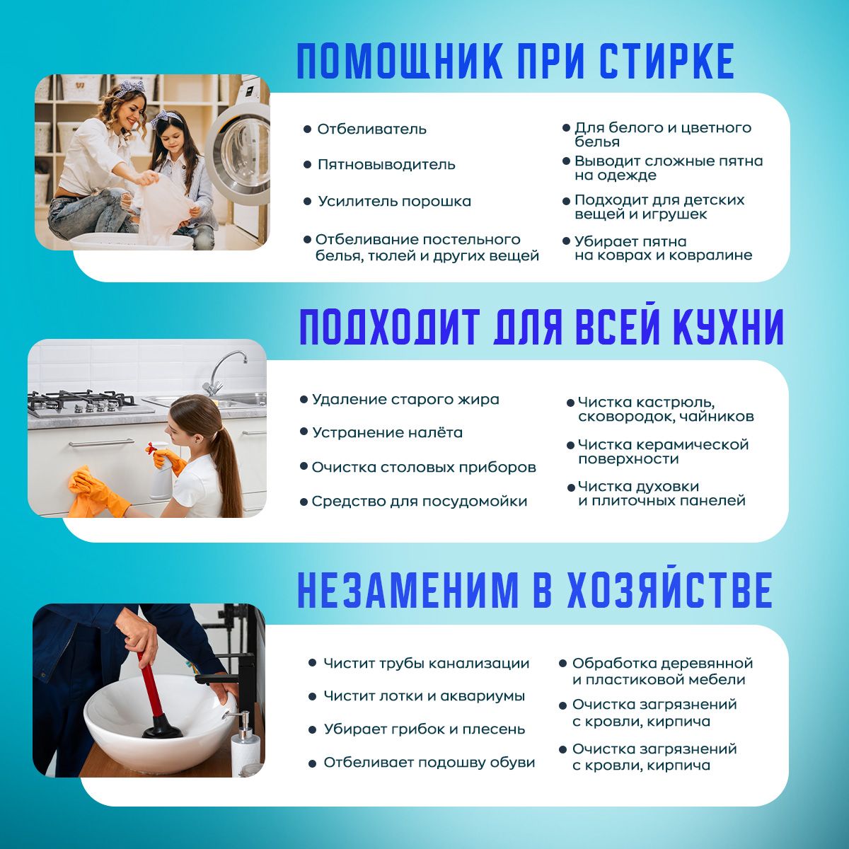 Особенности применения: Антибактериальный эффект, Отбеливание, Экосредство, Эффективен в холодной воде