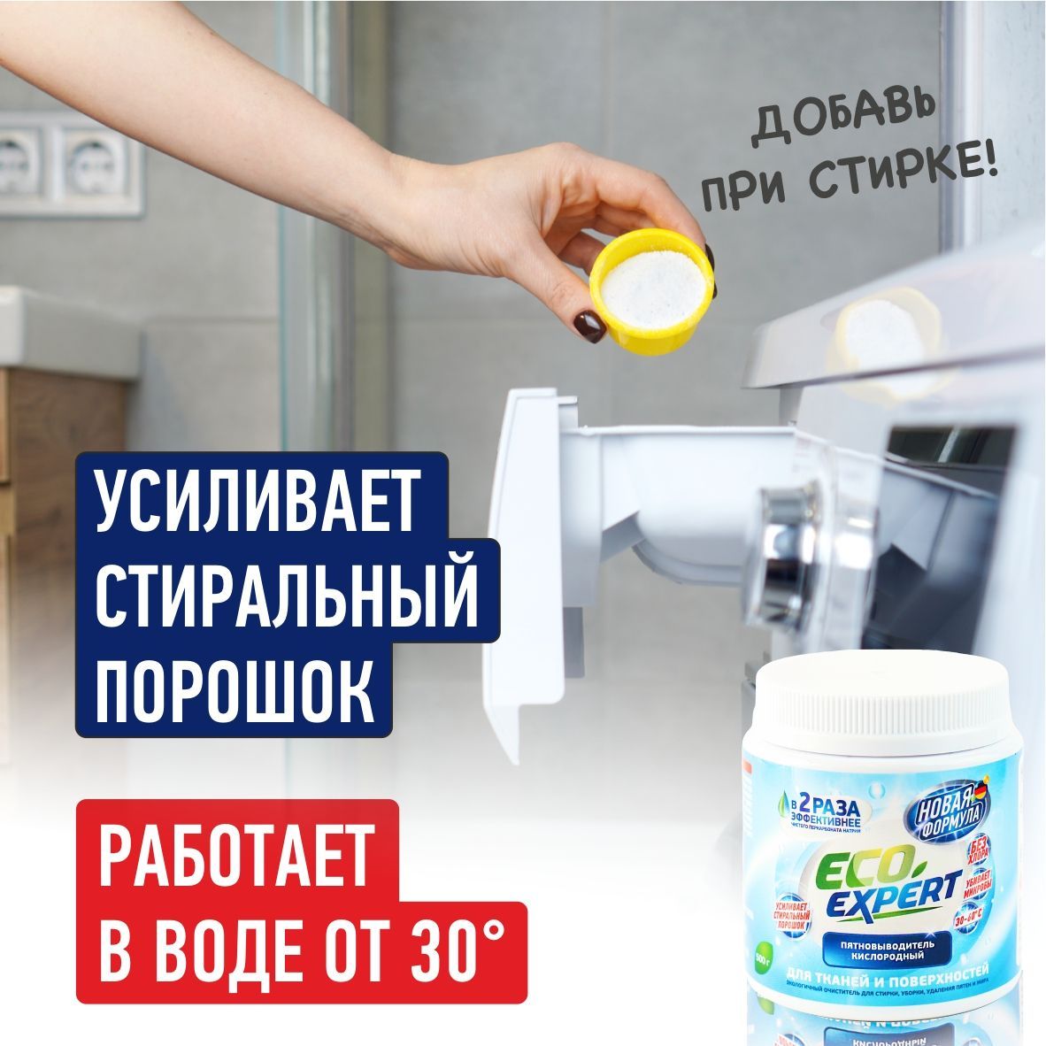 Большинство пятновыводителей имеют в составе 100% чистый перкарбонат натрия, который к сожалению не справляется с застарелыми и трудновыводимыми пятнами. Мы усилили действия перкарбоната натрия за счет дополнительных компонентов, при этом сохранив экологичность и безопасность порошка, без добавления хлора. Отбеливатель без кипяткаЗа счет новой формулы отбеливатель кислородный Eco Expert начинает действовать при температуре в 30 градусов, что позволяет его добавлять при стирке в стиральной машине.