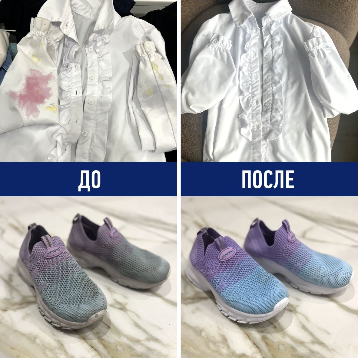 • Не наносить средство в сухом виде на ткань, только после активации в воде.